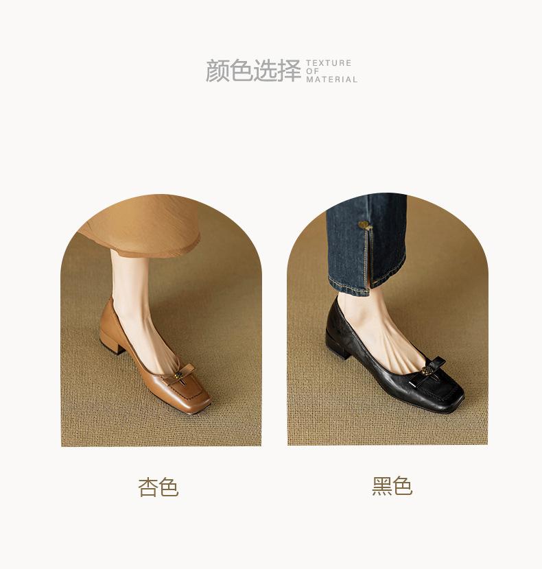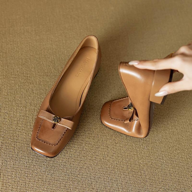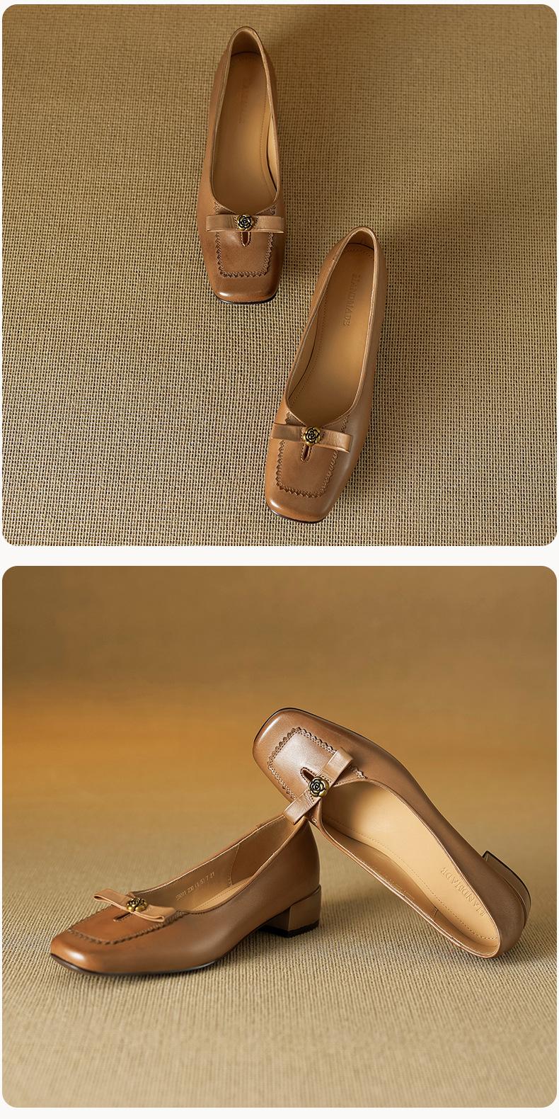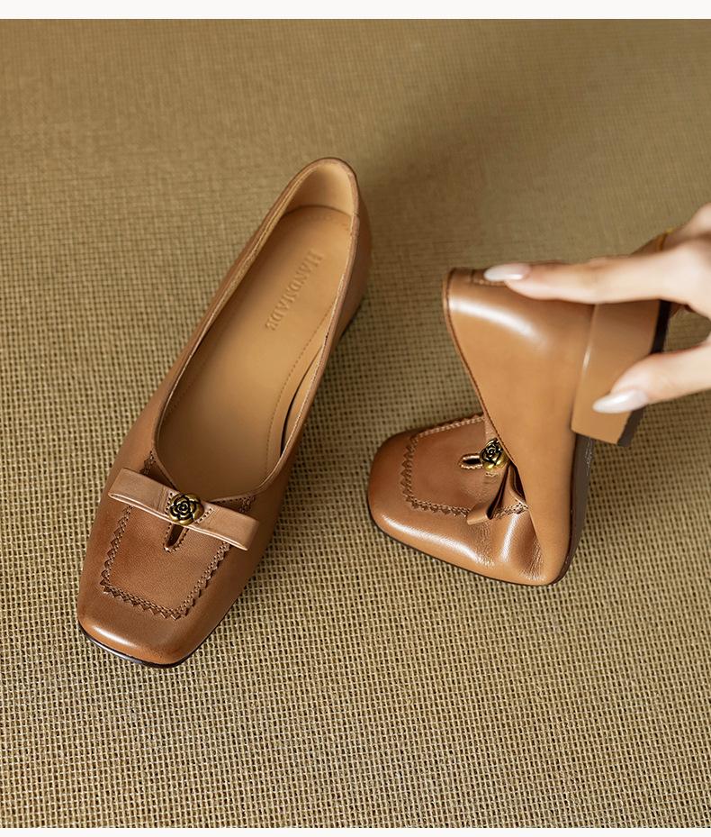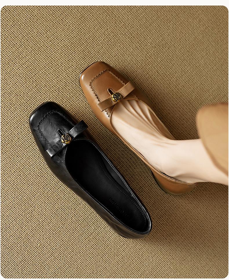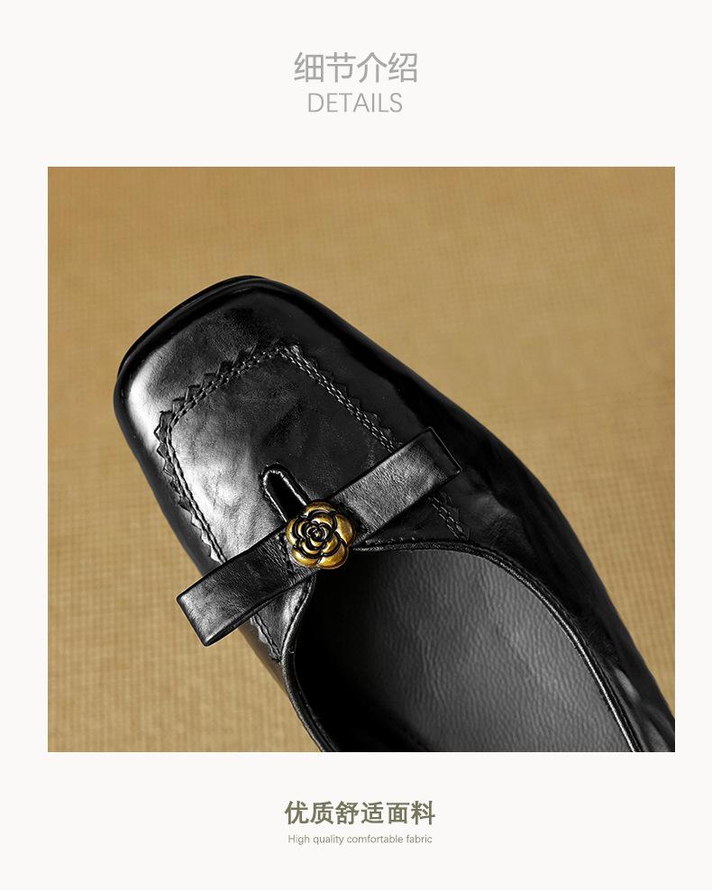 Tacón Grueso de 3cm Estilo Pequeño Fragante Flats de Boca Baja Ropa de Trabajo Versátil 2025 Otoño Nuevo Estilo Cuero Genuino Lazo Camelia Zapatos de Mujer