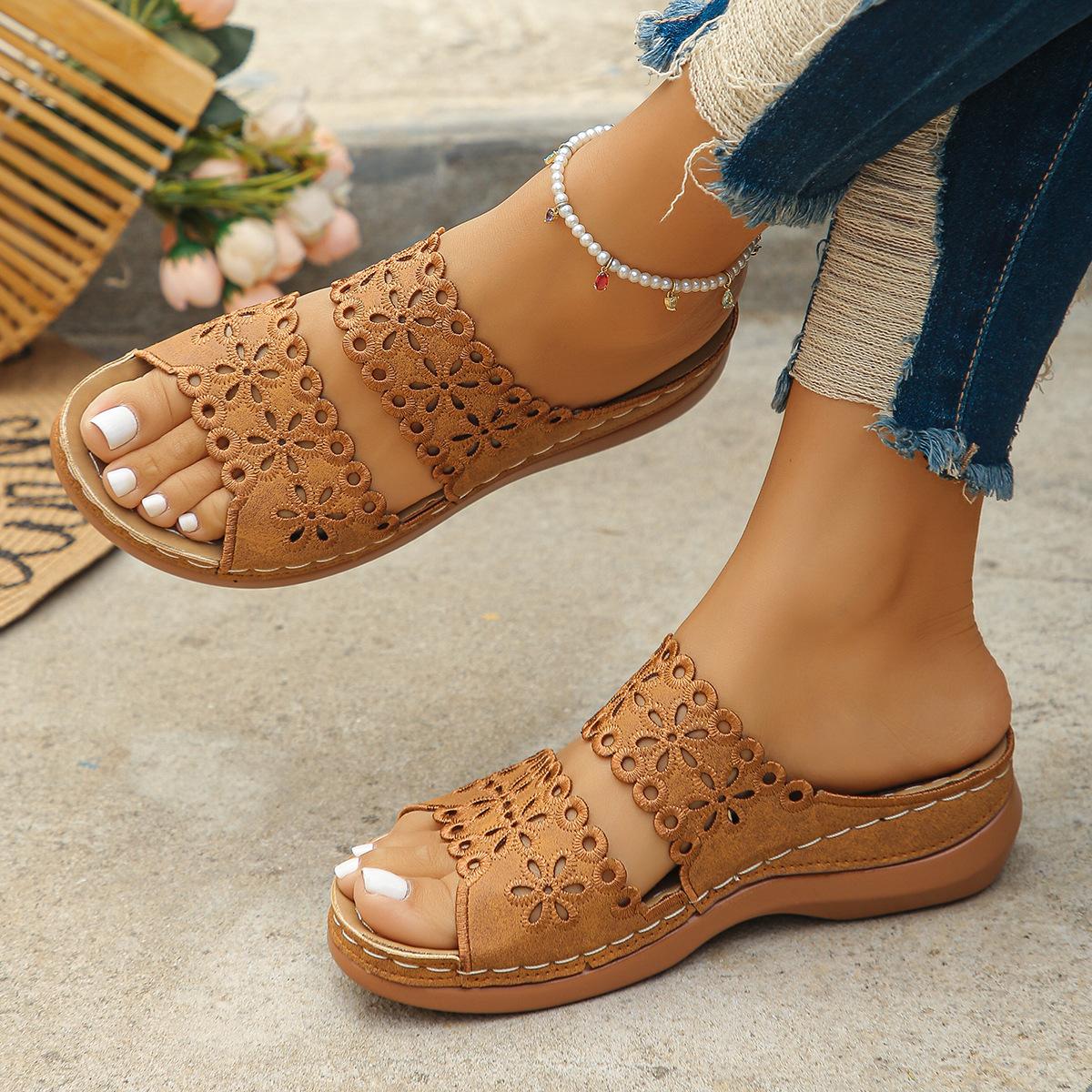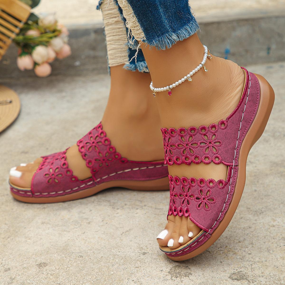 Comercio Exterior Transfronterizo Zapatillas de Flores Huecas de Fondo Plano de Talla Grande Europeas y Americanas Zapatos Casuales para Mujer Sandalias de Flores Retro