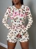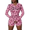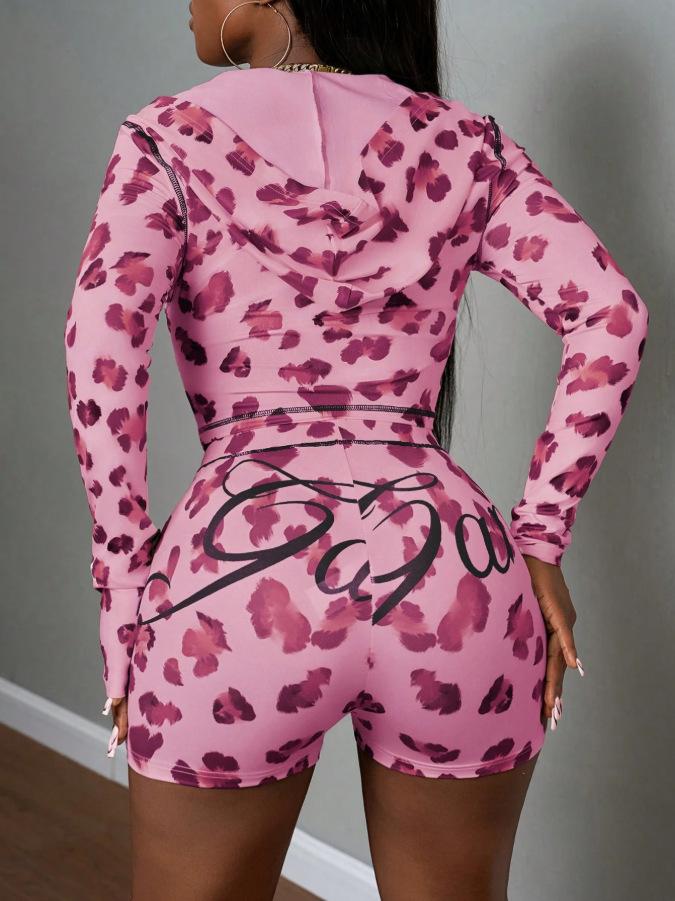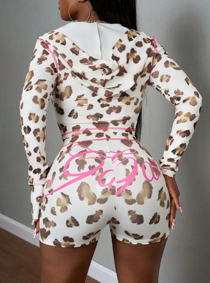 Traje de Moda Estilo Europeo y Americano Transfronterizo Estampado de Leopardo Sexy Chica Caliente Slim Top con Capucha y Cremallera Shorts de Cintura Alta Traje para Mujer