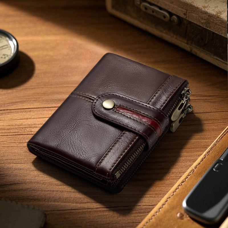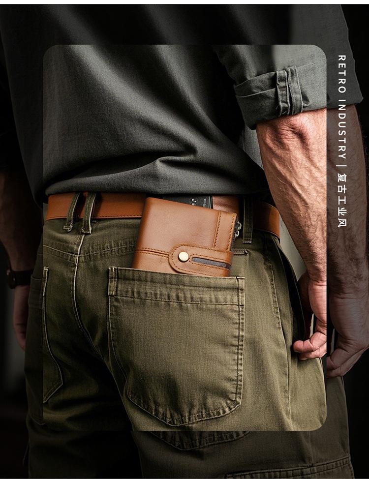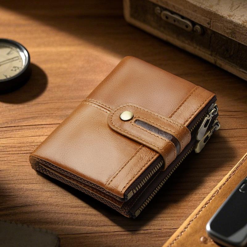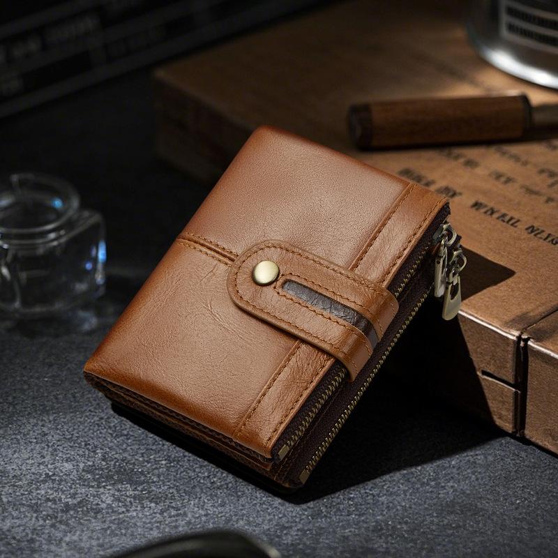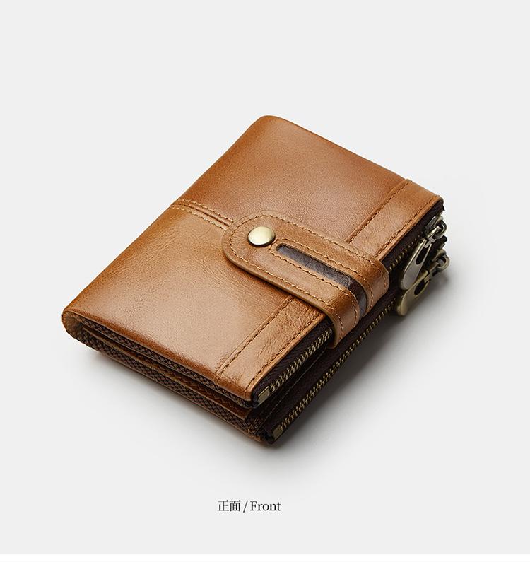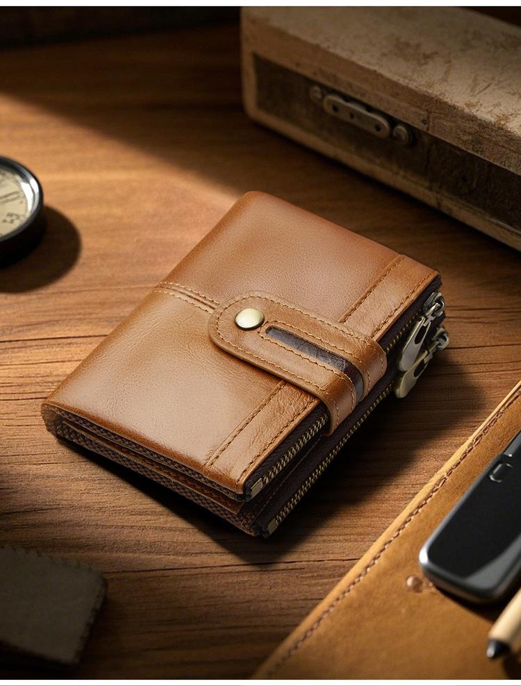 Monedero Corto para Hombre de Cuero Genuino con Cremallera Europeo y Americano Transfronterizo Retro Cuero de Vacuno RFID Antirrobo Billetera Corta