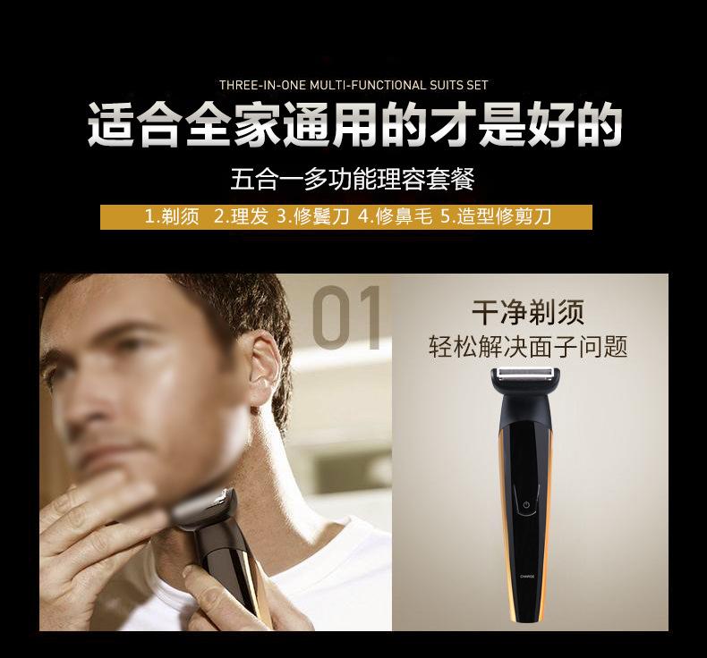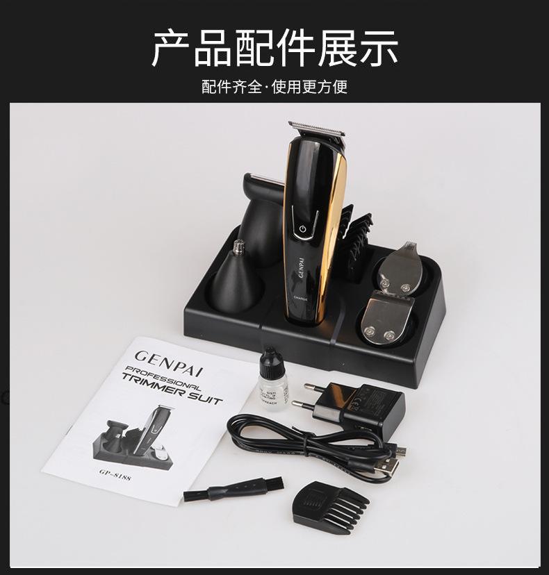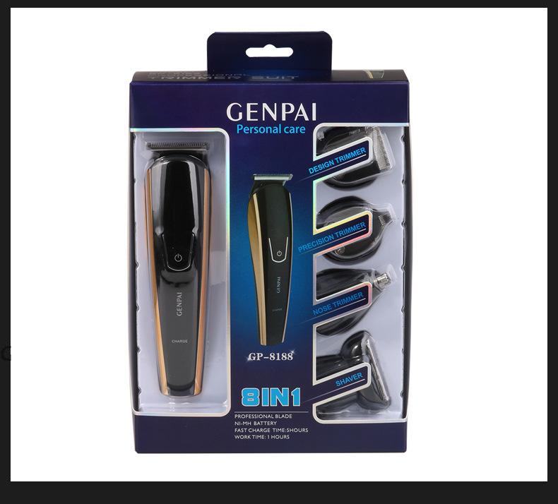 Set de cortapelos 5 en 1 GP-8188 (incluyendo: cortapelos, recortadora corporal, afeitadora, recortadora de vello nasal, cuchilla para esculpir) Dimensiones: 35 mm de ancho, 30 mm de grosor, 160 mm de largo Peso neto: 20.5KGS |