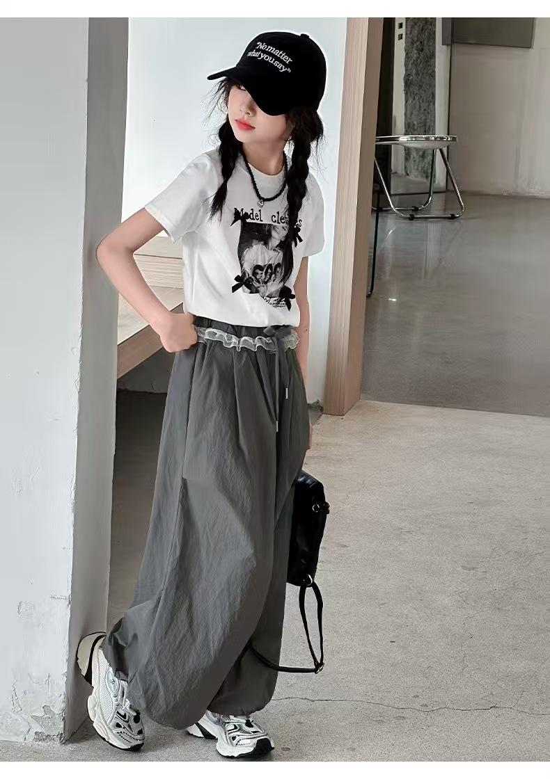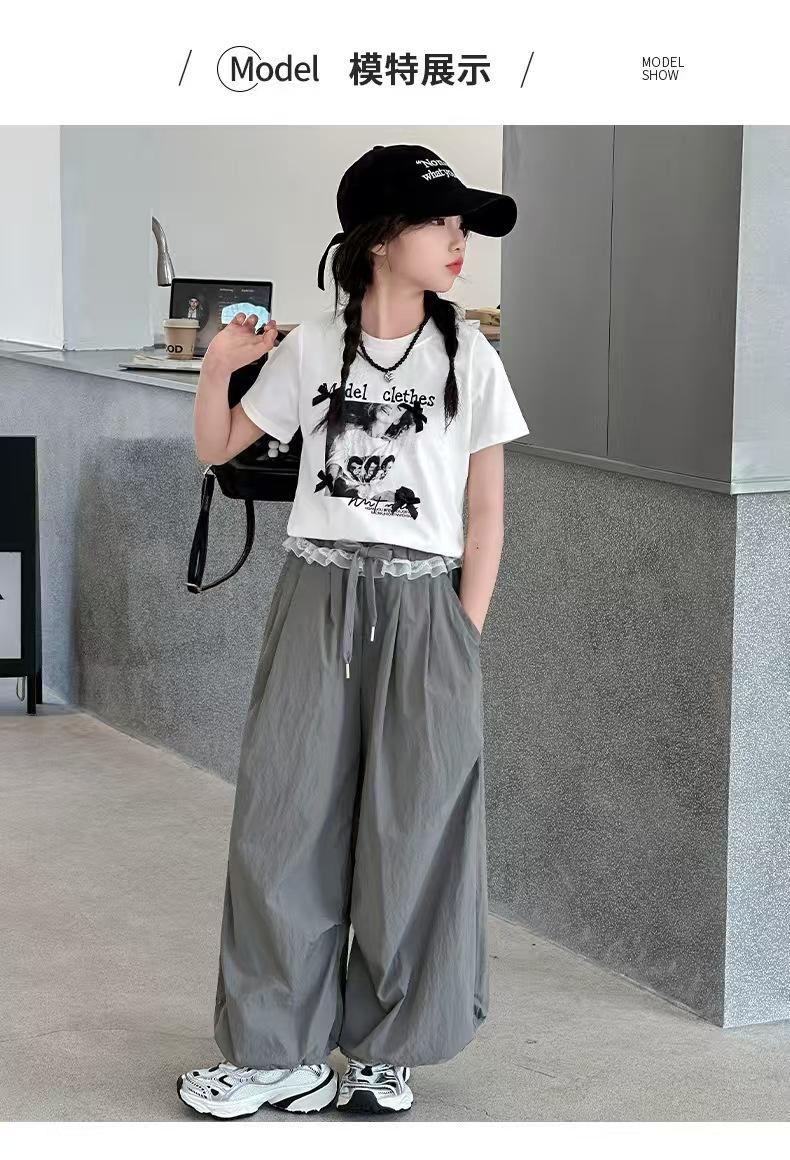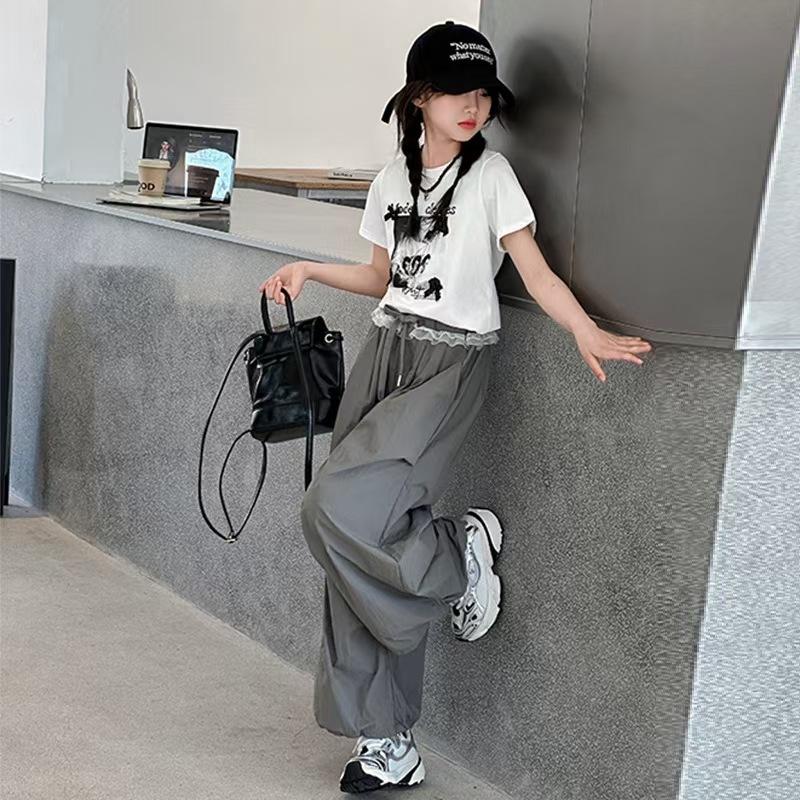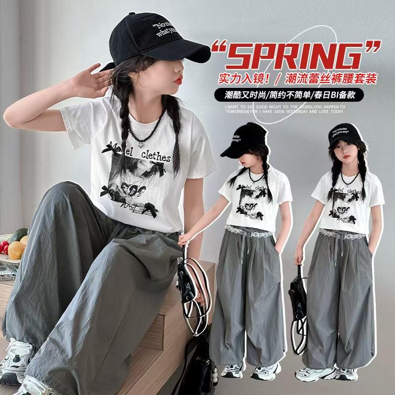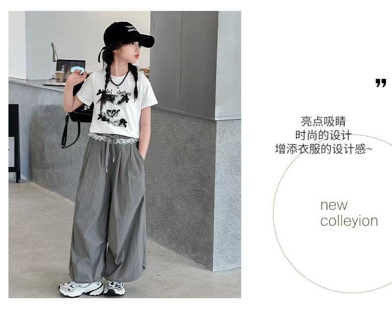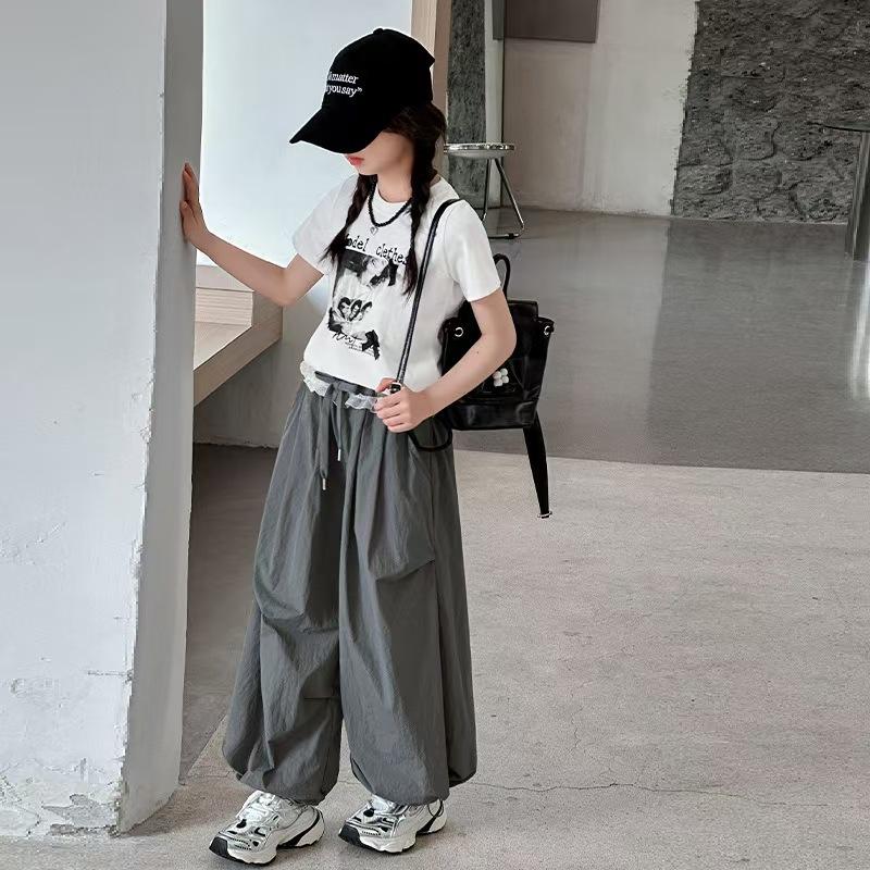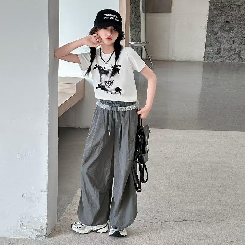 Trajes medianos y grandes para niñas 2025 Verano Nuevo Camisetas casuales de manga corta para niños Pantalones holgados Conjunto de dos piezas con estilo occidental