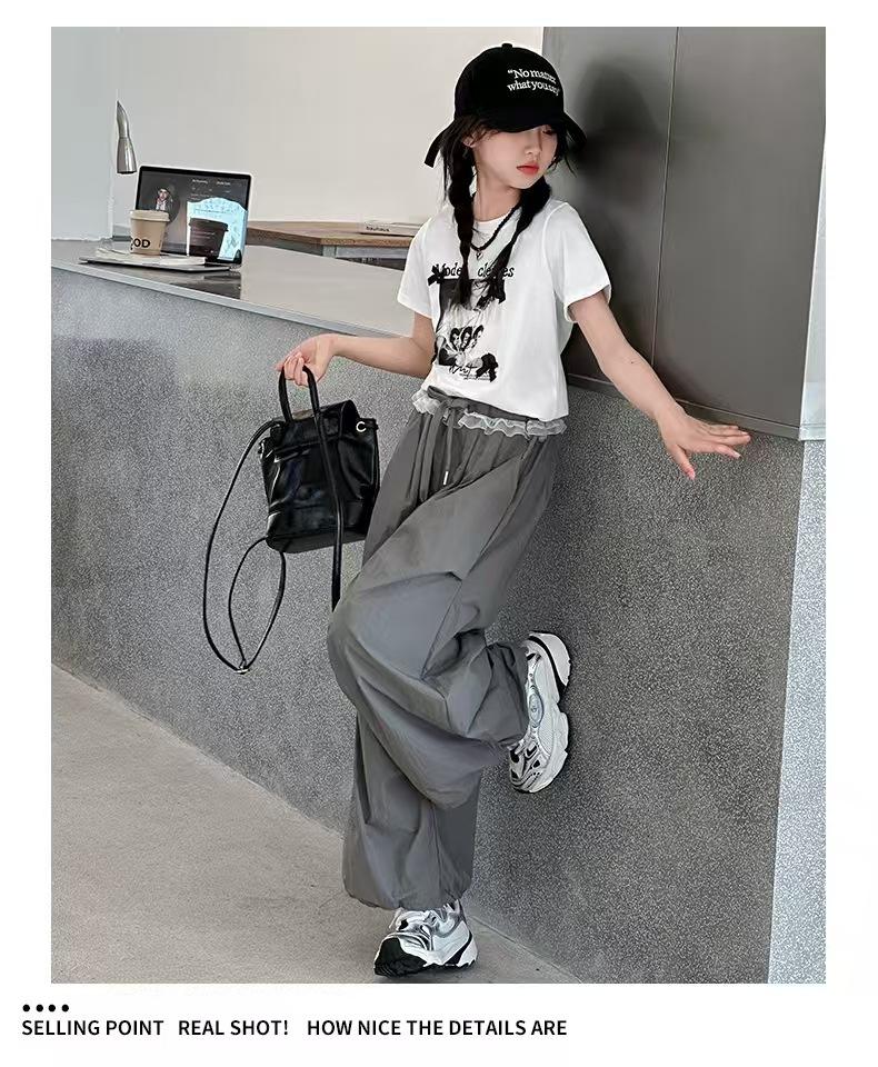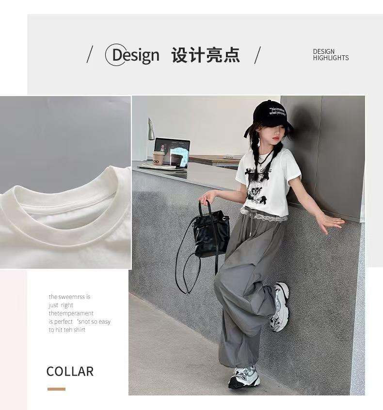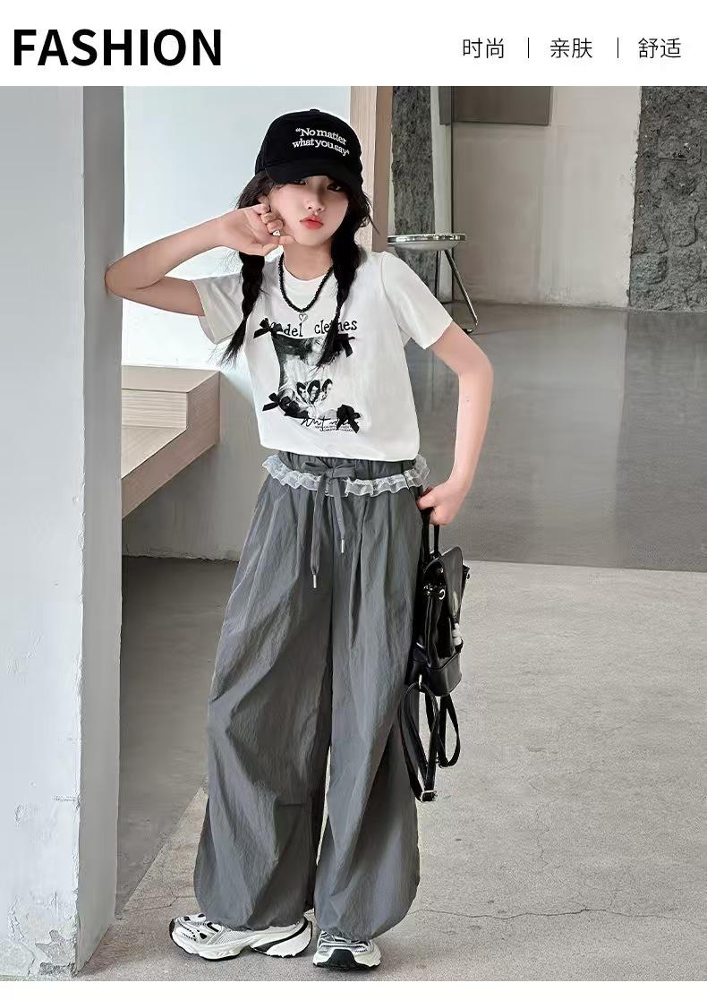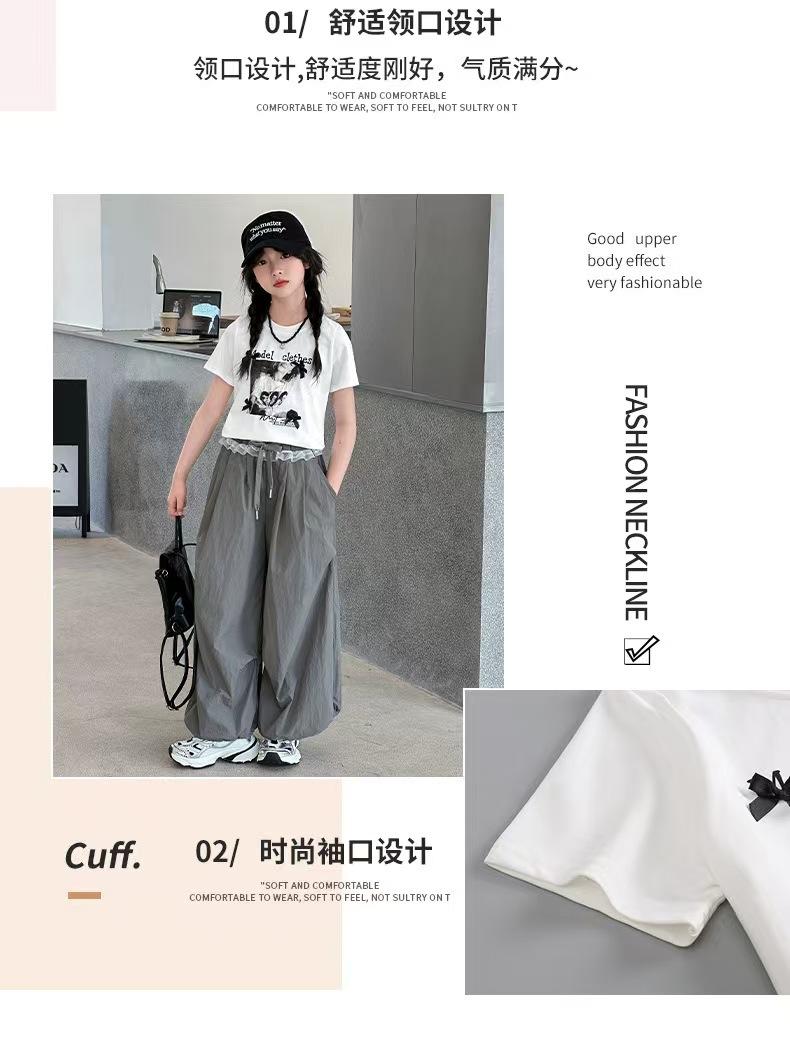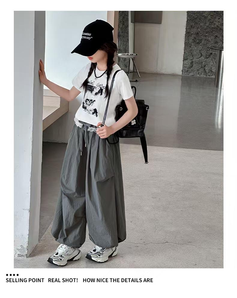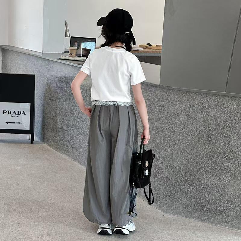 Trajes medianos y grandes para niñas 2025 Verano Nuevo Camisetas casuales de manga corta para niños Pantalones holgados Conjunto de dos piezas con estilo occidental