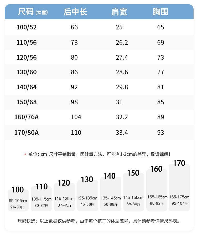 Recommended height for size 100 is 95-105cm, Size 110 recommended height 105-115cm, Size 120 recommended heigh...