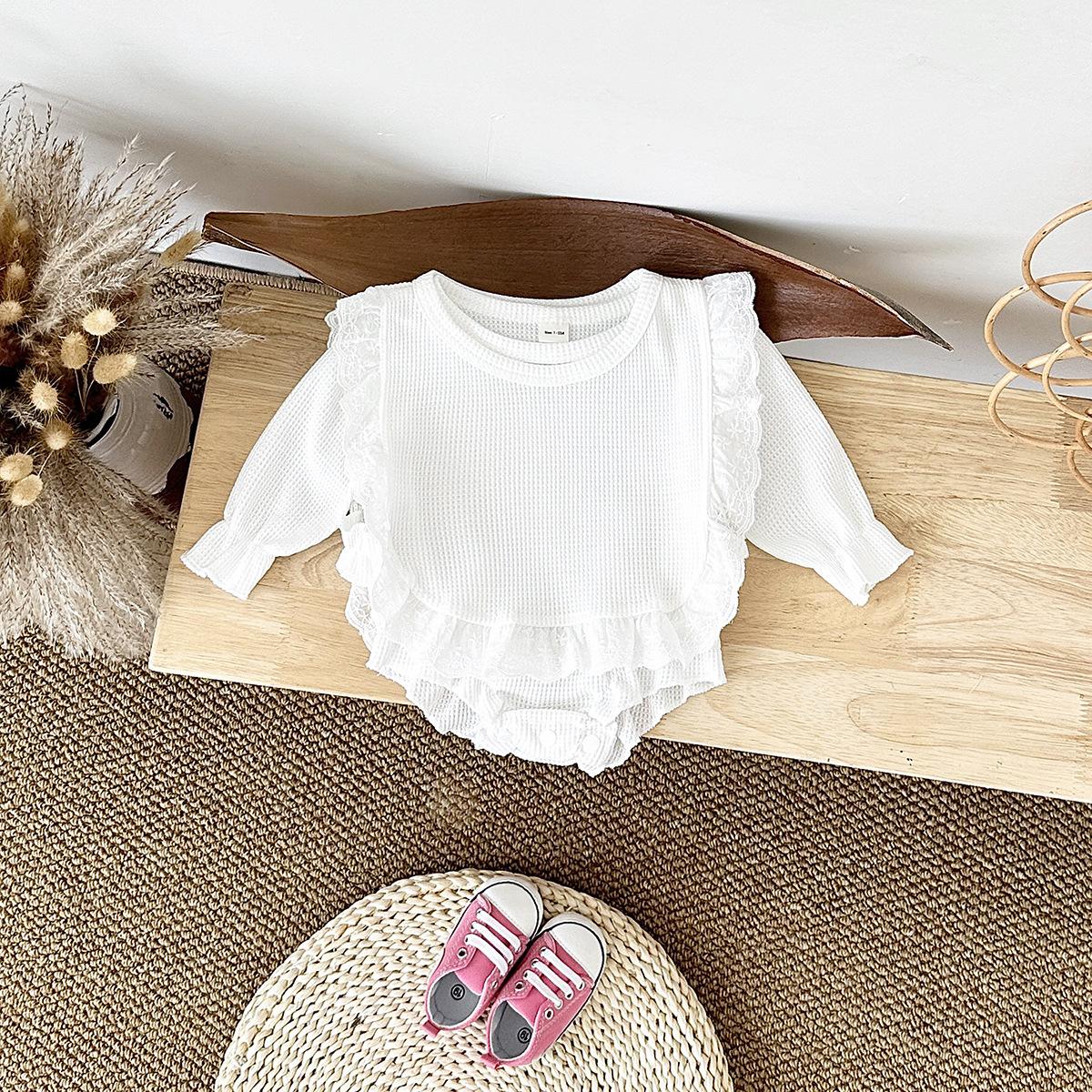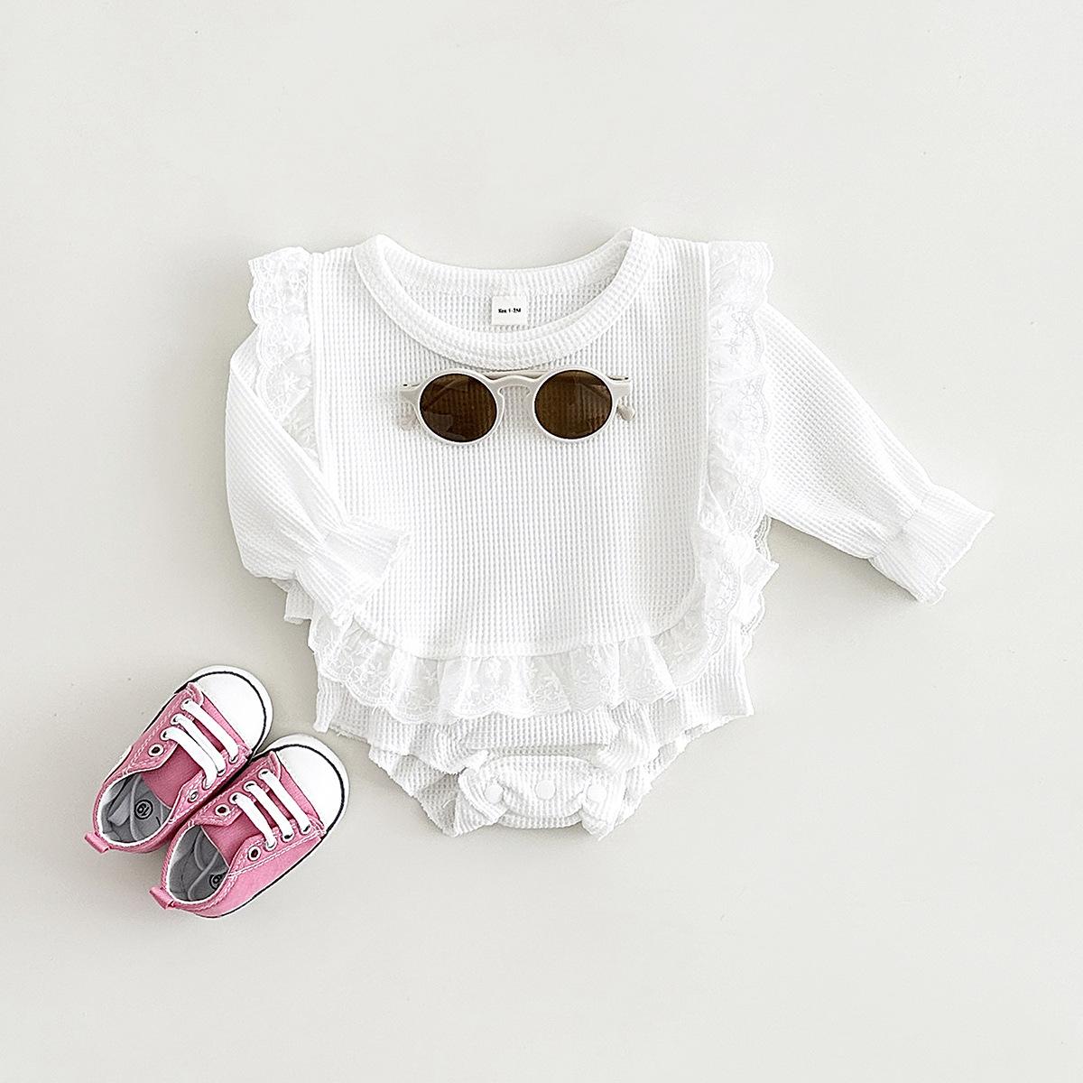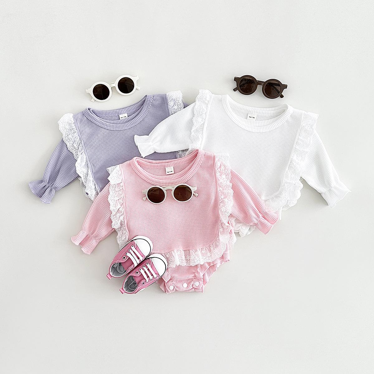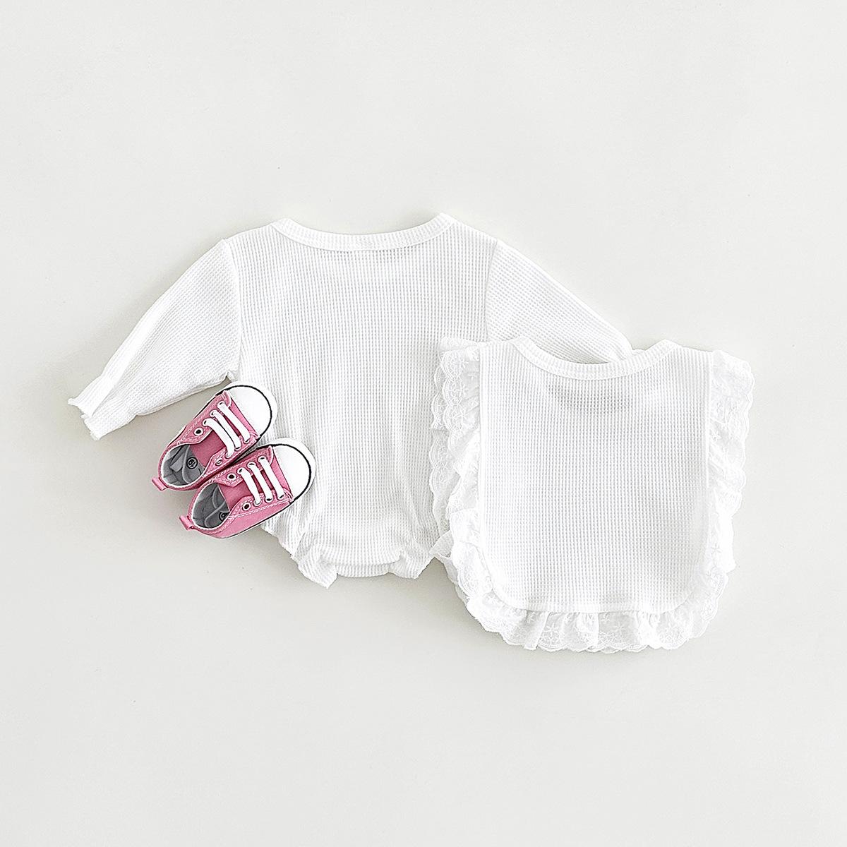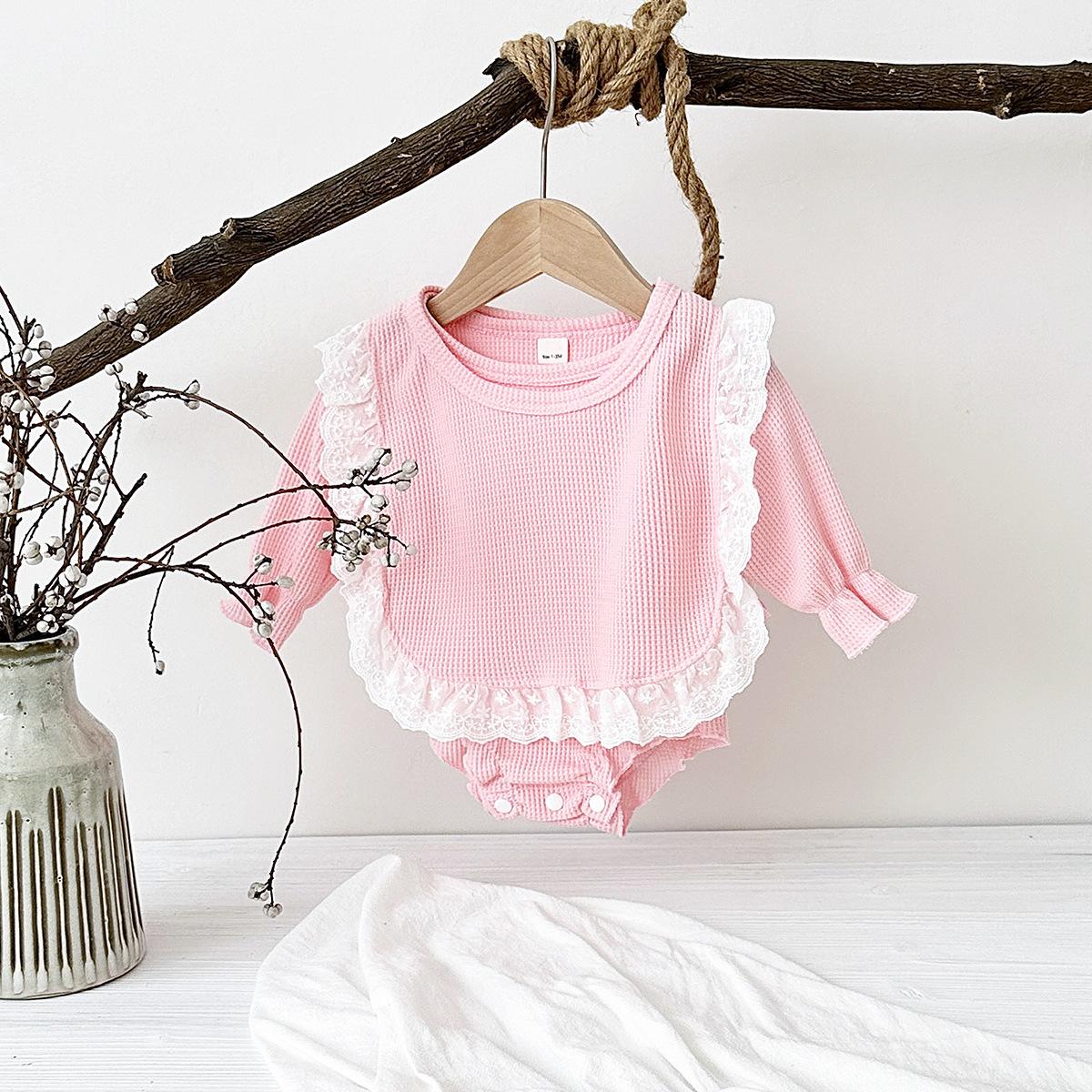 Conjunto de dos piezas para bebés y niñas pequeñas de primavera y otoño, diseño lindo de encaje, chaleco + mameluco de manga larga con cuello redondo