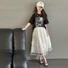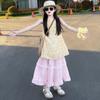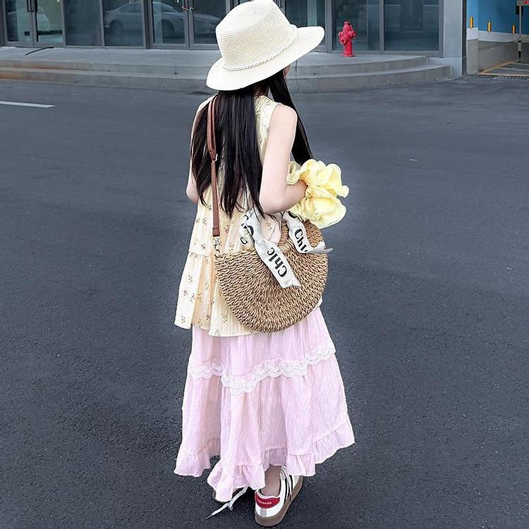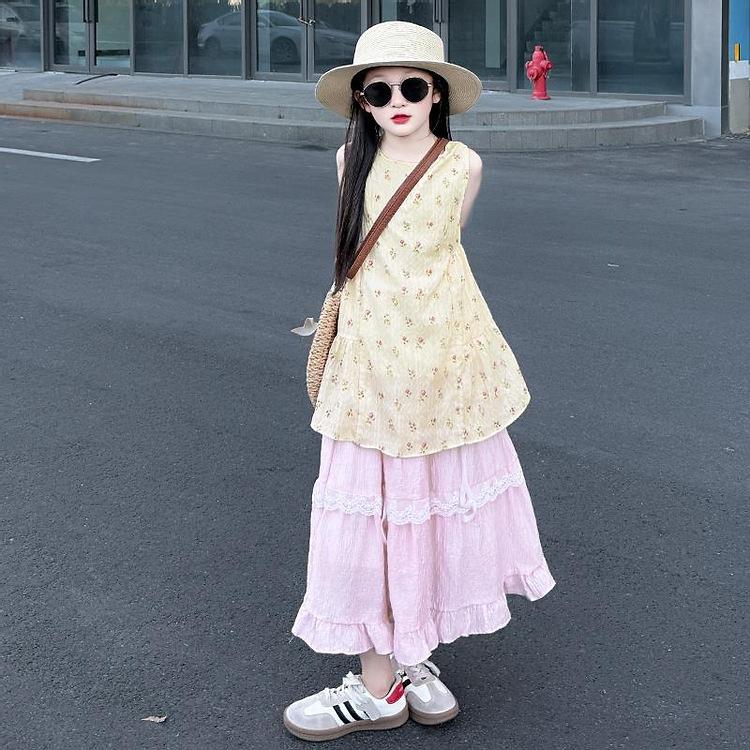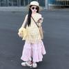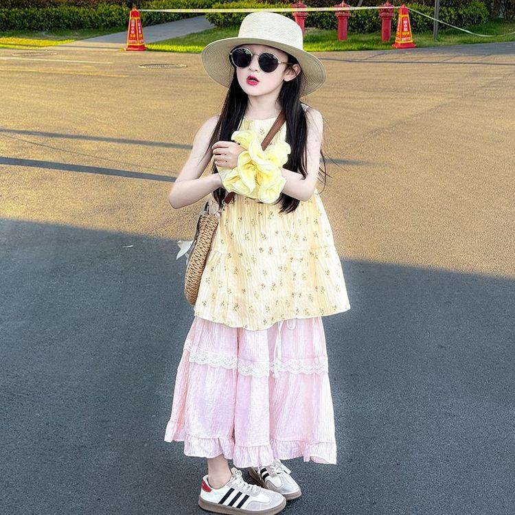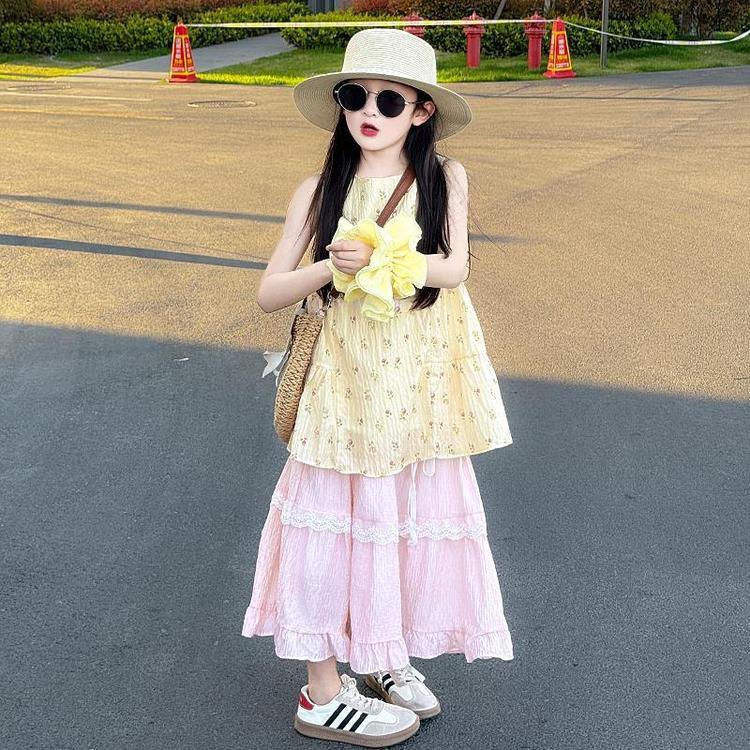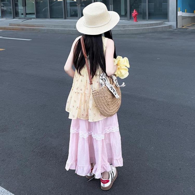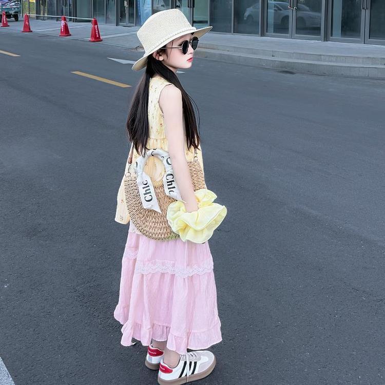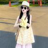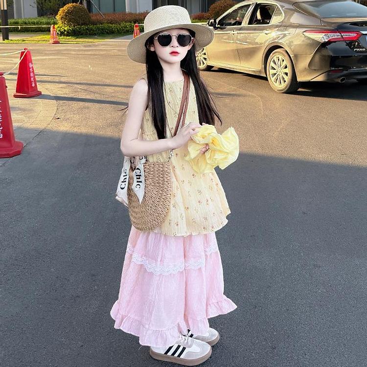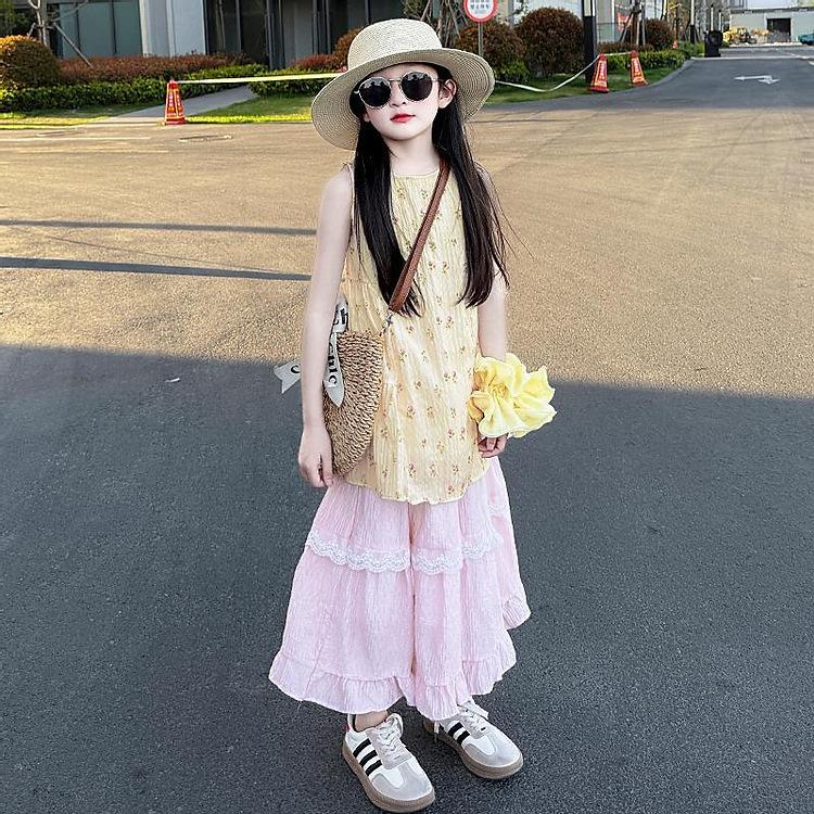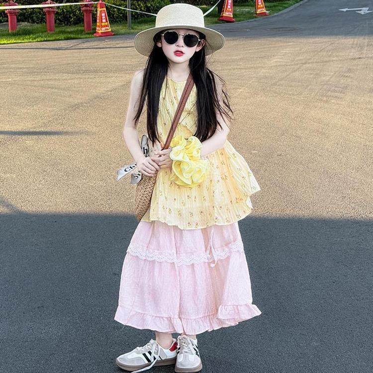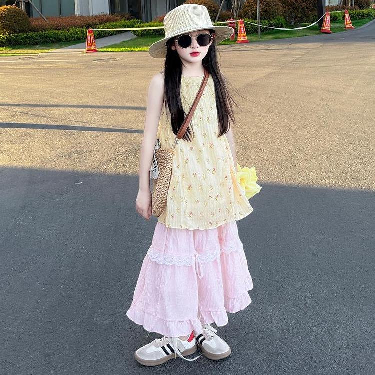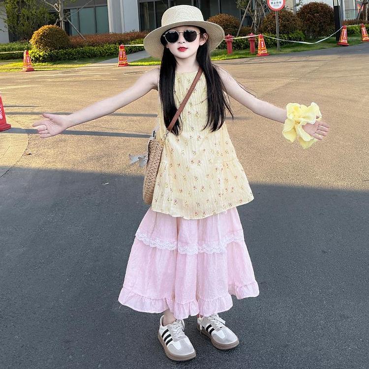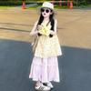 Traje de Falda Super Bonito para Niñas Vestido Amarillo Floral sin Mangas Top + Falda Hongo Conjunto de Dos Piezas