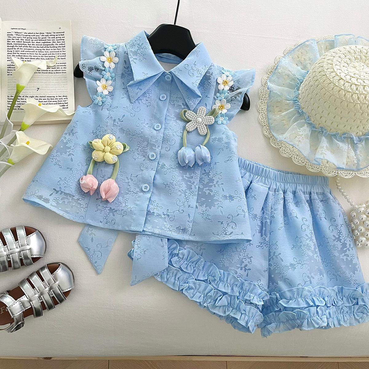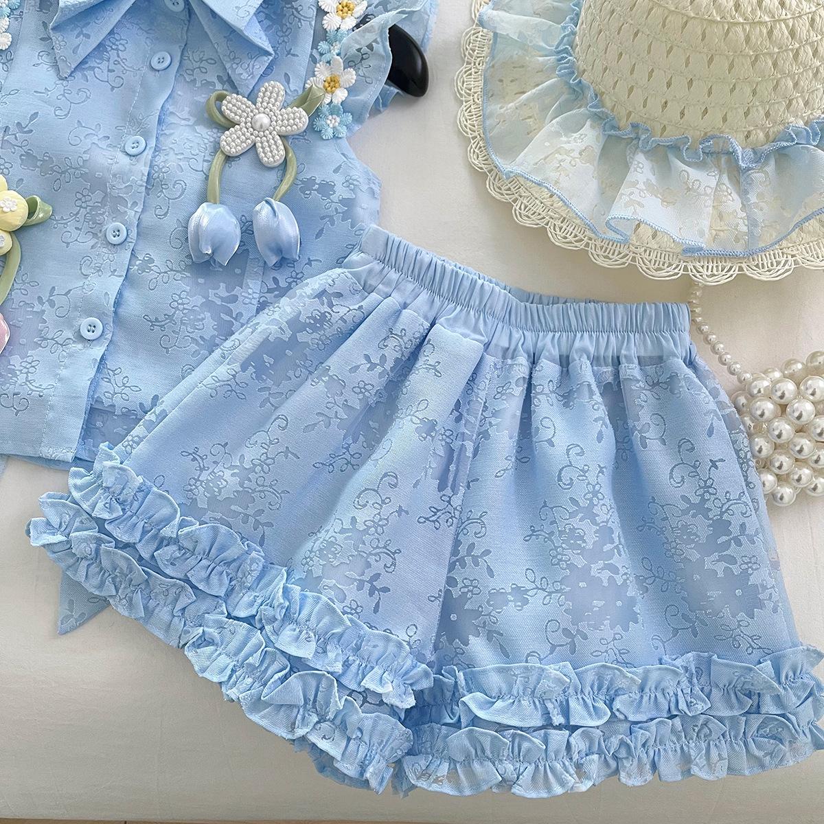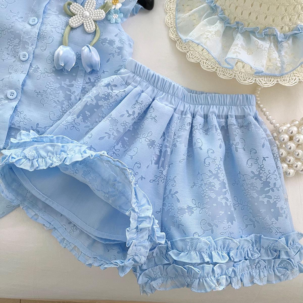 Traje de estilo princesa para niñas Verano 2025 Nuevo estilo Moda infantil Top de manga volada Pantalones cortos de encaje Conjunto de dos piezas