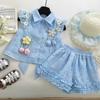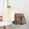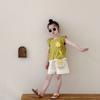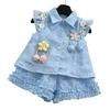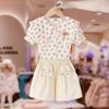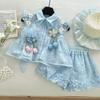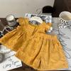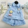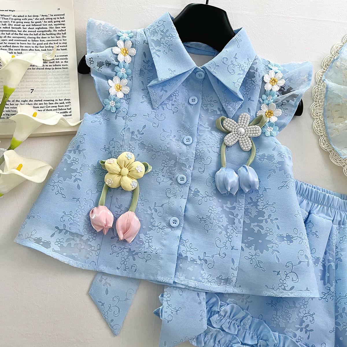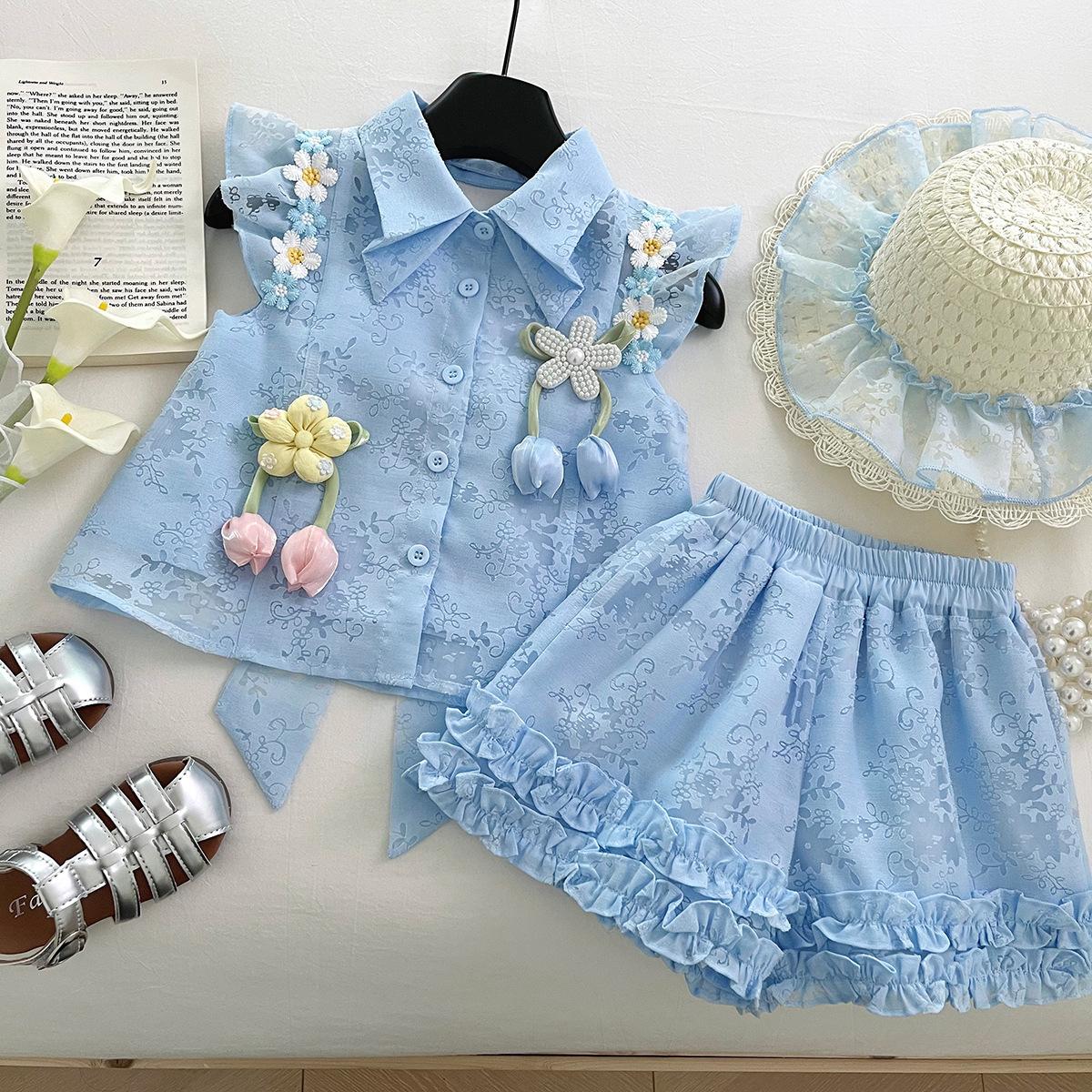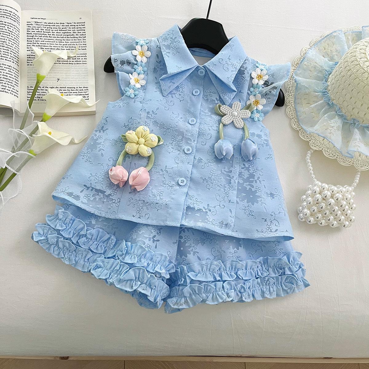 Traje de estilo princesa para niñas Verano 2025 Nuevo estilo Moda infantil Top de manga volada Pantalones cortos de encaje Conjunto de dos piezas