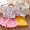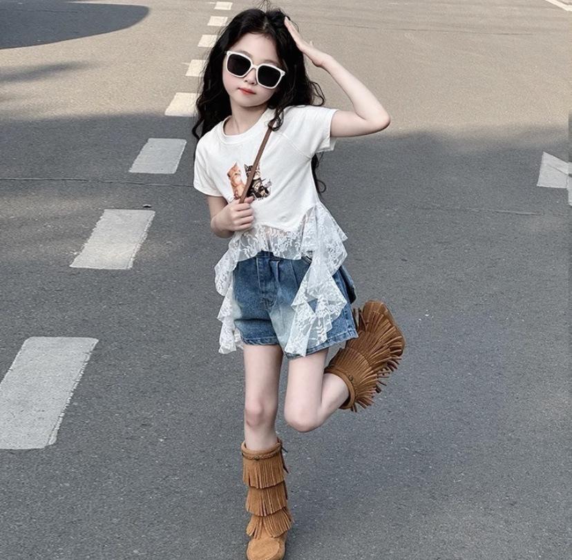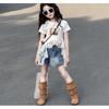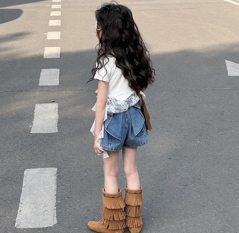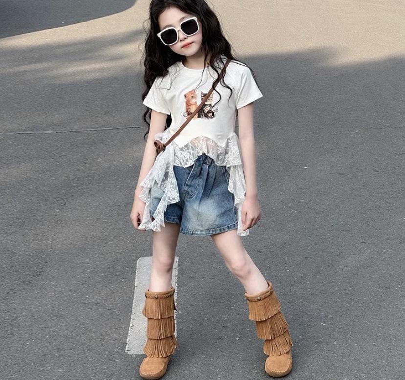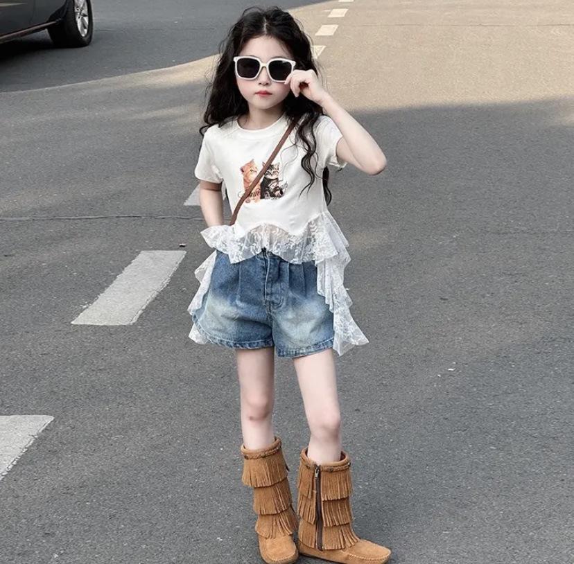 Traje para Niña 2025 Verano Estilo Coreano Bebé Niña Dibujos Animados Encaje Camiseta Manga Corta Moderno Shorts con Lazo