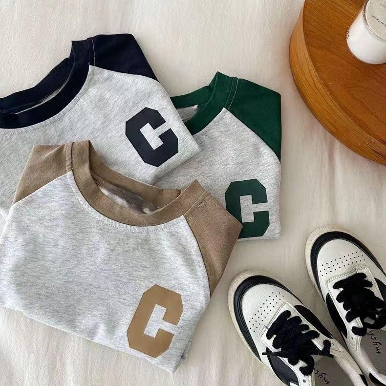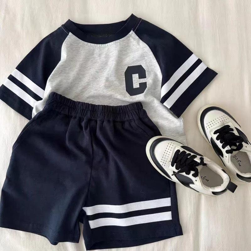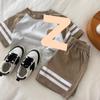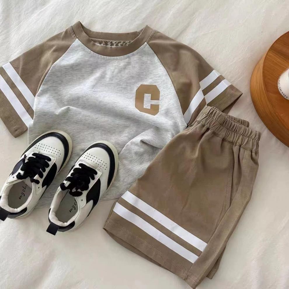 Traje de pantalones cortos de manga corta para niños 2025 Verano Nuevo estilo Empalme Bebé Coreano Camiseta deportiva Conjunto de dos piezas para niños y niñas