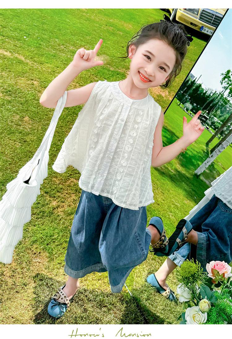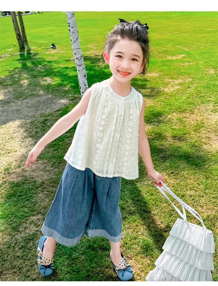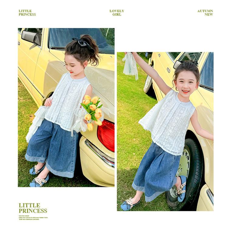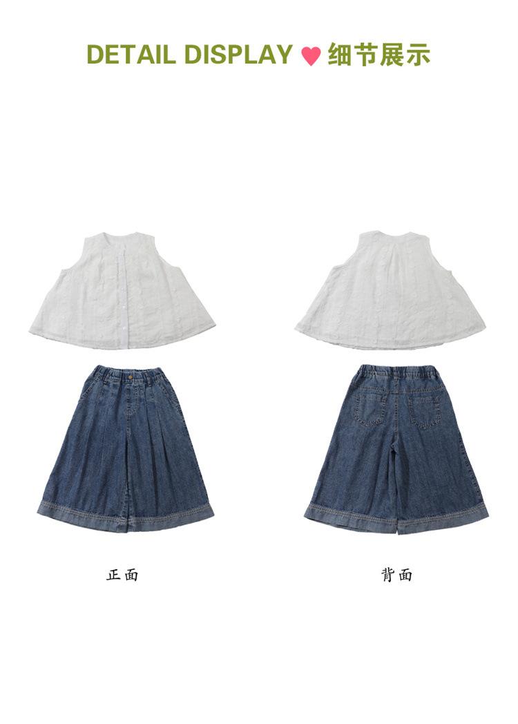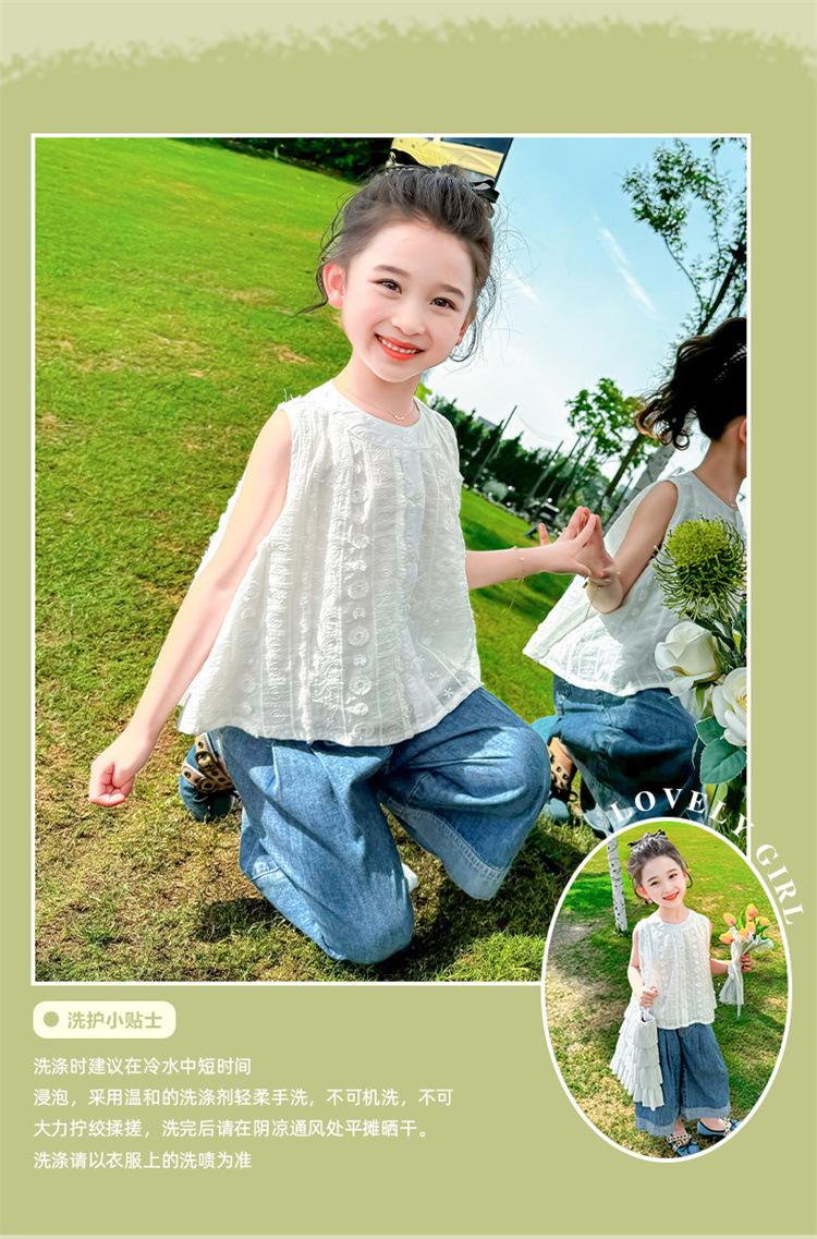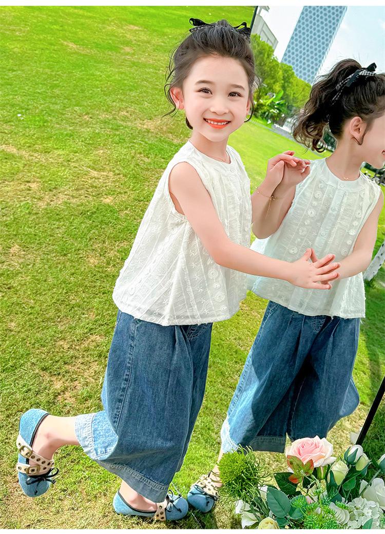 Traje de Mezclilla Jacquard sin Mangas de Pierna Ancha para Niñas 2025 Verano Nueva Moda Conjunto Elegante de Dos Piezas para Niña