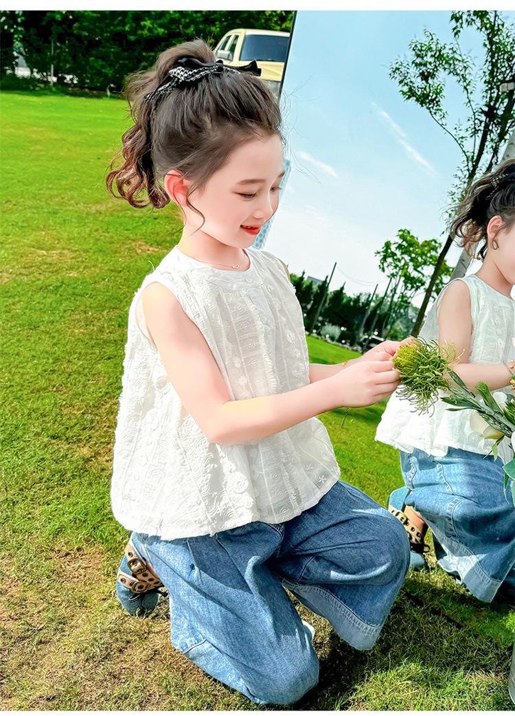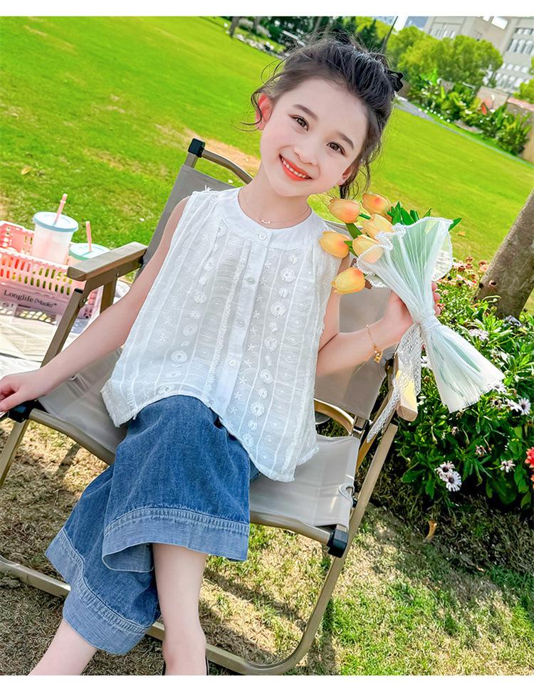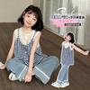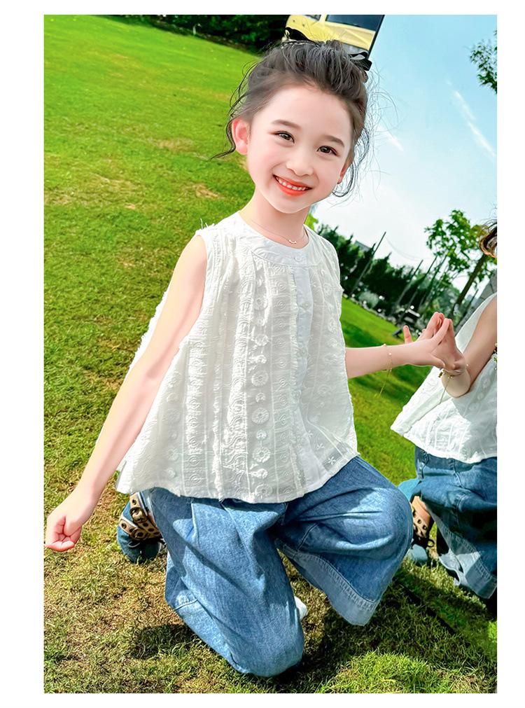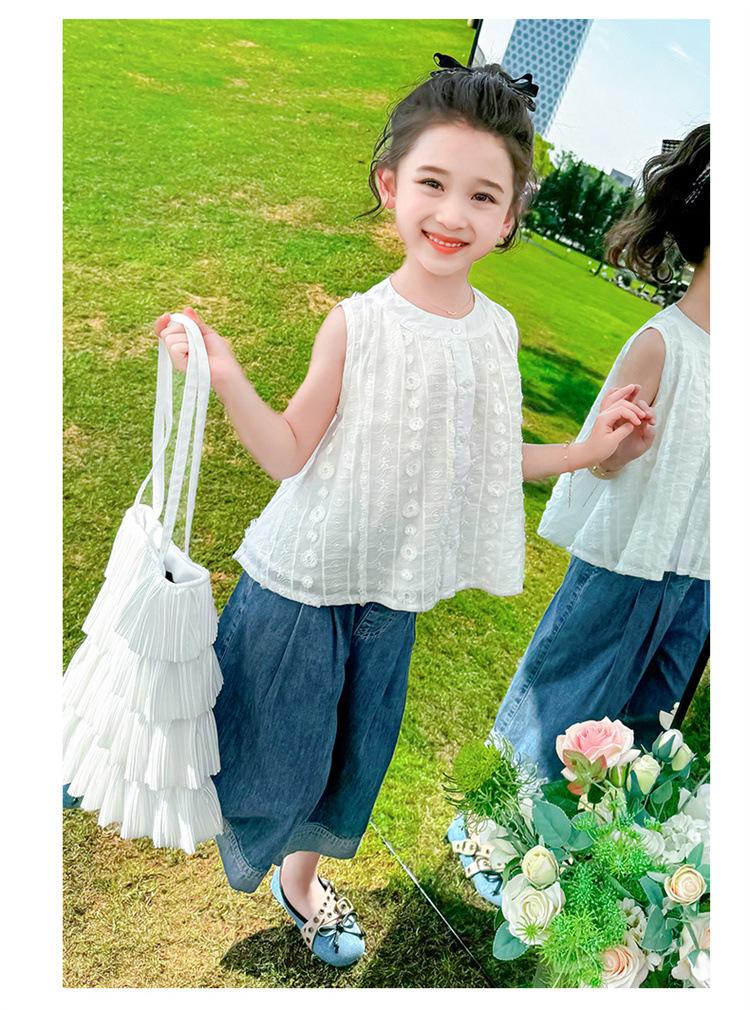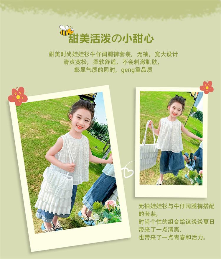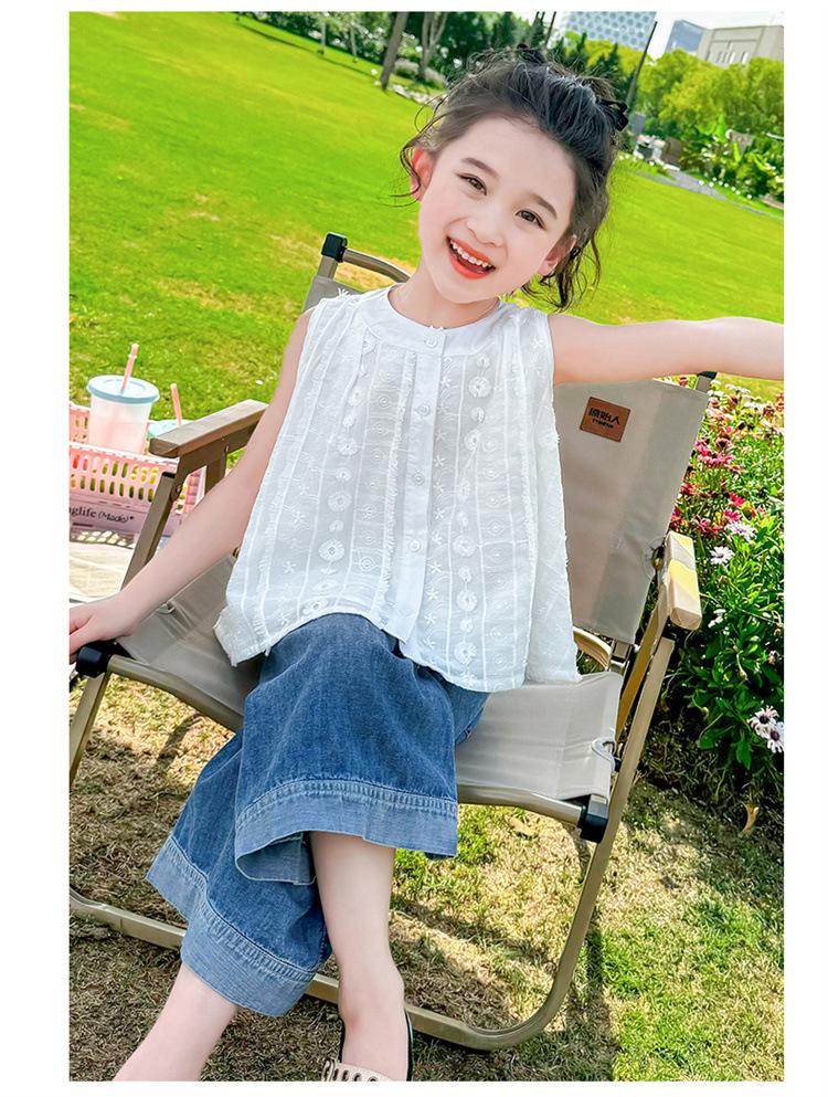 Traje de Mezclilla Jacquard sin Mangas de Pierna Ancha para Niñas 2025 Verano Nueva Moda Conjunto Elegante de Dos Piezas para Niña