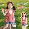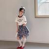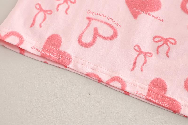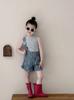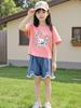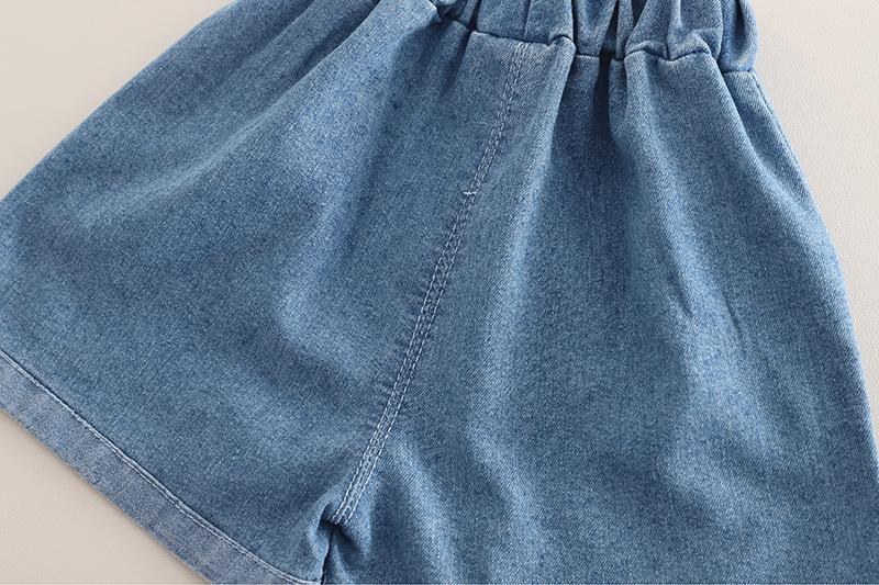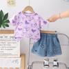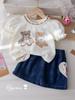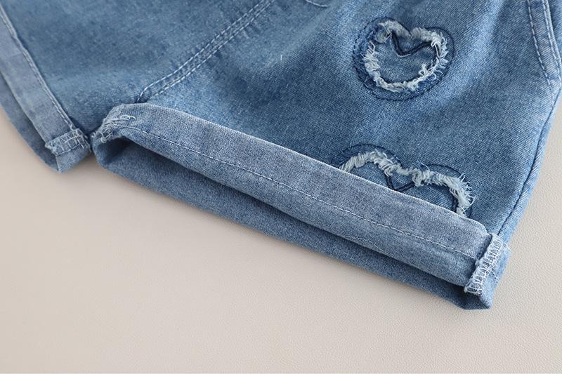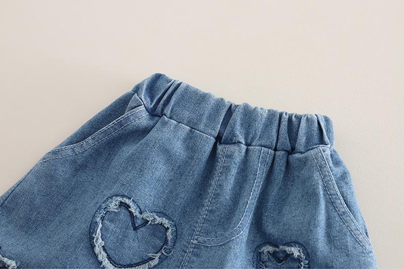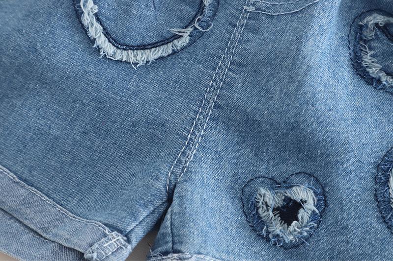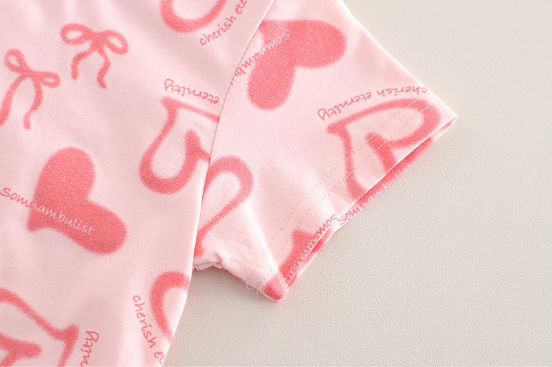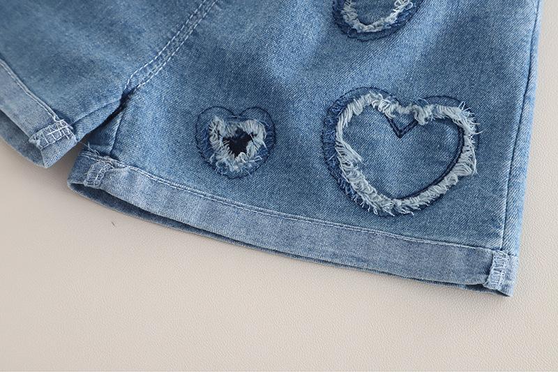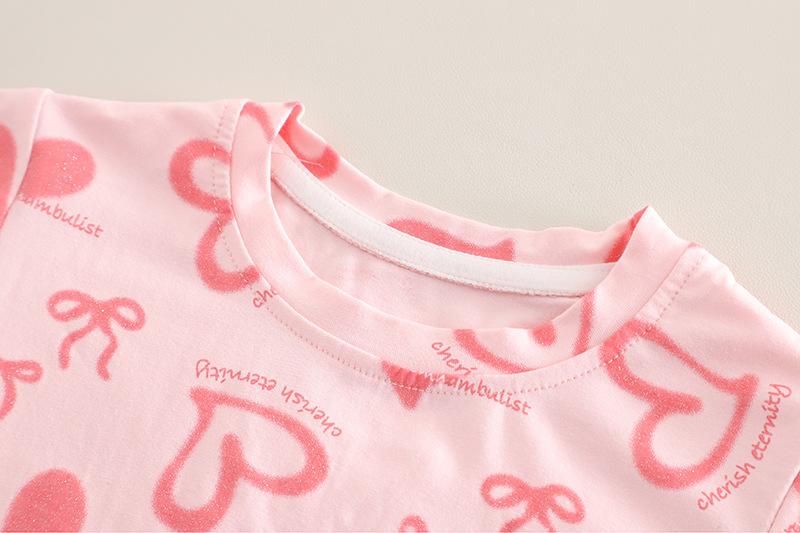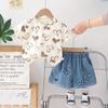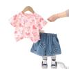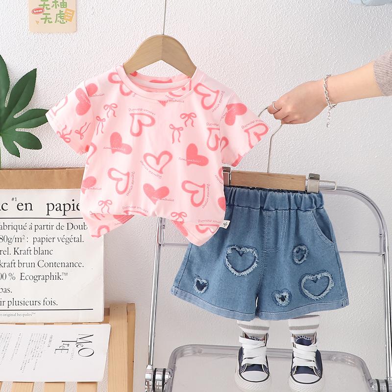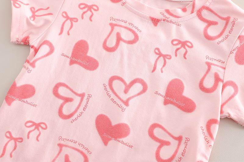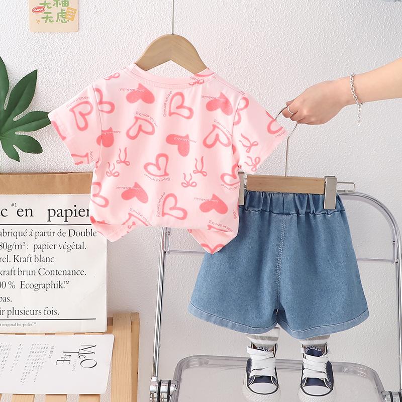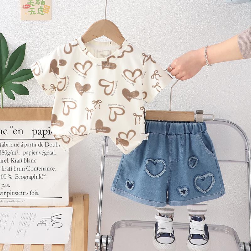 Traje de Verano para Niñas 2025 Nuevo Estilo Niñas Estampado Completo Amor Lazo Manga Corta Shorts de Mezclilla Conjunto de Dos Piezas