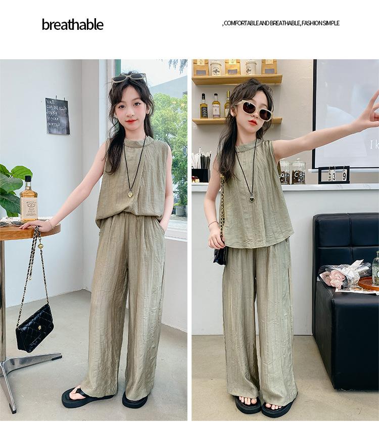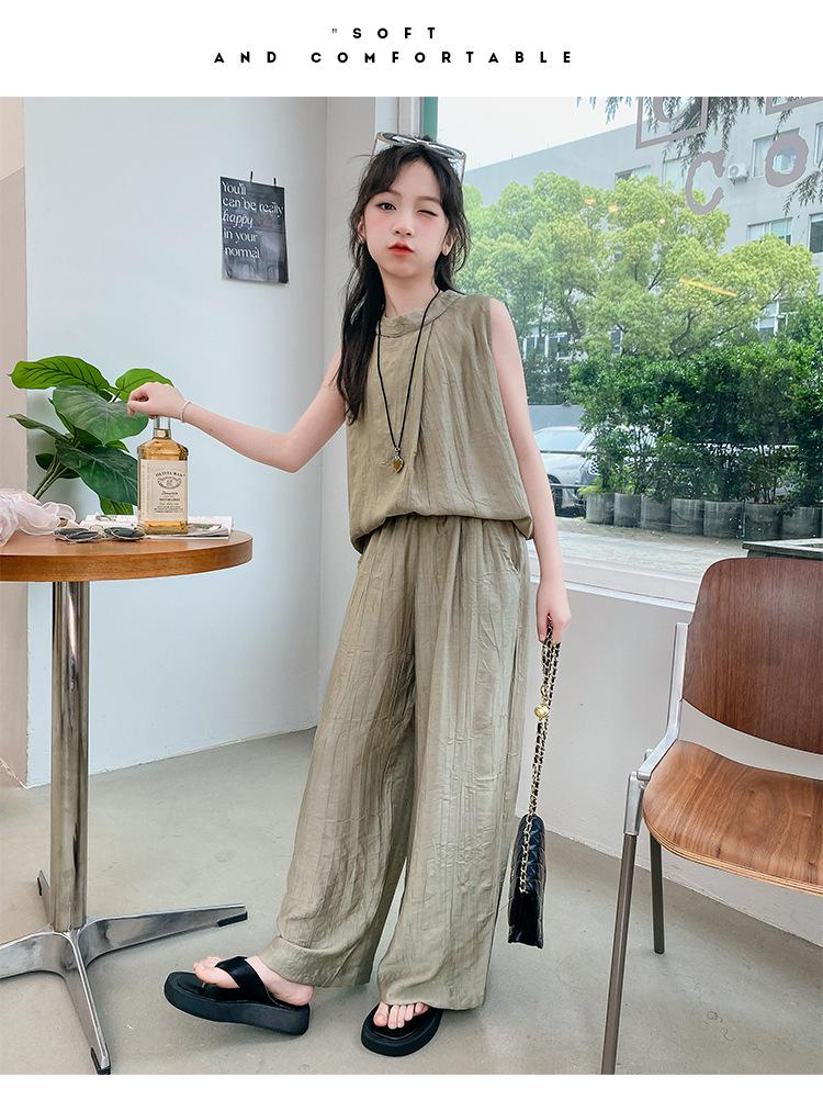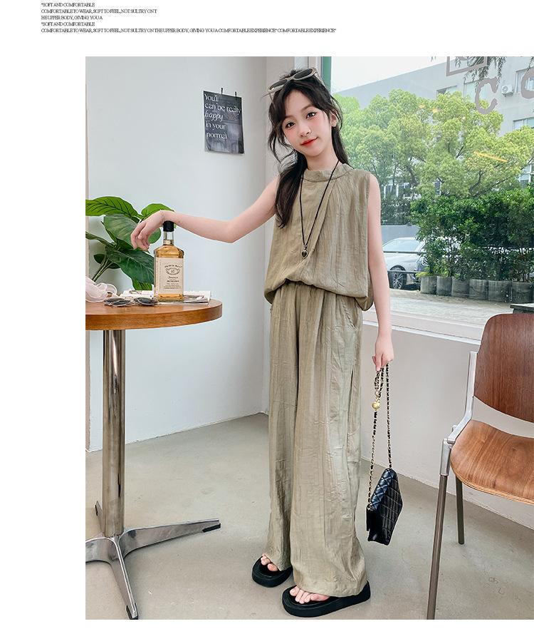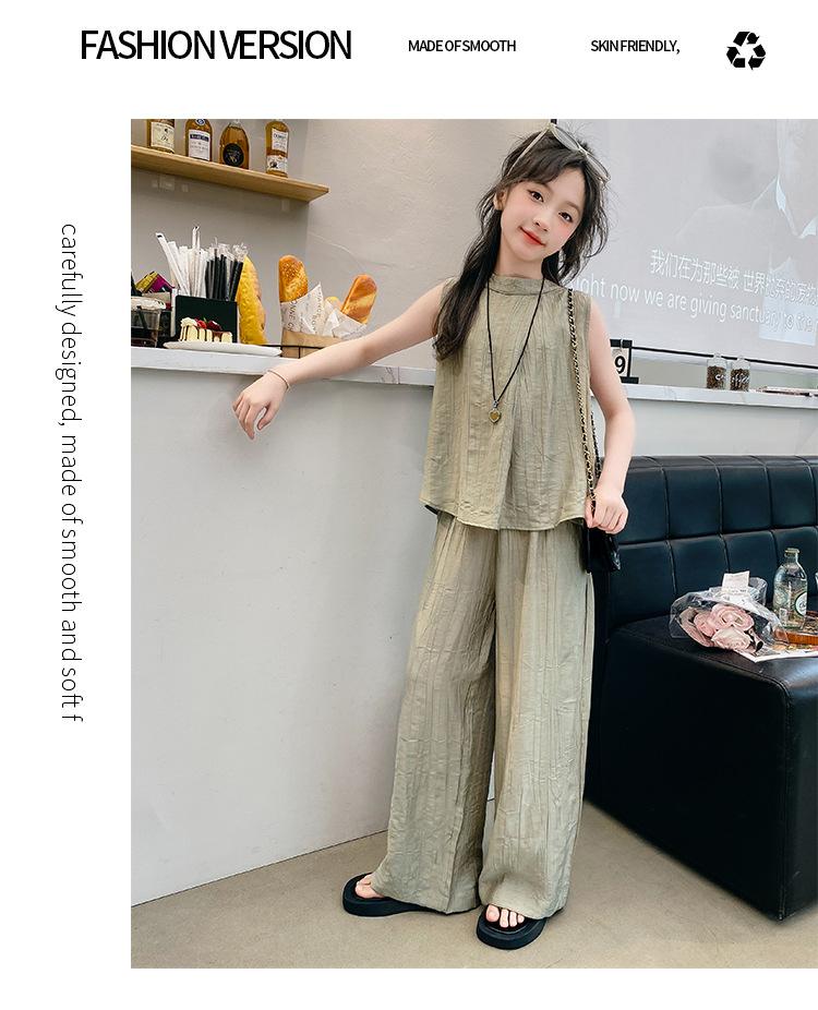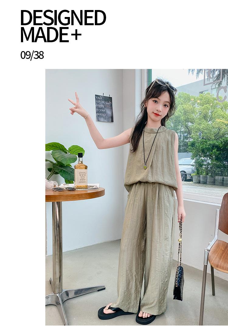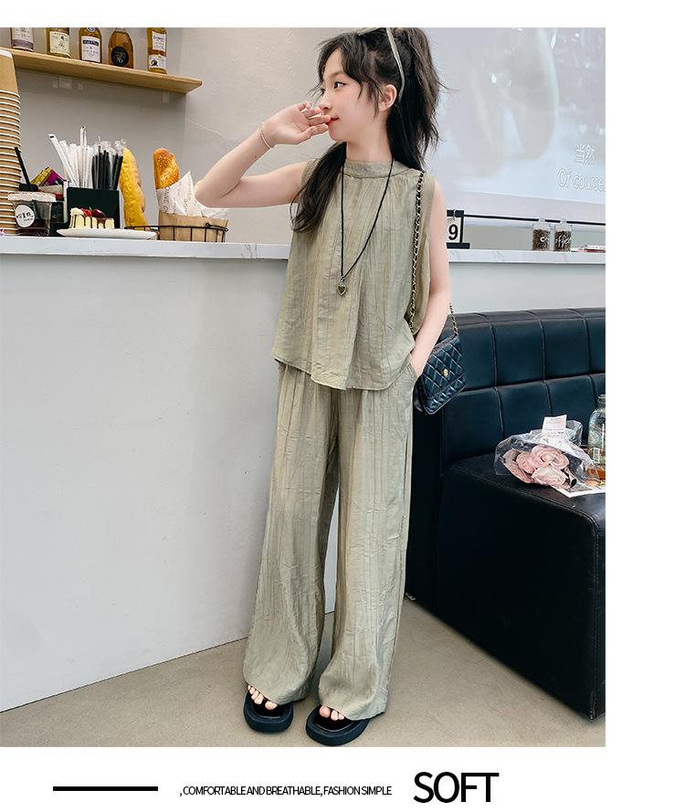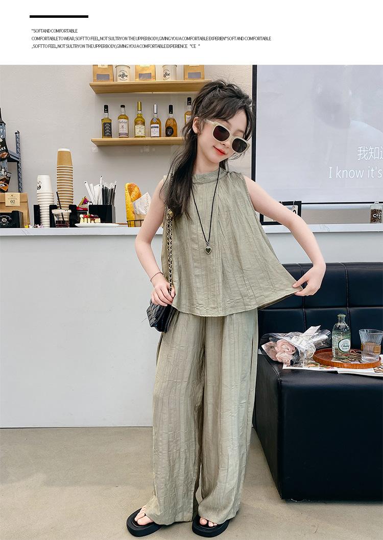 Traje sencillo para niñas Delgado 2024 Verano Nuevo Estilo Top chaleco sin mangas Pantalones de pierna ancha Dos piezas a la moda
