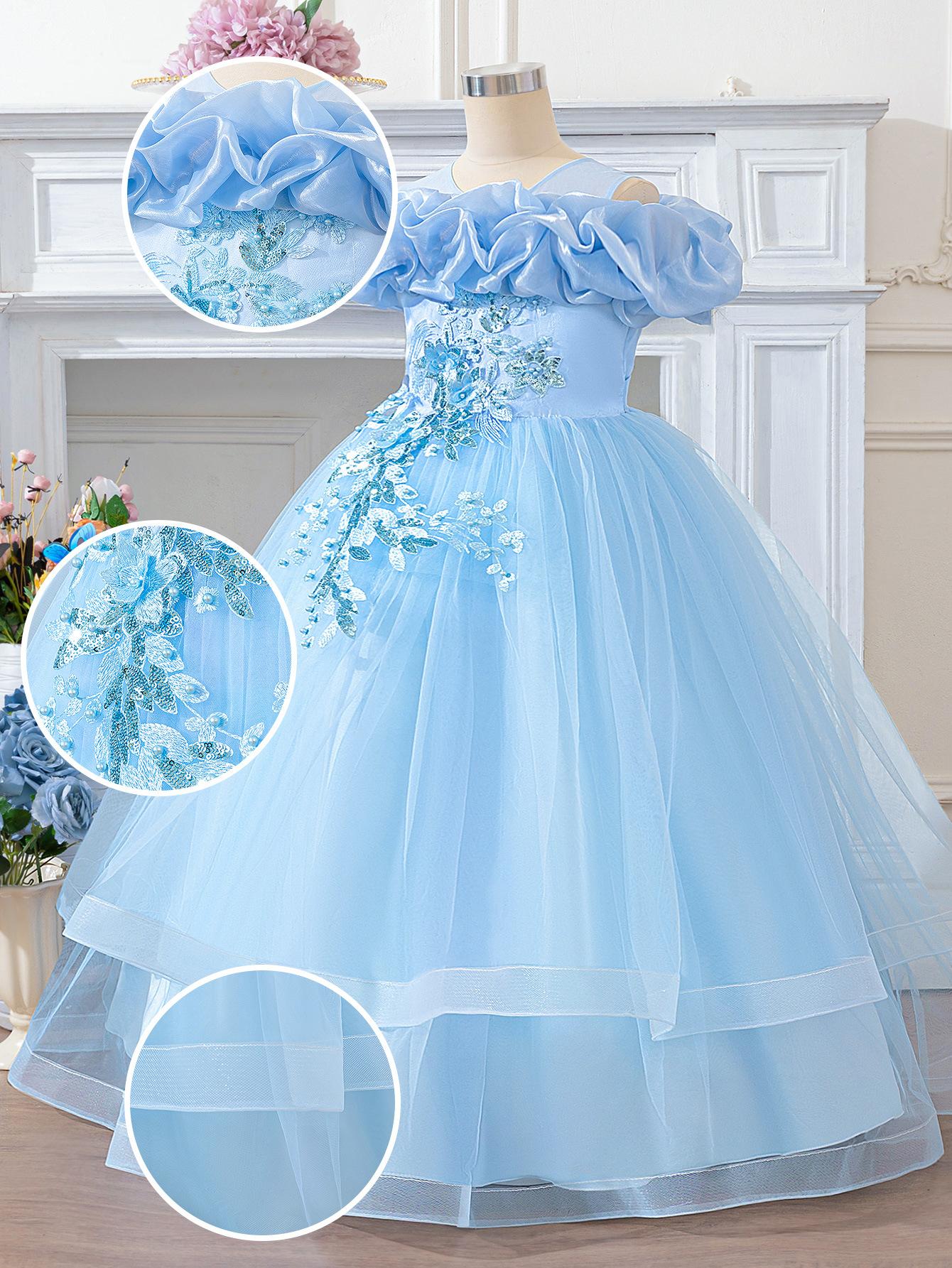 Vestido de Princesa Puff de un Hombro Transfronterizo Vestido de Actuación para Niñas Vestido de Malla Vestido de Boda Vestido para Niños Grandes