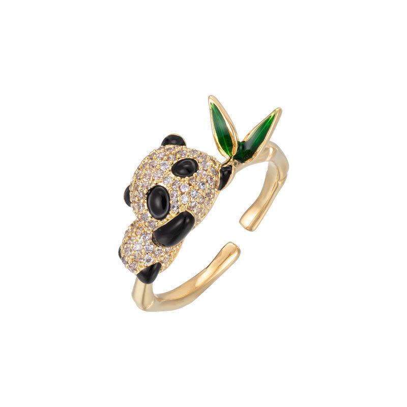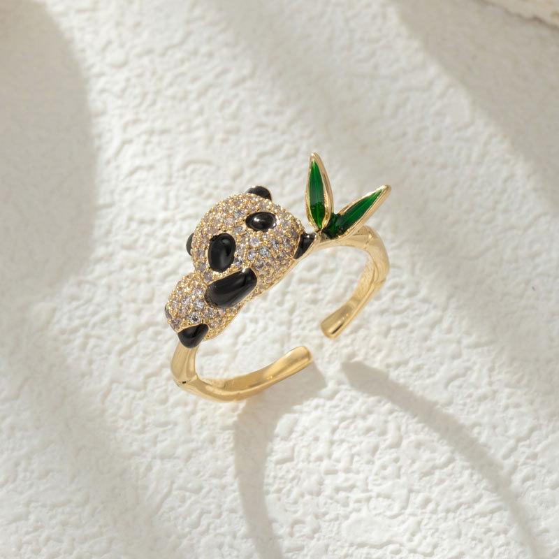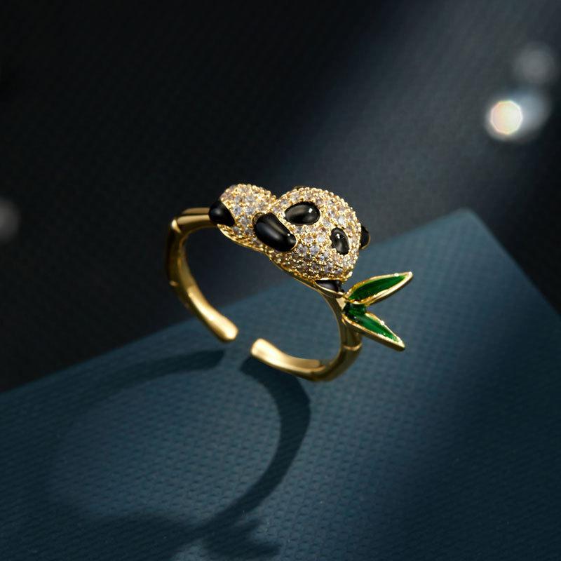 Guofeng Lindo Anillo Abierto de Hoja de Bambú de Panda Pequeño Nuevo Estilo Lindo Divertido Animal Anillo Ajustable Micro-incrustado Anillo de Gota de Aceite