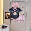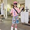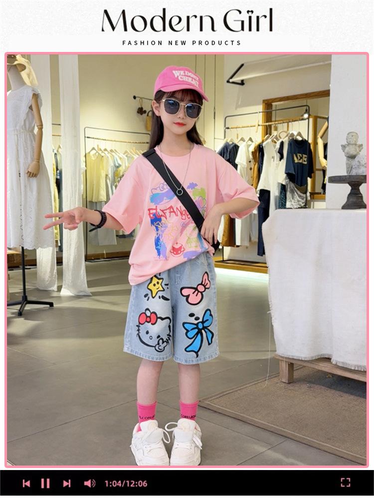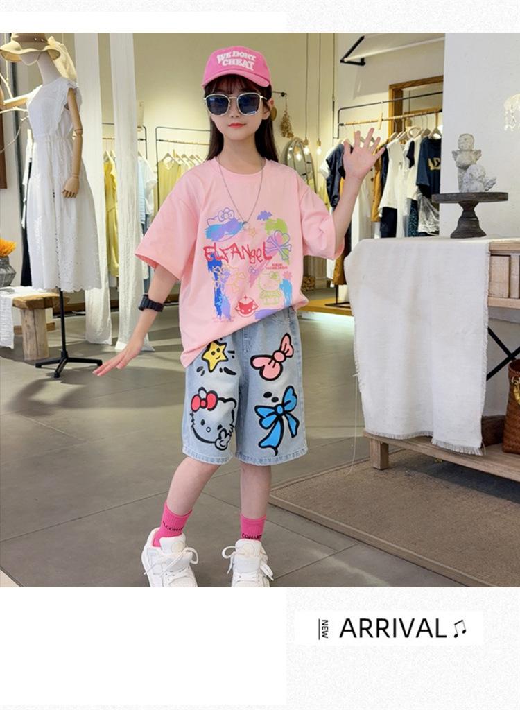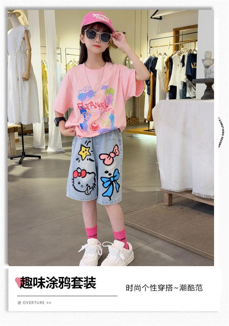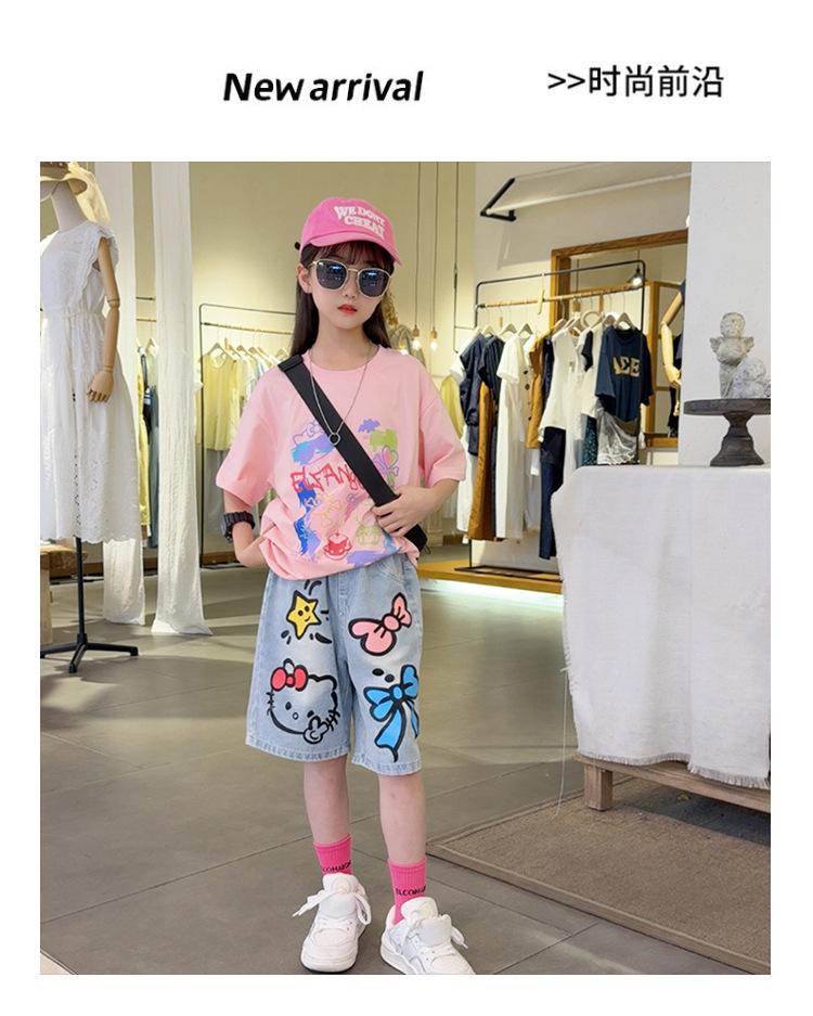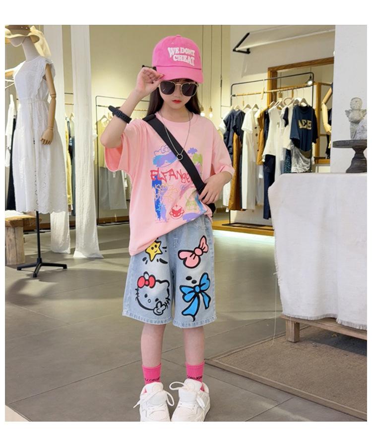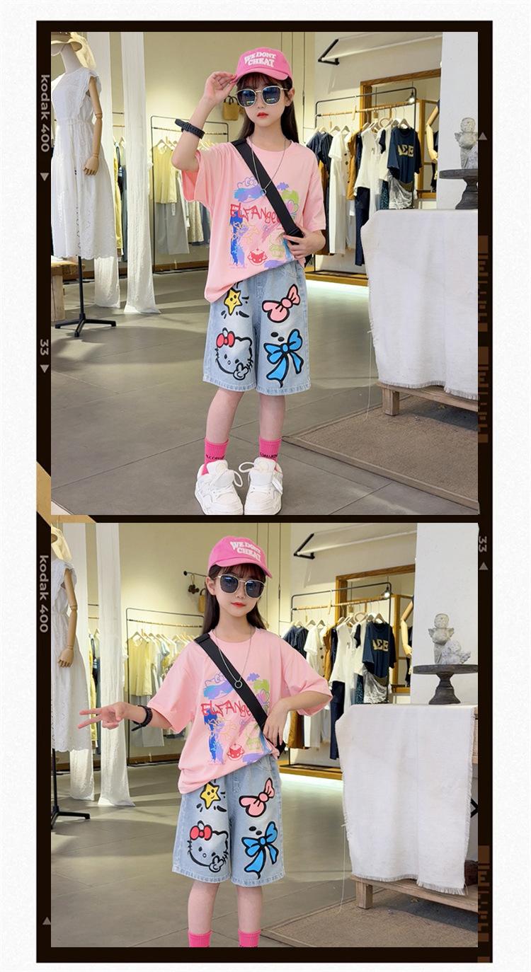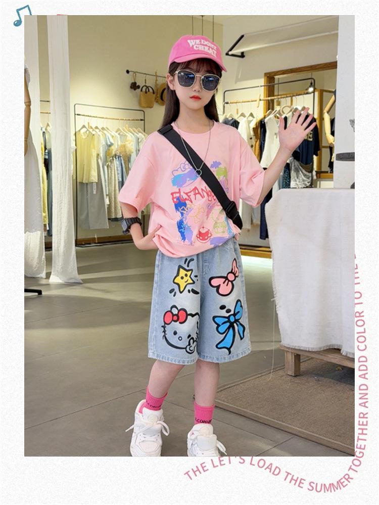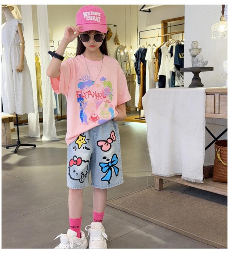 Traje de Verano para Niñas 2025 Nueva Moda para Niñas Moda Urbana de Manga Corta para Niños Jeans de Dibujos Animados Conjunto de Dos Piezas