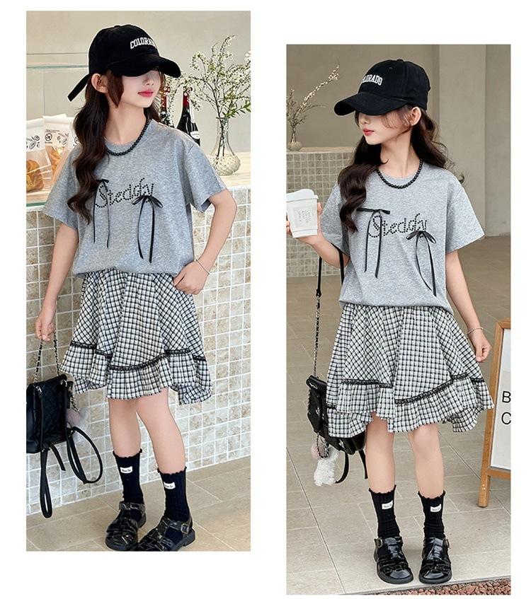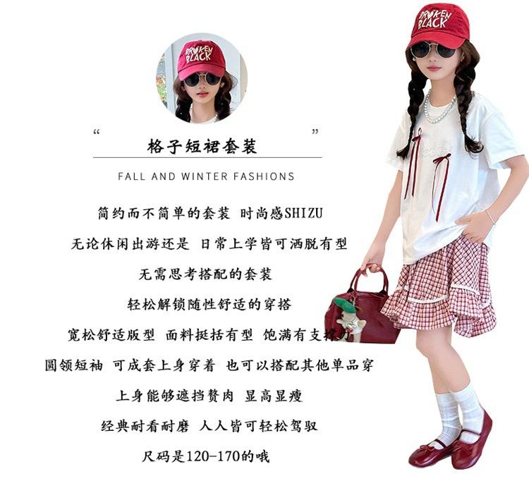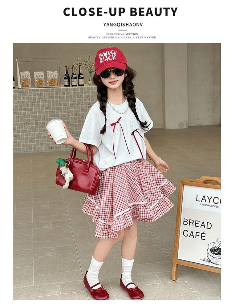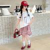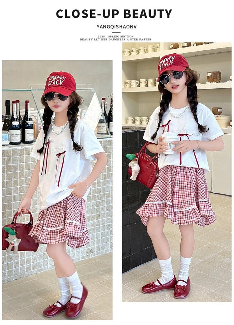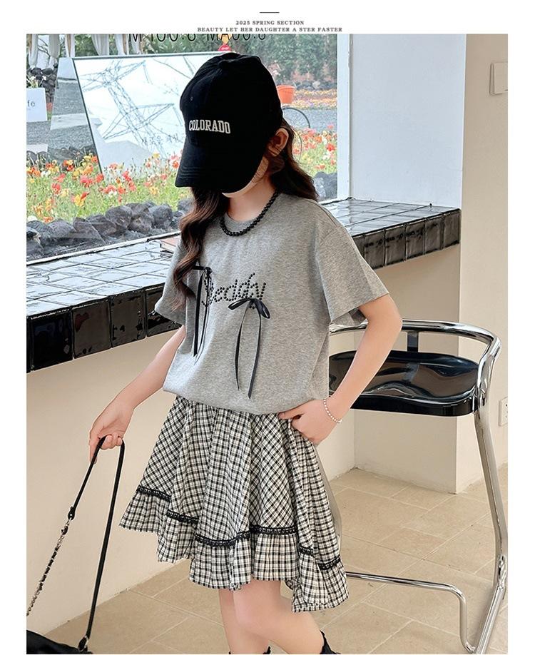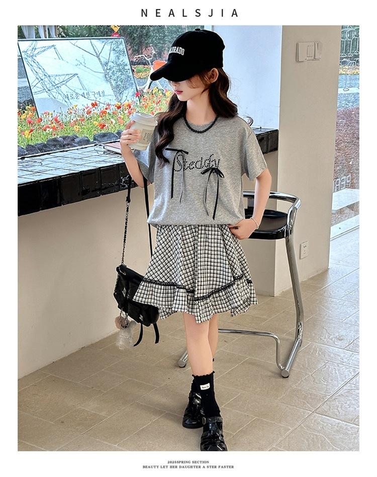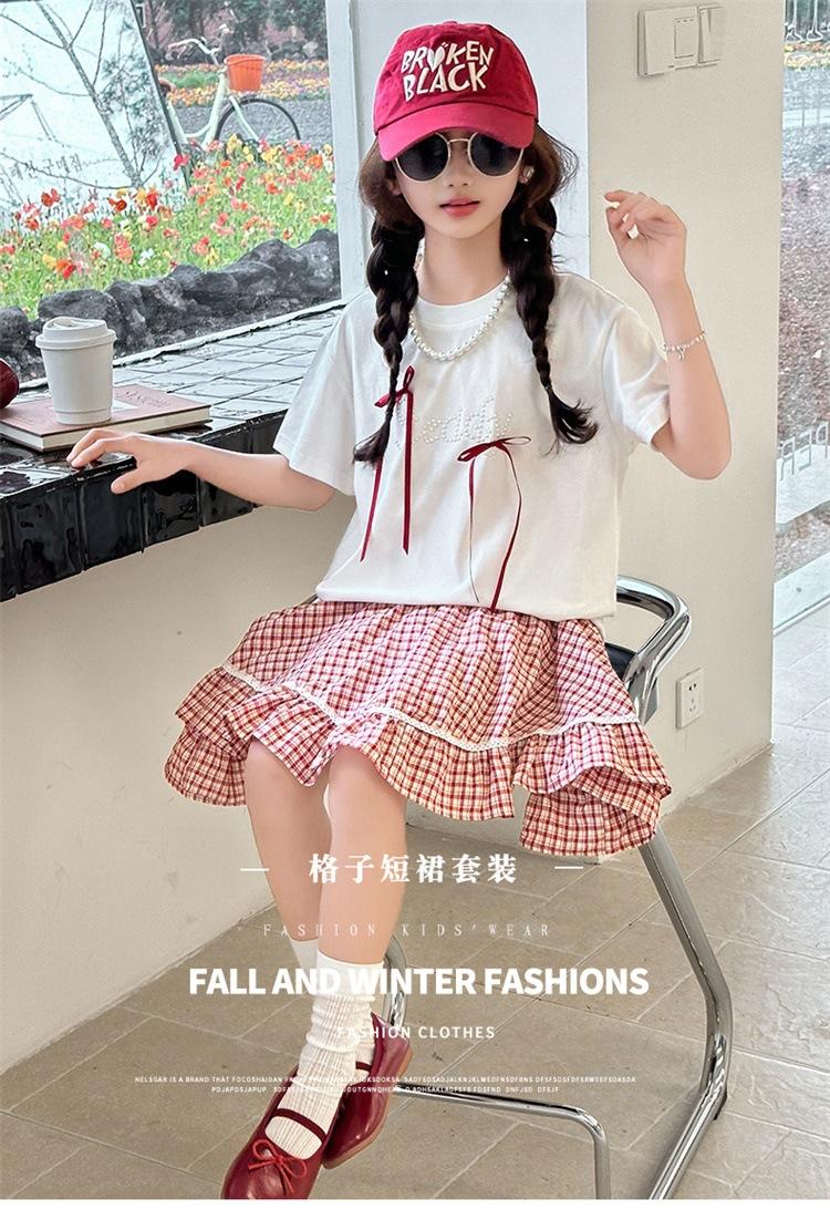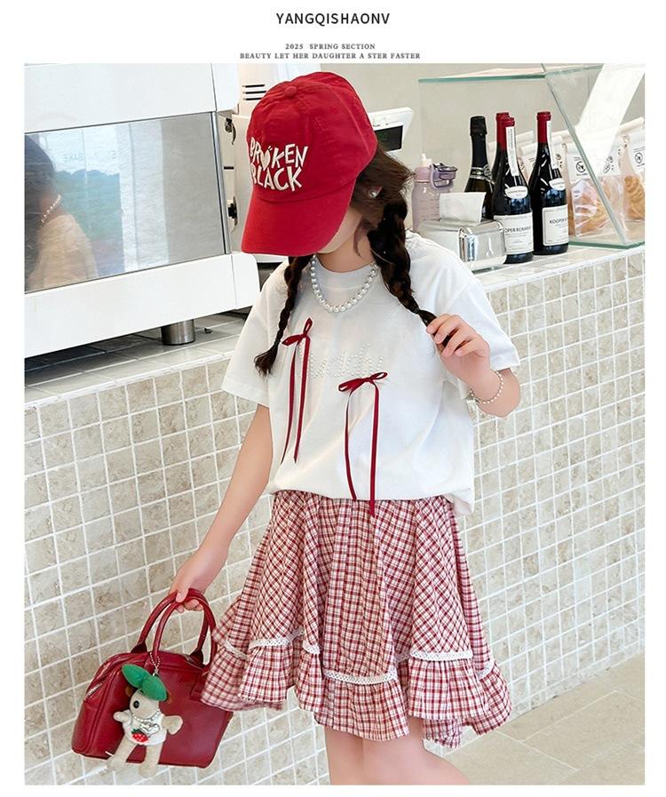 Traje de manga corta para niña 2025 Nuevo estilo Estilo occidental Ropa de verano para niños grandes Verano para niños Falda a cuadros Conjunto de dos piezas