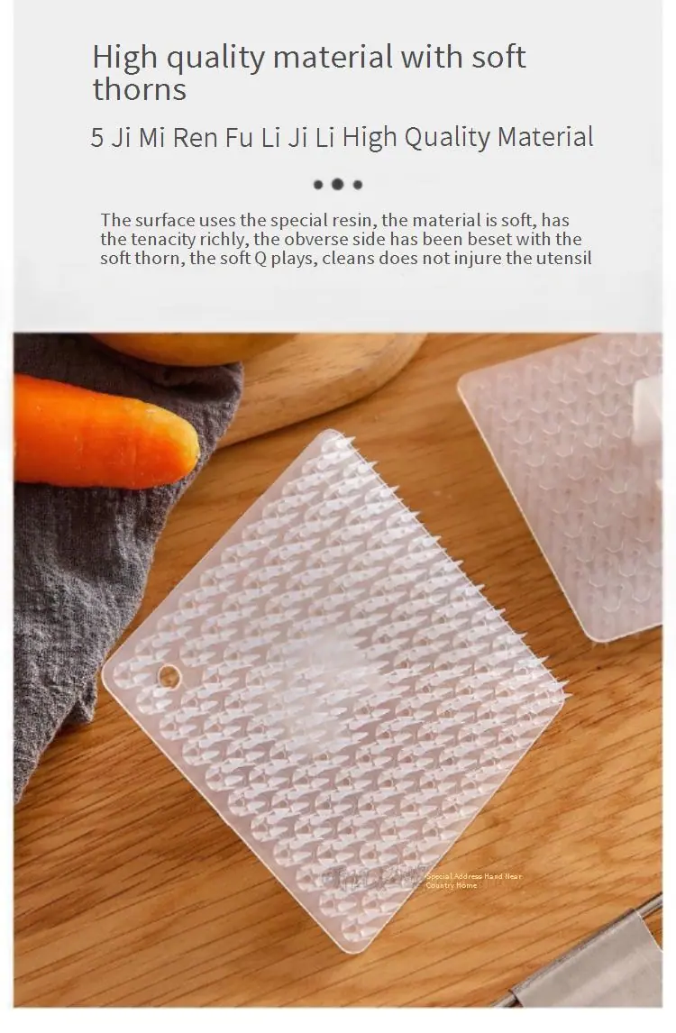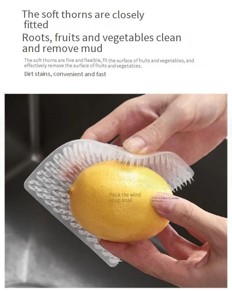 Nombre del producto: Cepillo para Limpiar Frutas y Verduras Tamaño del producto: 10 * 10 Peso: 16 gramos Características del producto: Amplia gama de usos Fácil y ahorra trabajo Puño para dedo de 2.4 cm de diámetro Las cerdas gruesas del cepillo no lastiman fácilmente las manos Con orificio para colgar El material PE suave se puede doblar arbitrariamente