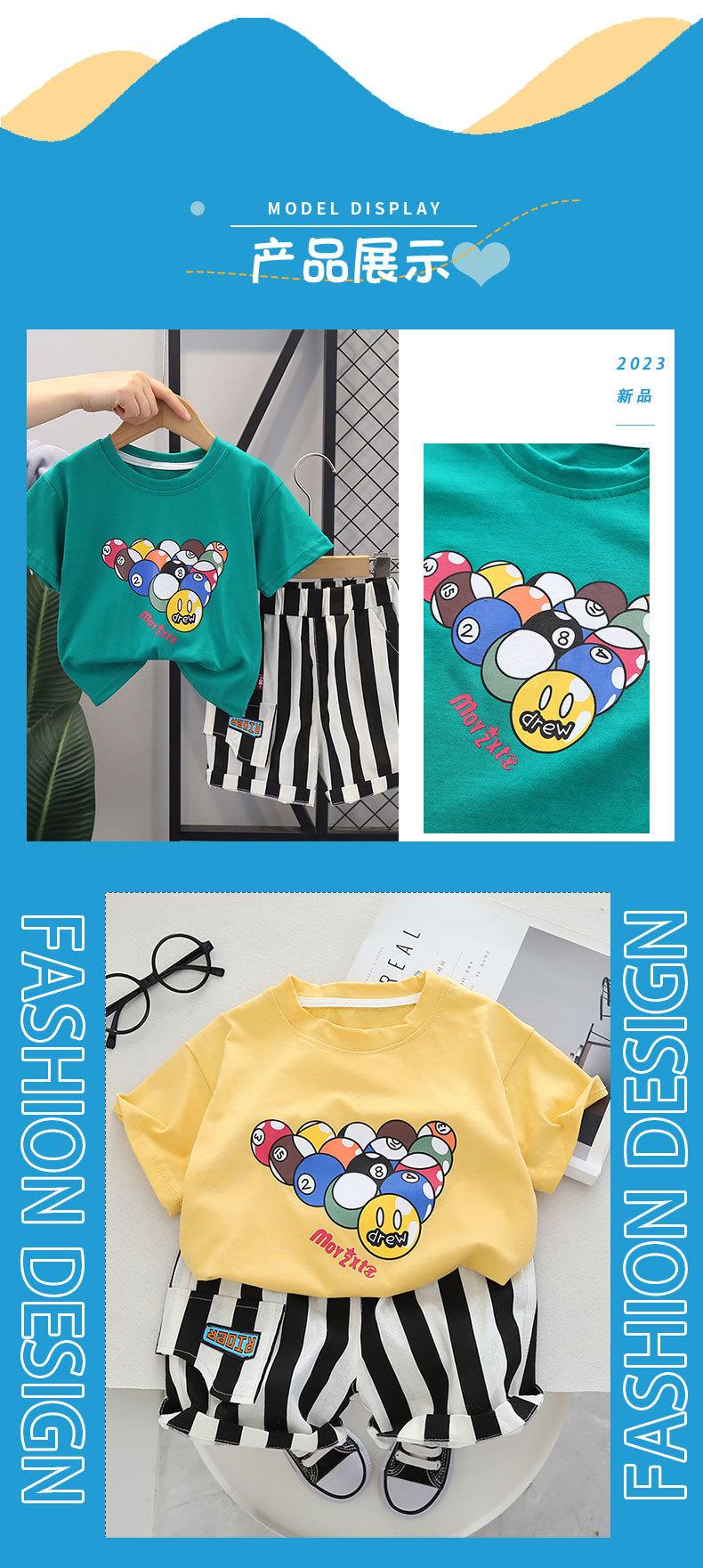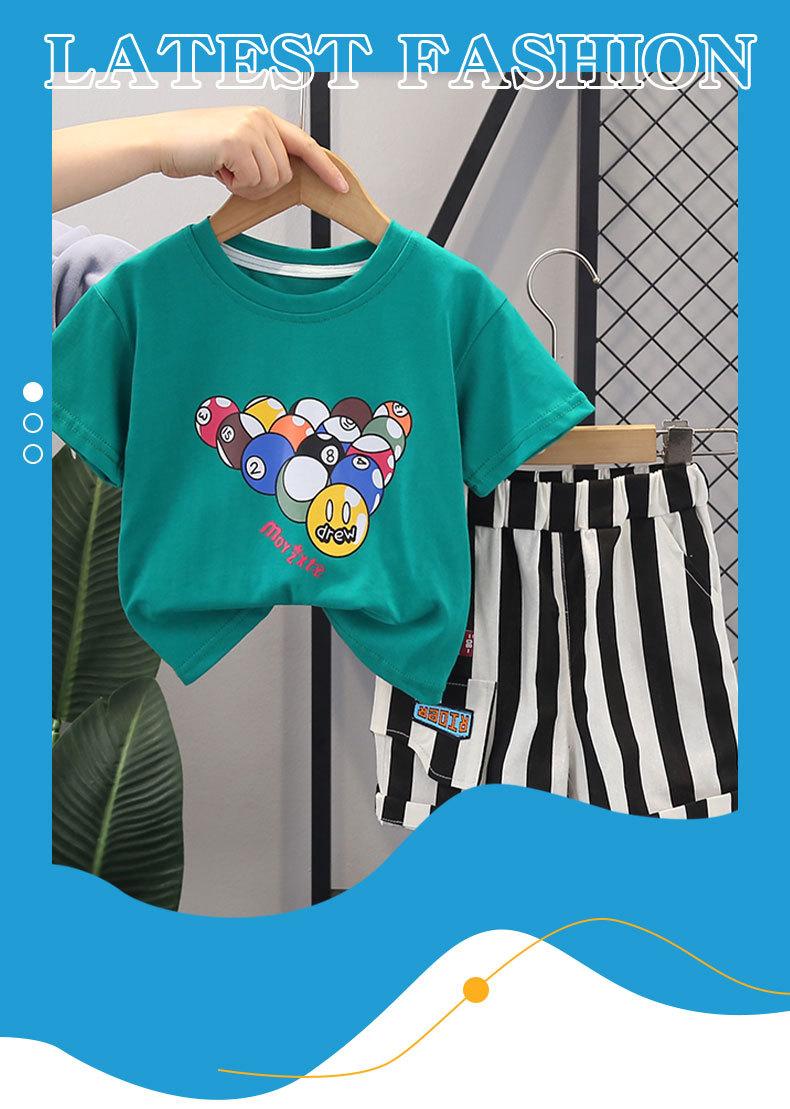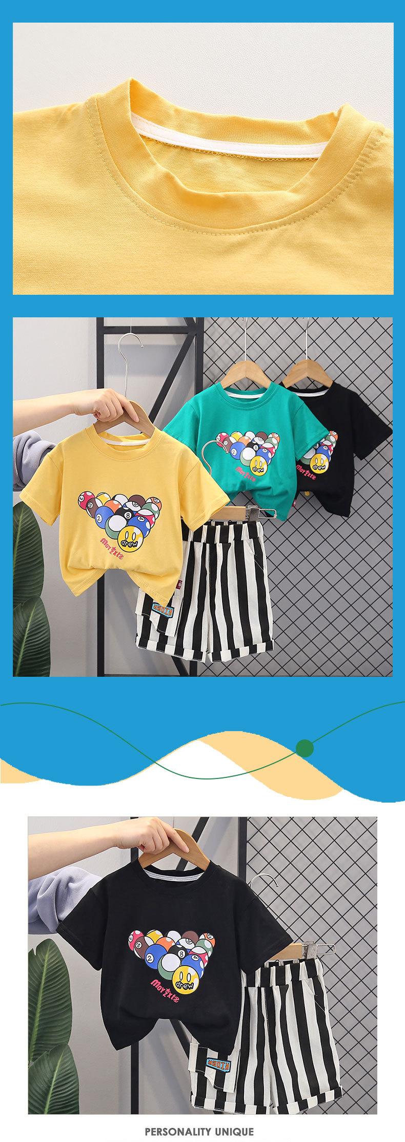 2023 Nuevo Traje de Verano para Niños Moda Infantil Cara Sonriente Dibujos Animados Billar Manga Corta Rayas Pantalones Cortos Ropa Casual