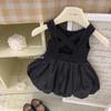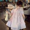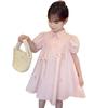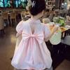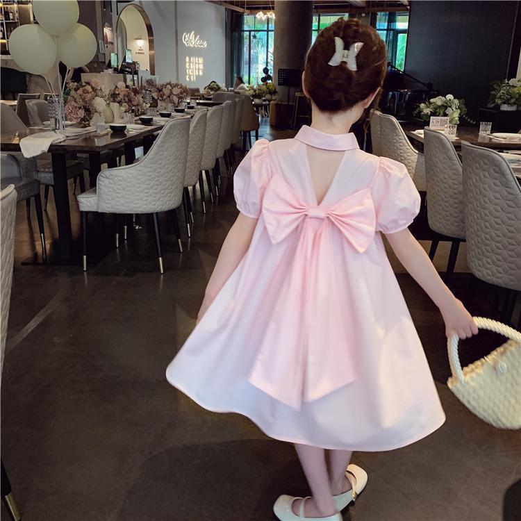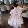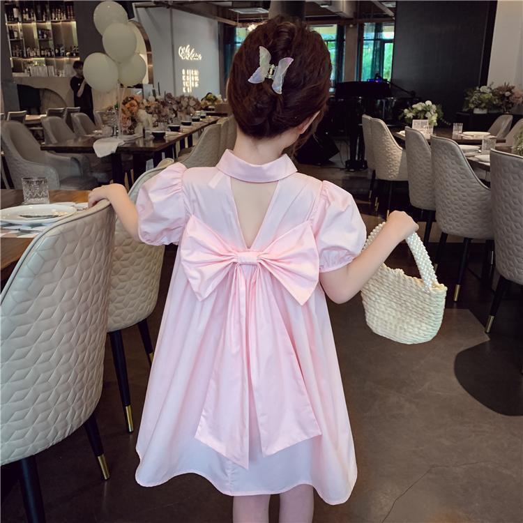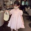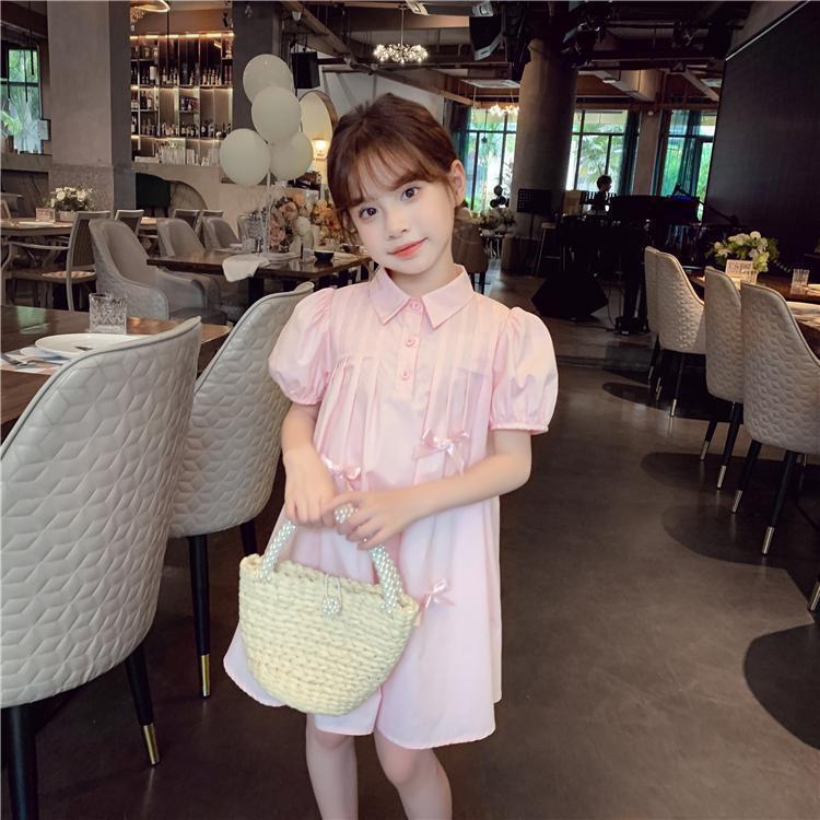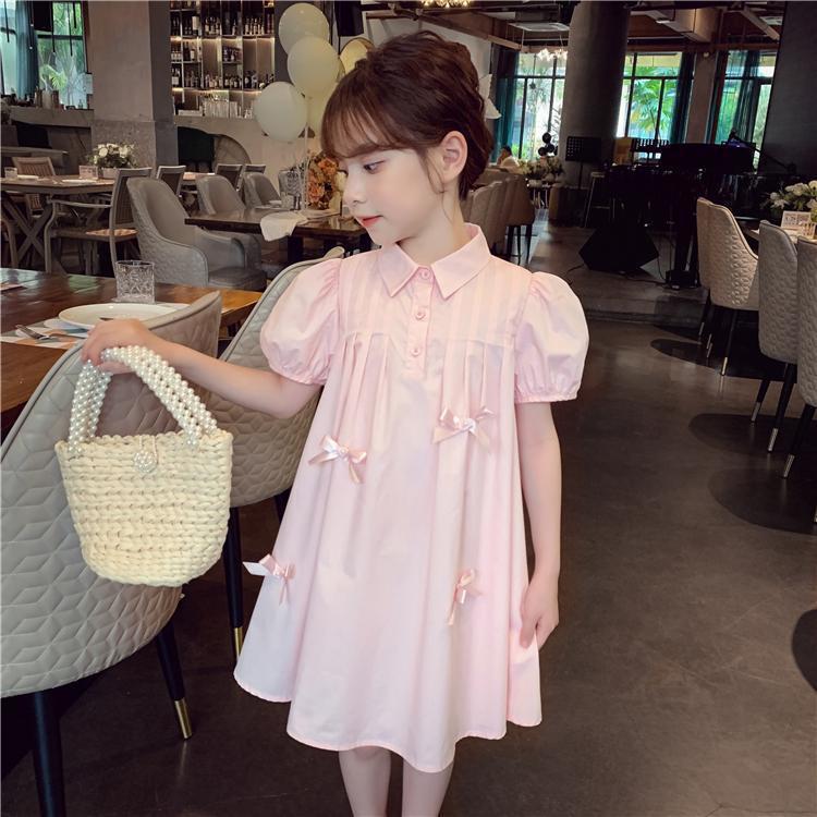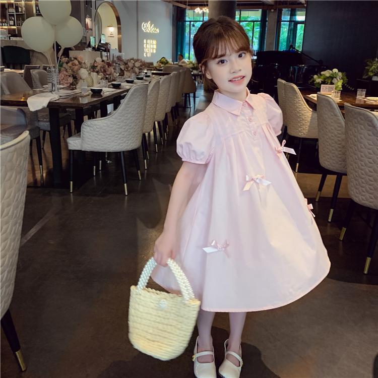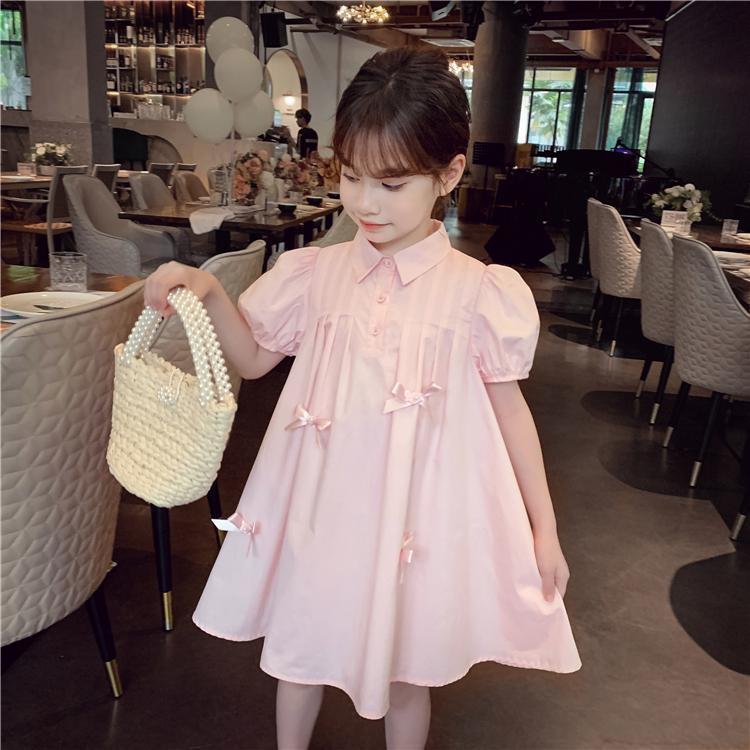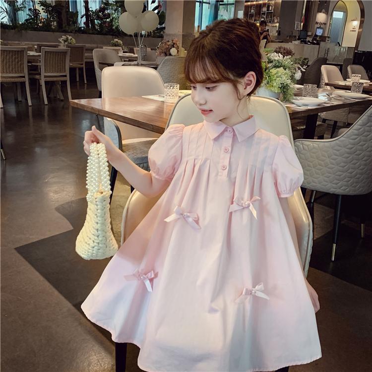 Vestido de Bebé para Niñas Estilo Coreano Elegante Manga Abullonada Niños Medianos-Grandes Verano a la Moda Lazo Color Sólido Vestido de Princesa Moderno