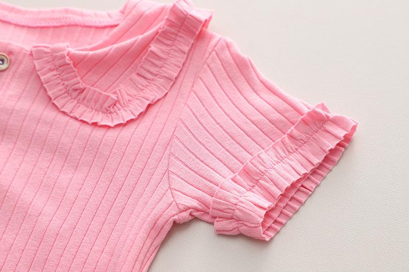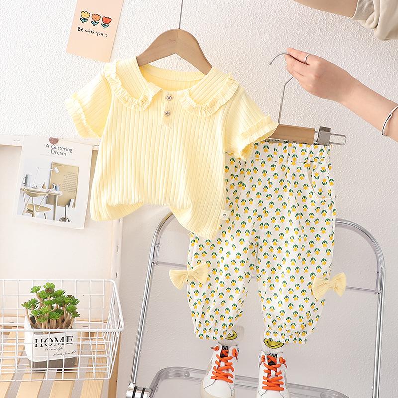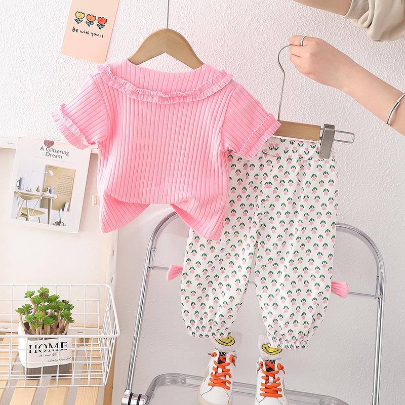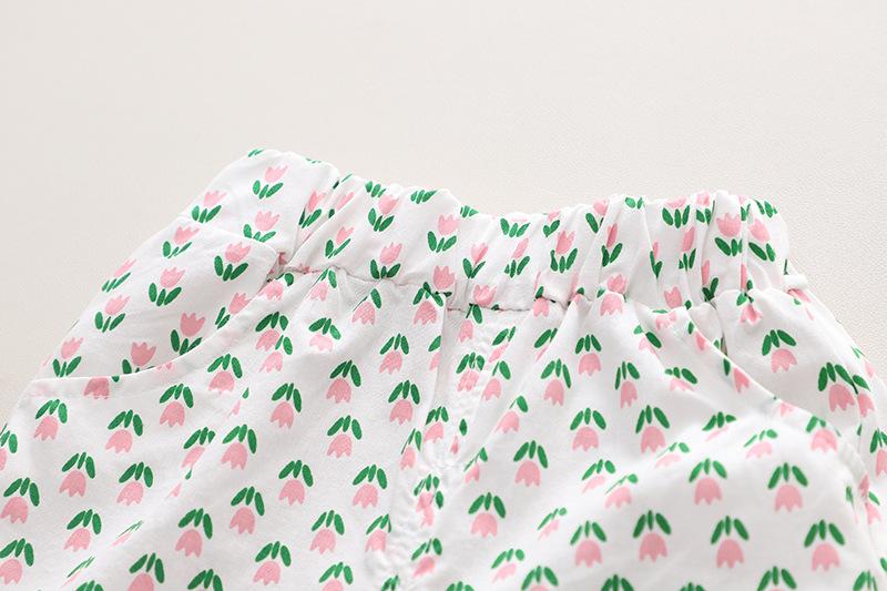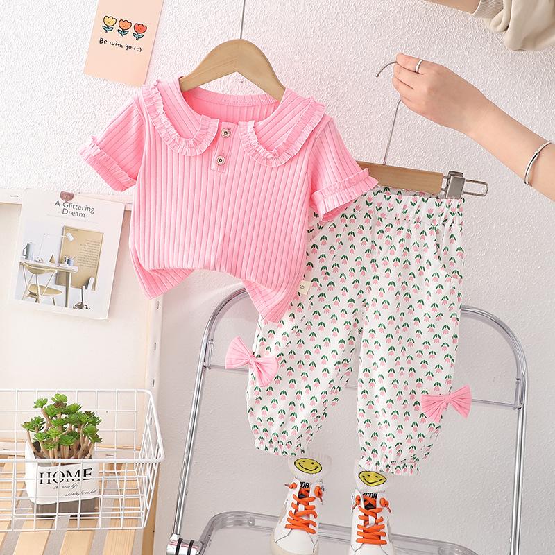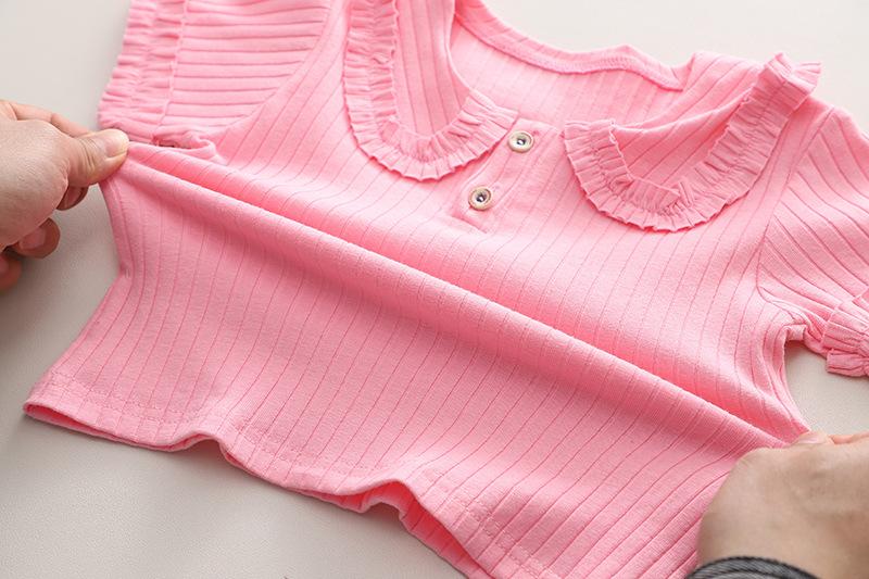 Traje de Manga Corta para Bebé Niña 2025 Verano Nuevo Estilo Niñas Estilo Coreano Color Puro Encaje Manga Corta Pantalón con Flores Pequeñas Conjunto de Dos Piezas