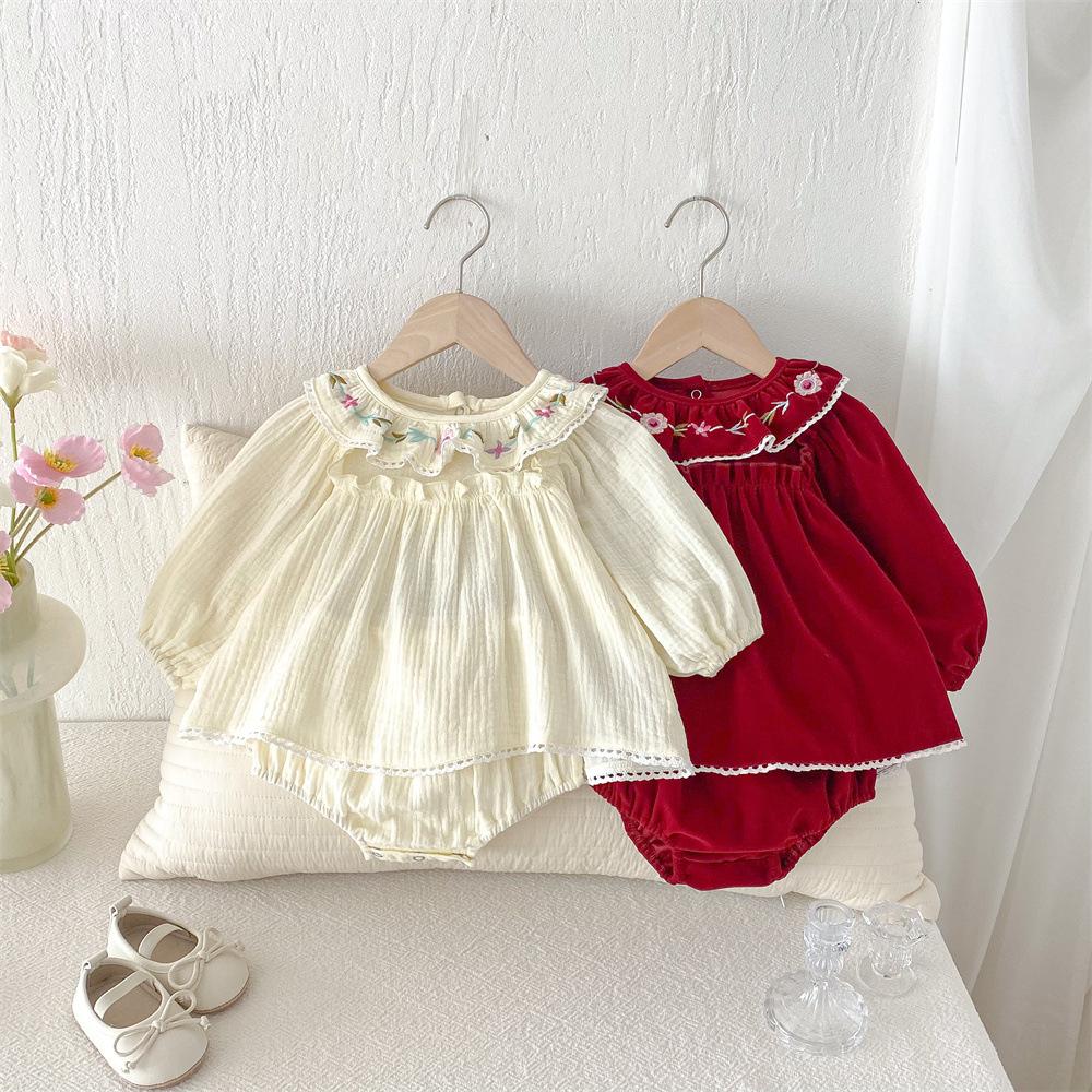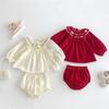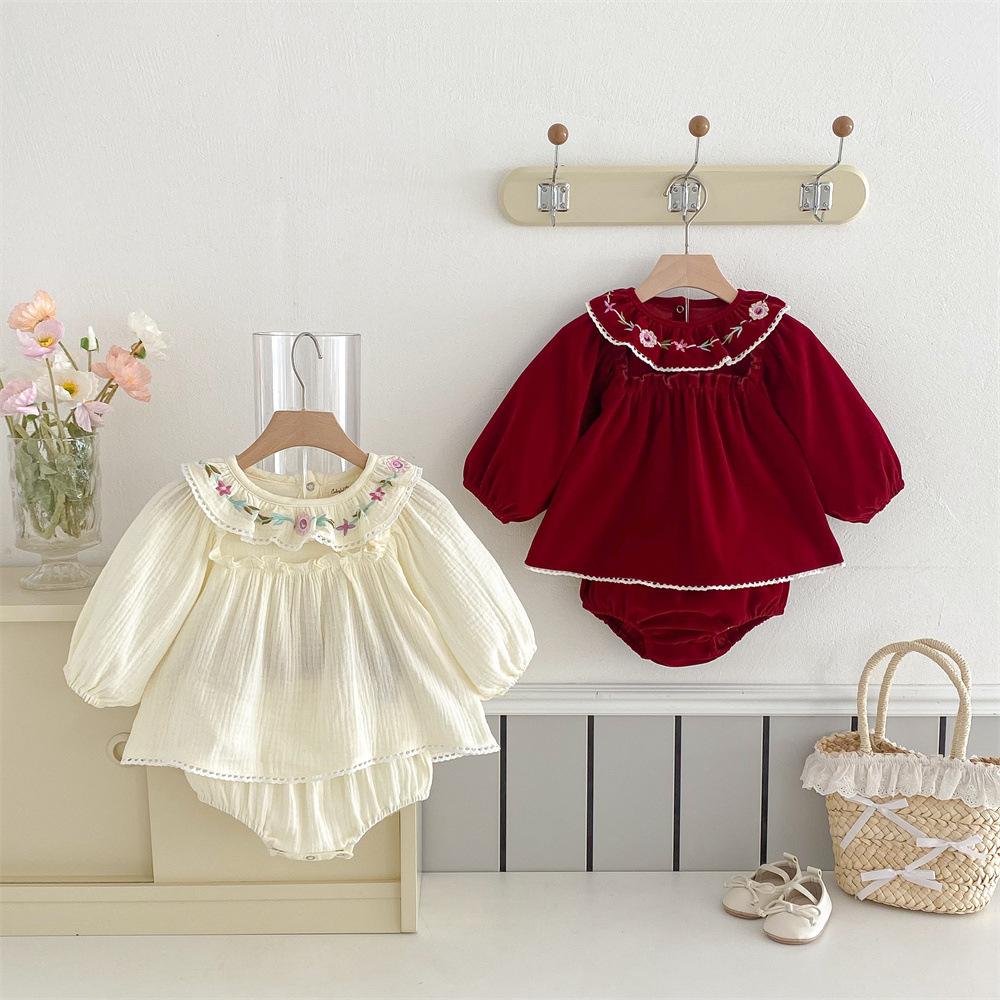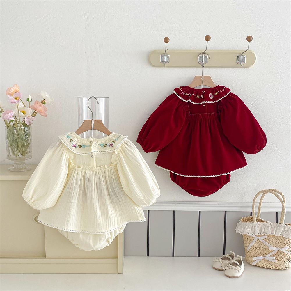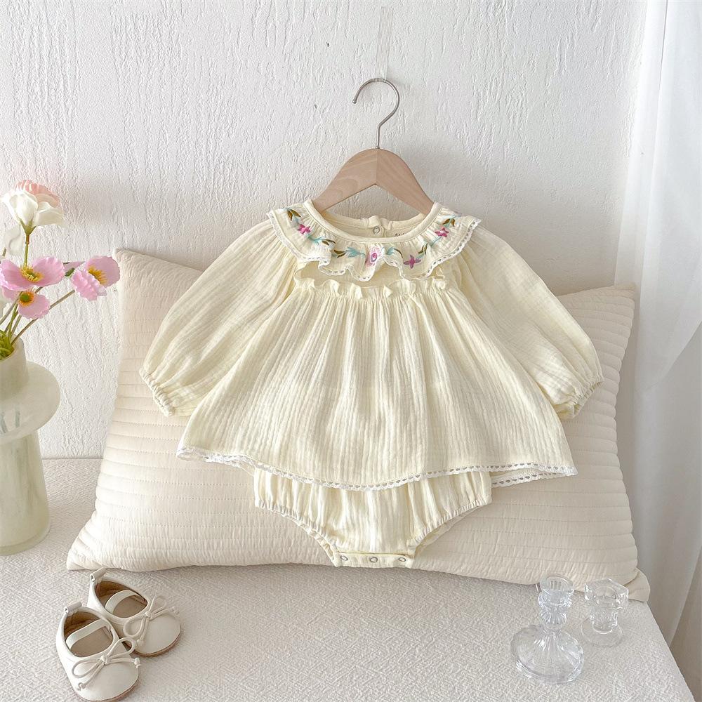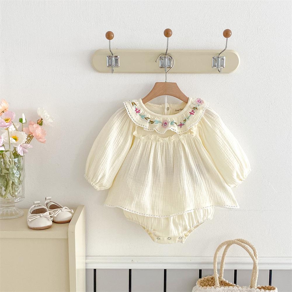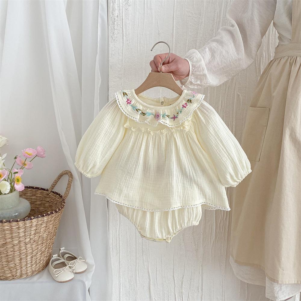 Traje para niñas estilo coreano Ins Primavera Bebé Manga Larga Camisa de Muñeca Bordada Pantalones Pan Dos Piezas Ropa de Bebé