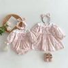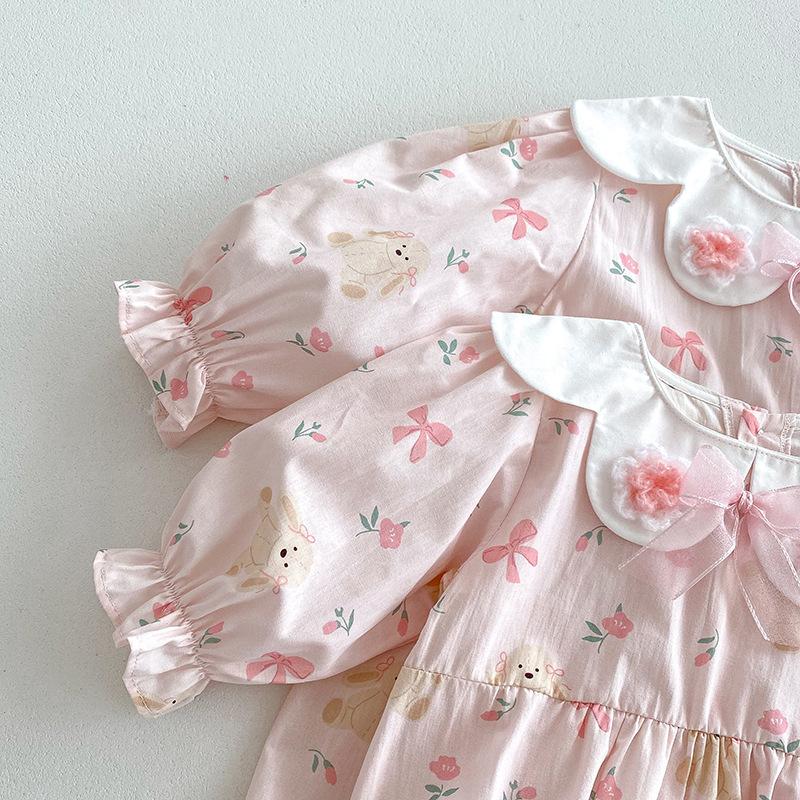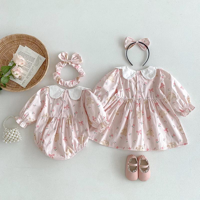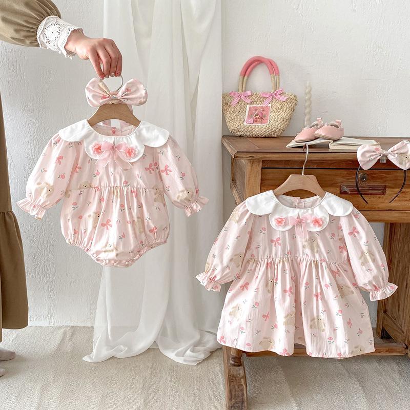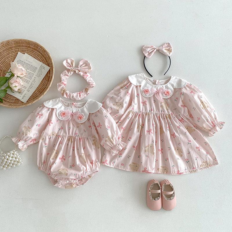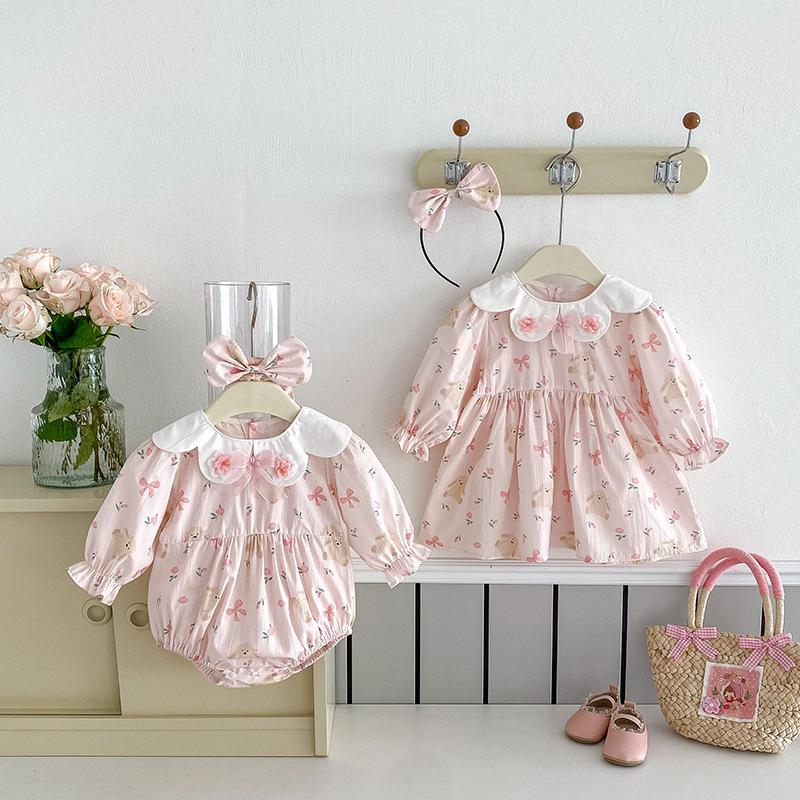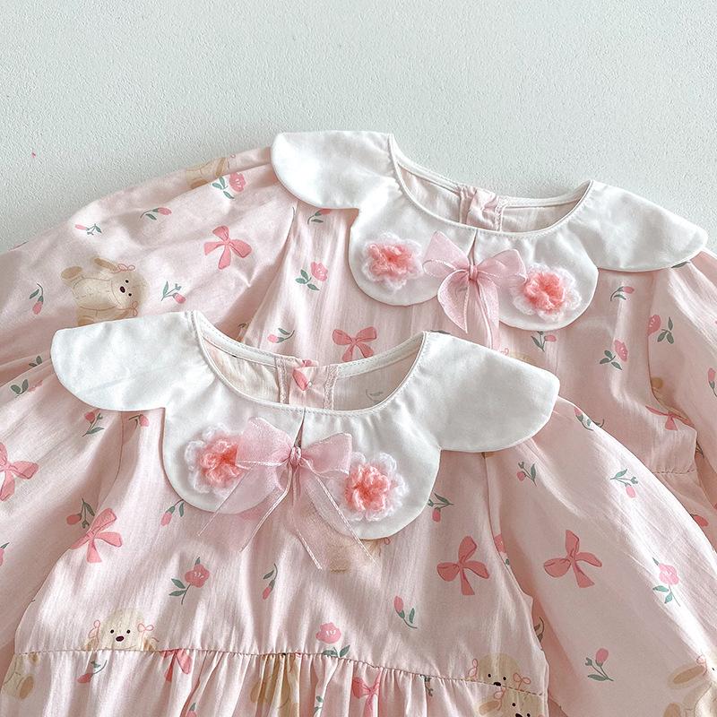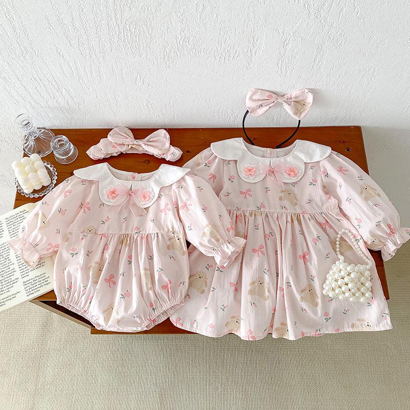25 Ropa de Otoño para Bebé Pelele Rosa Bebé con Lazo Vestido de Flores Tridimensionales Estilo Coreano para Niñas Traje de Hermana