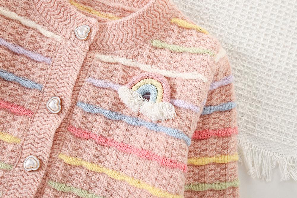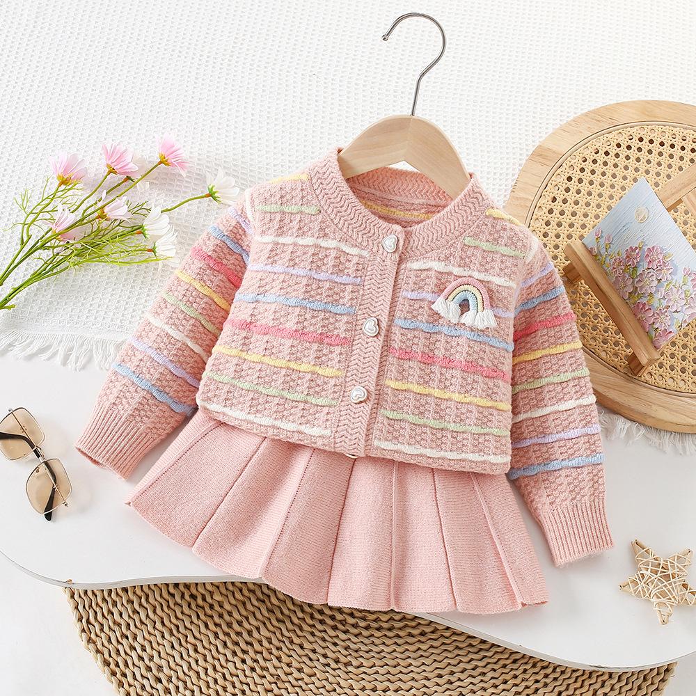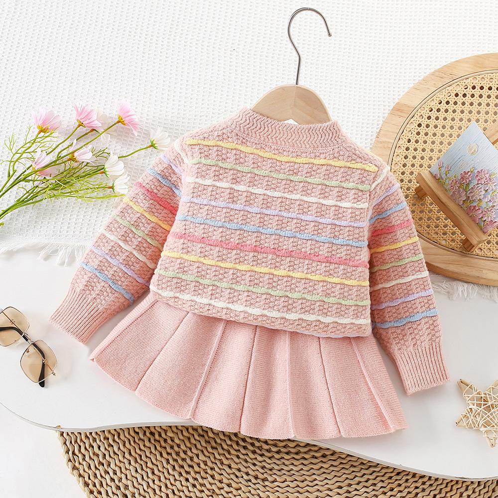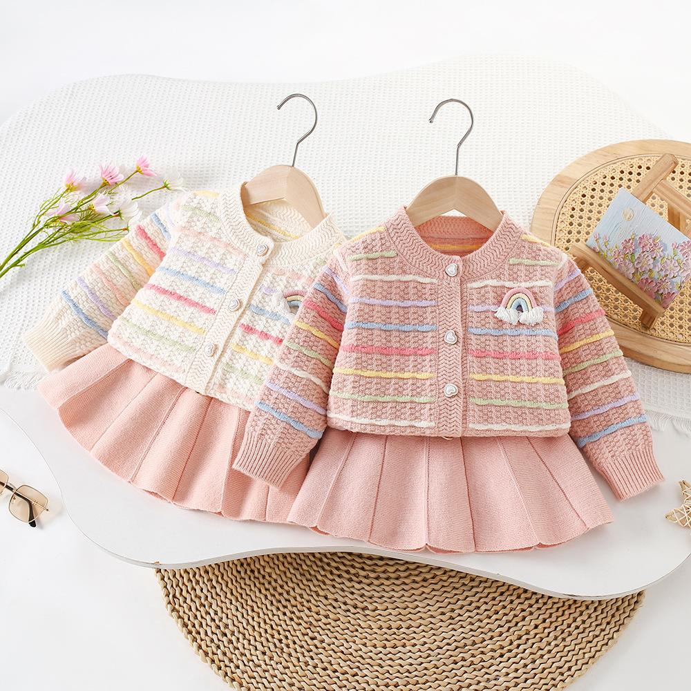 Conjunto de Suéter para Niña Otoño e Invierno Nuevo Bebé Niña Rayas Arcoíris Falda de Punto Estilo Coreano Suéter Chaqueta de Moda Trendy