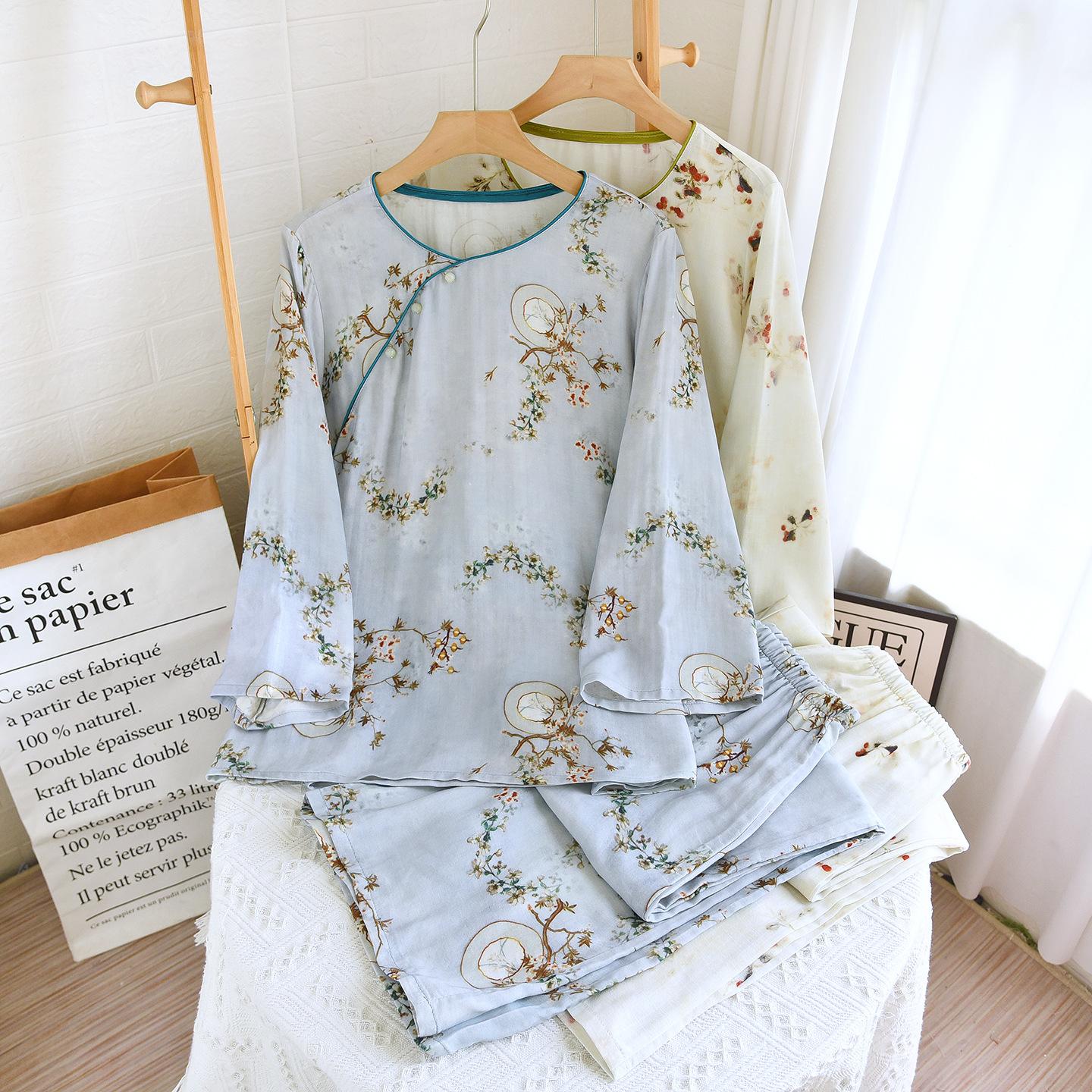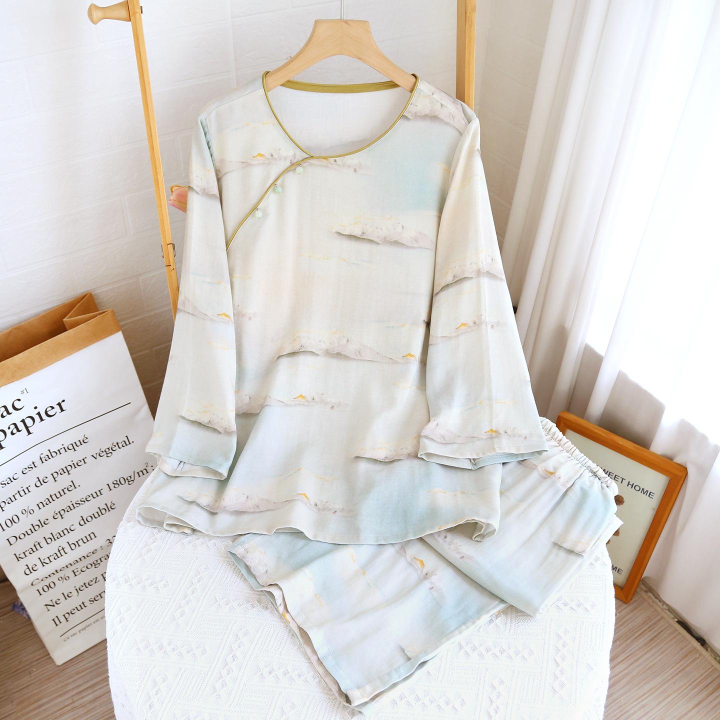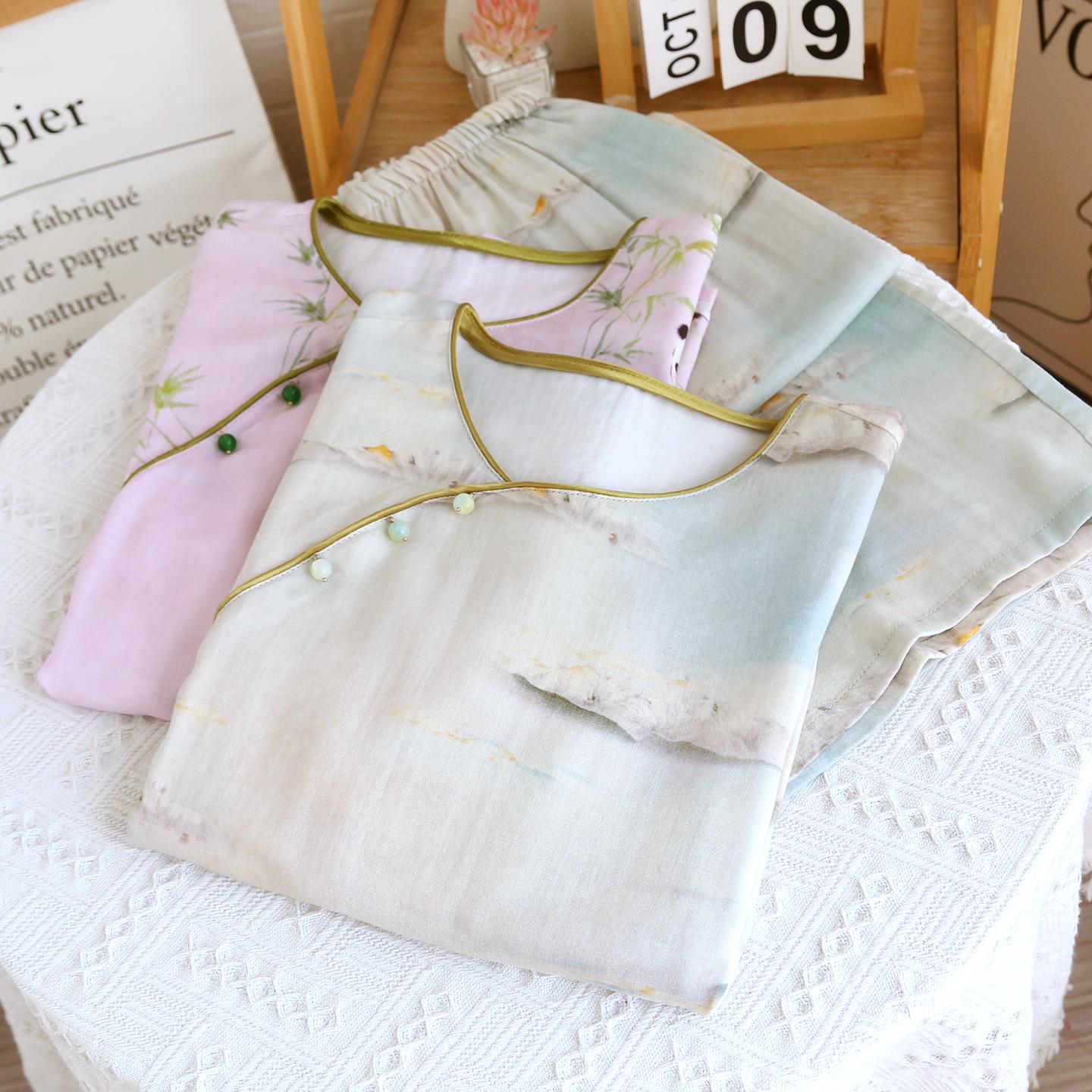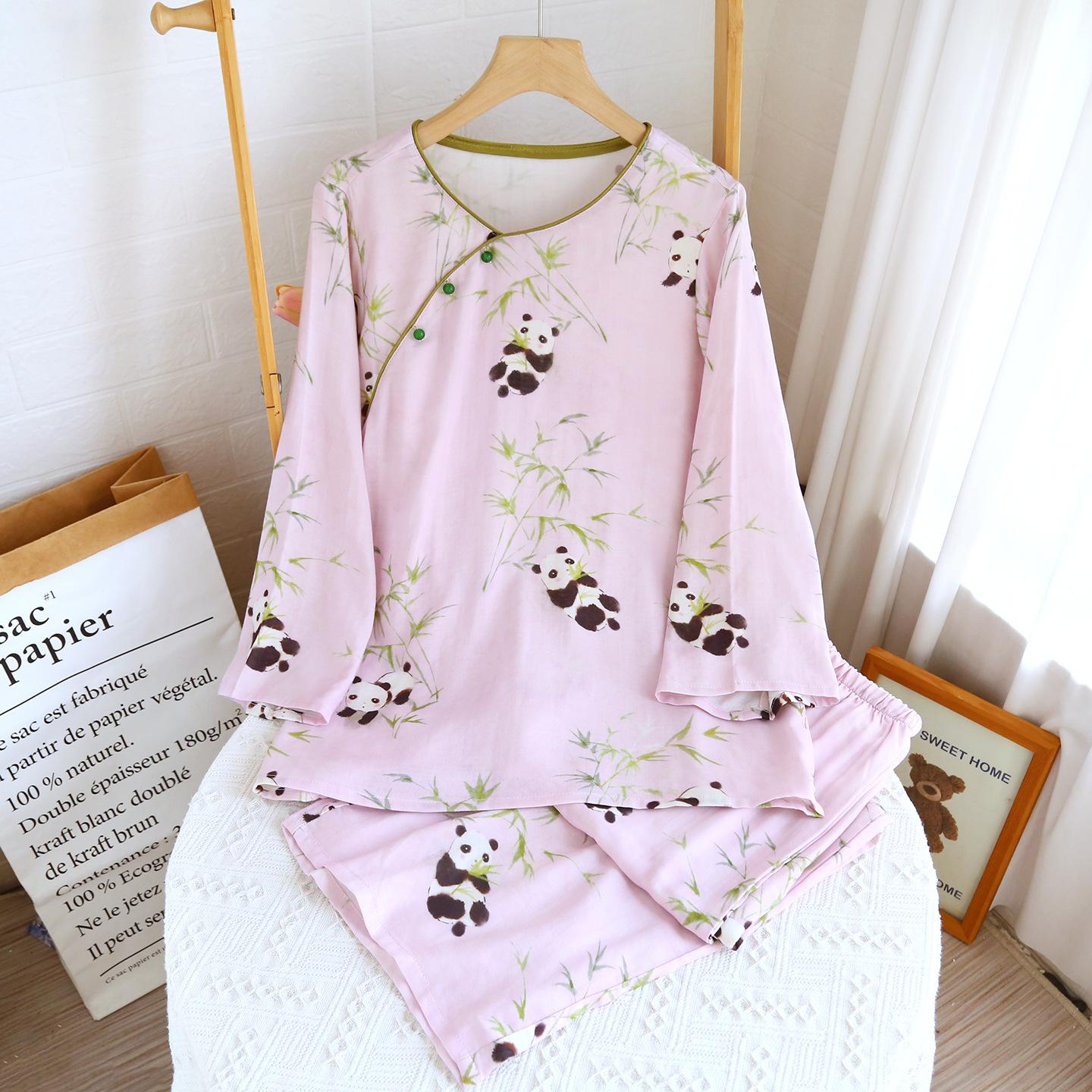 Pijama de Estilo Chino Nuevo Conjunto de Dos Piezas Transpirable Holgado Traje de Verano para Mujer Retro Talla Grande Fibra de Bambú Ropa para el Hogar