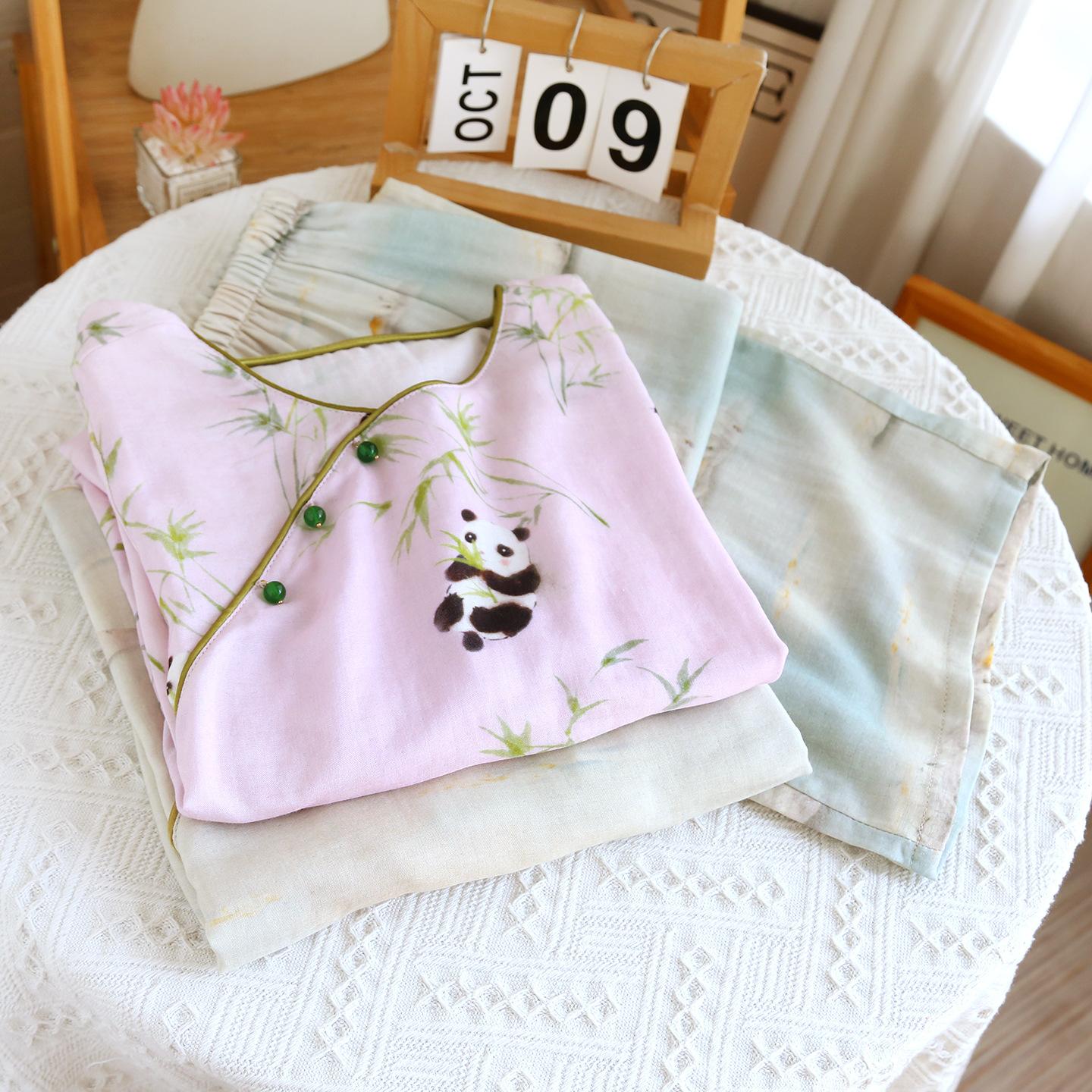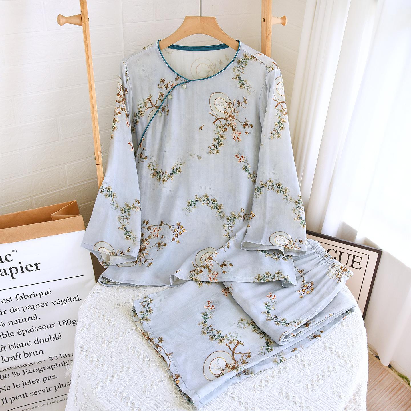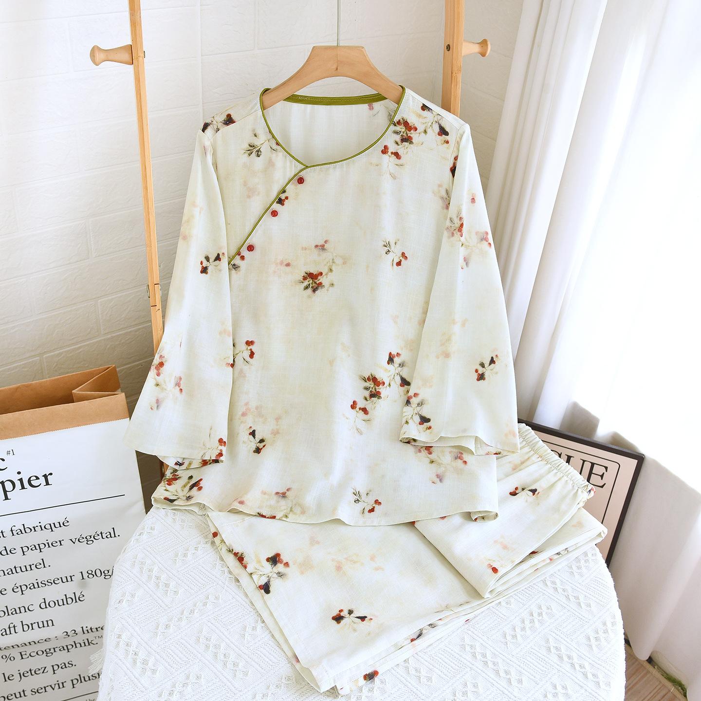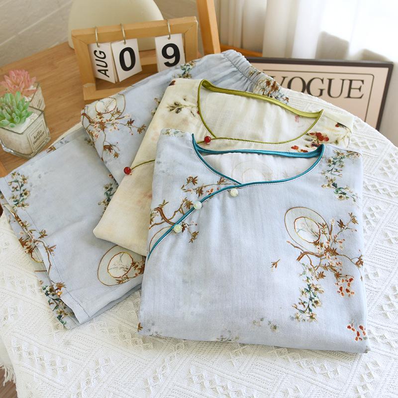 Pijama de Estilo Chino Nuevo Conjunto de Dos Piezas Transpirable Holgado Traje de Verano para Mujer Retro Talla Grande Fibra de Bambú Ropa para el Hogar