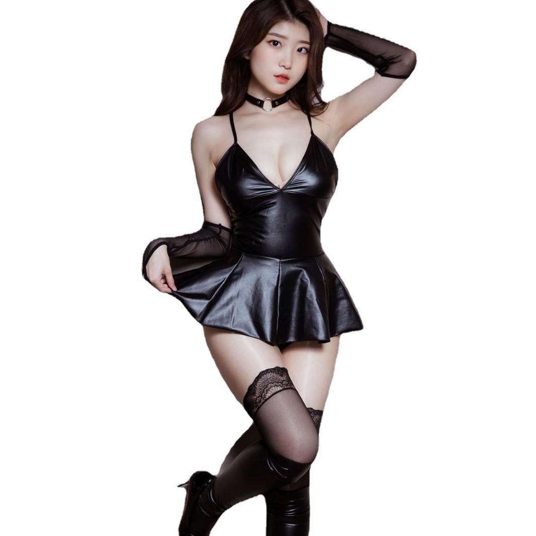 Lencería Sexy con Tirantes de PU, Minifalda de Cuero, Uniforme, Coqueteo Caliente, Tentación Apasionada Ropa de Dormir al por Mayor