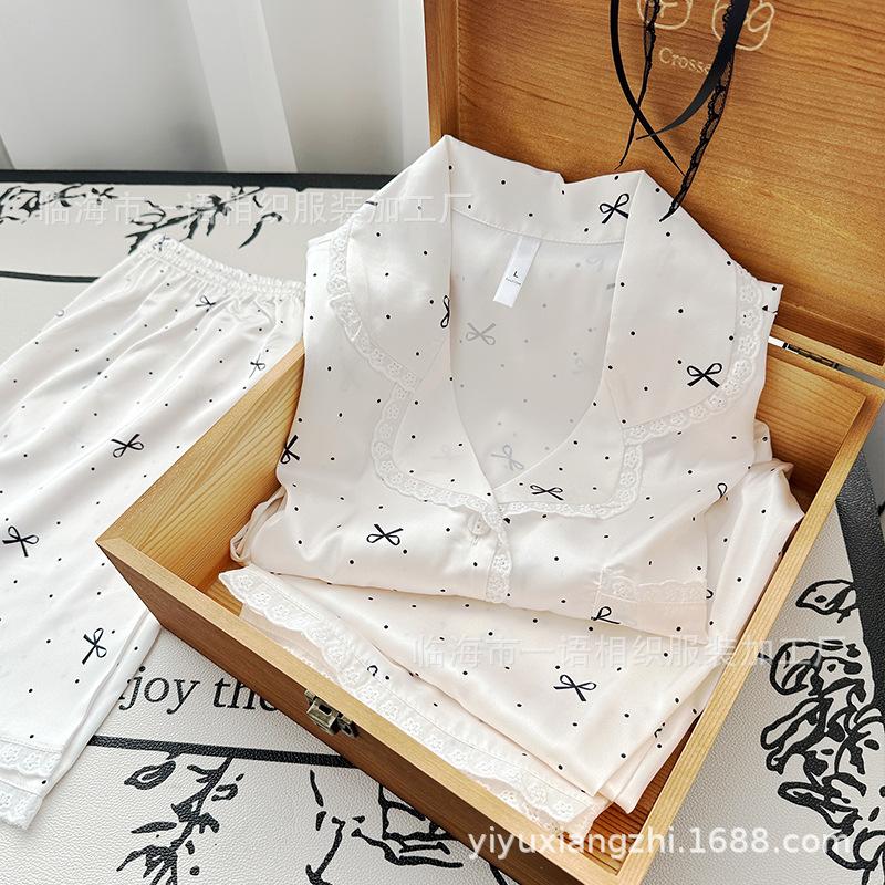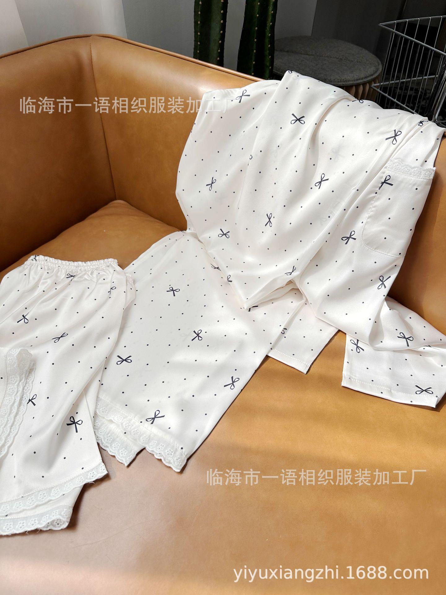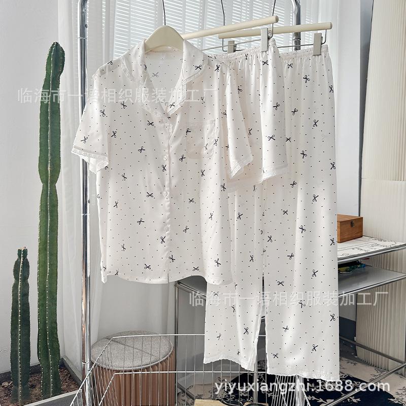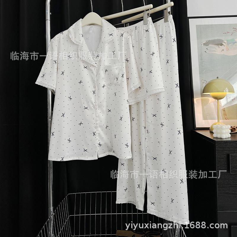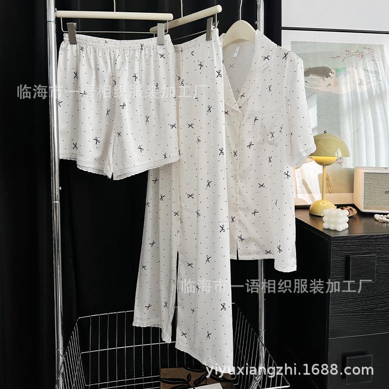 Primavera y Verano Nuevo Set de Tres Piezas de Algodón Encaje Lazo Pijama de Seda Helada para Mujer Solapa Sencillo Cómodo Ropa de Casa para Mujer