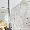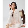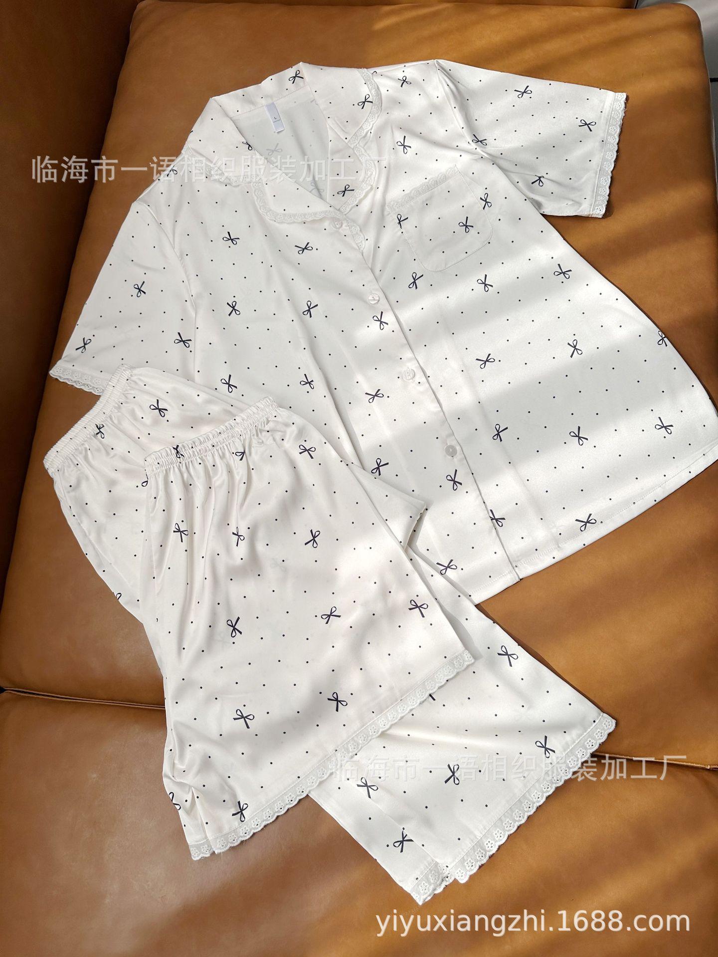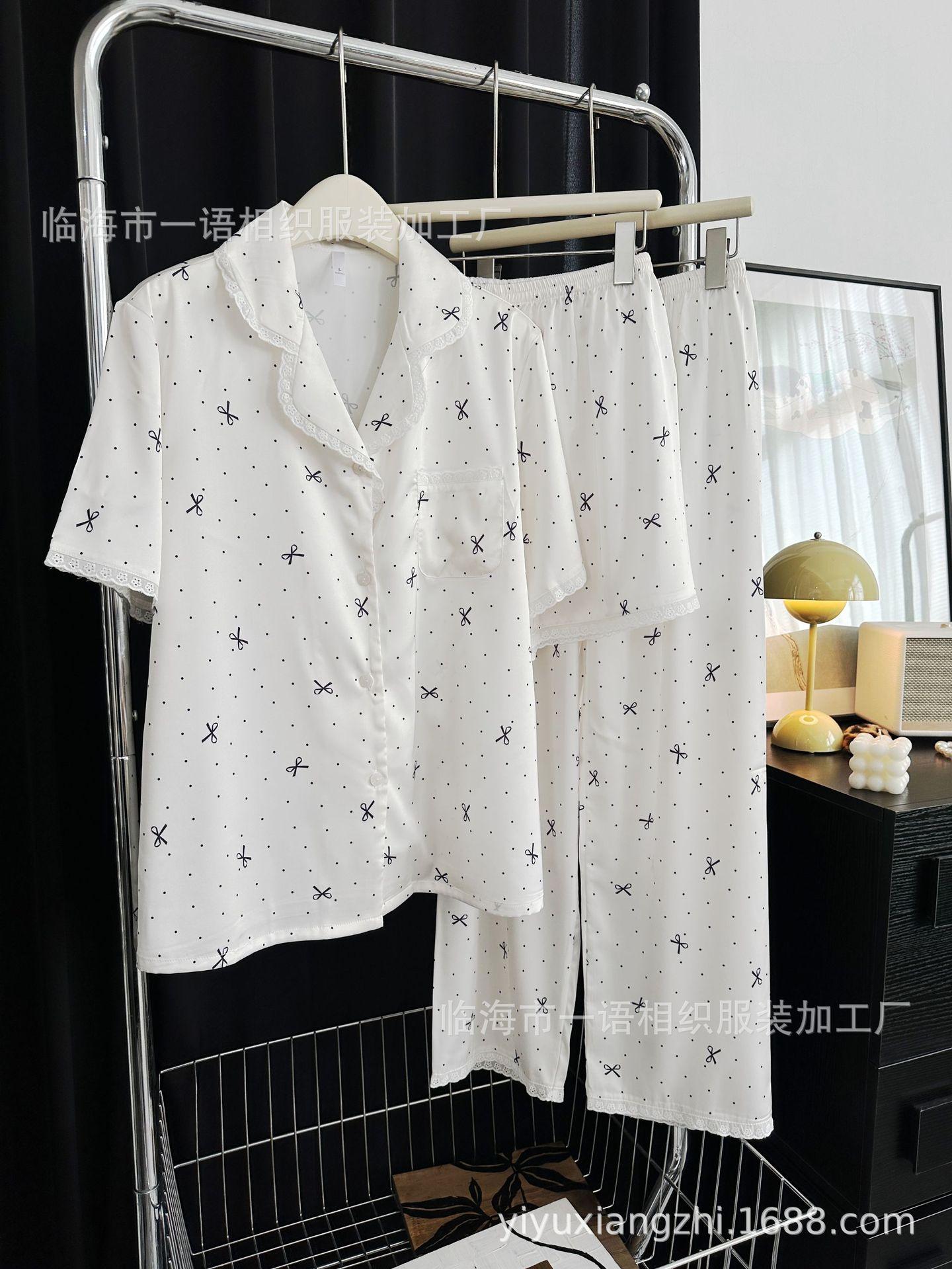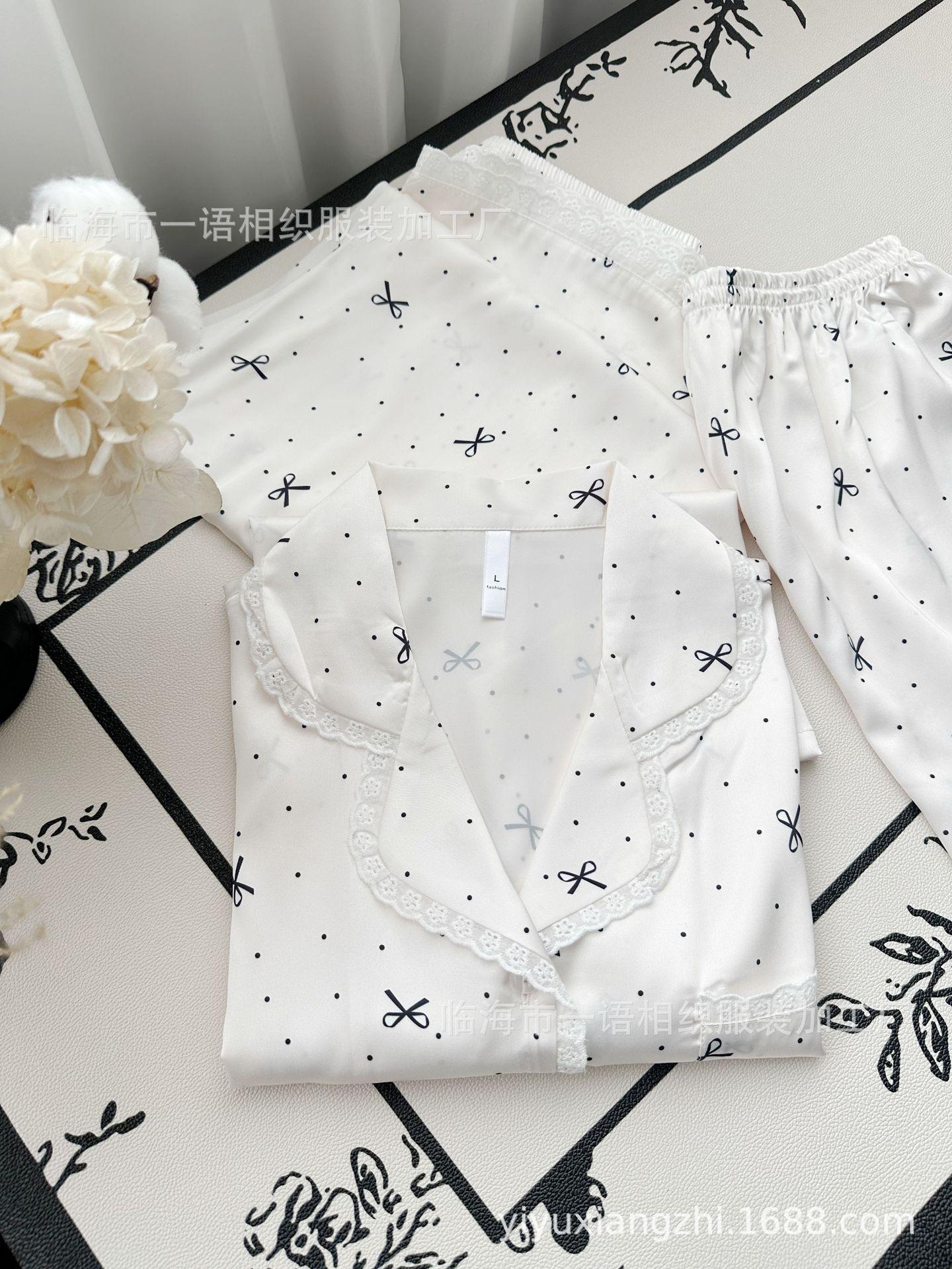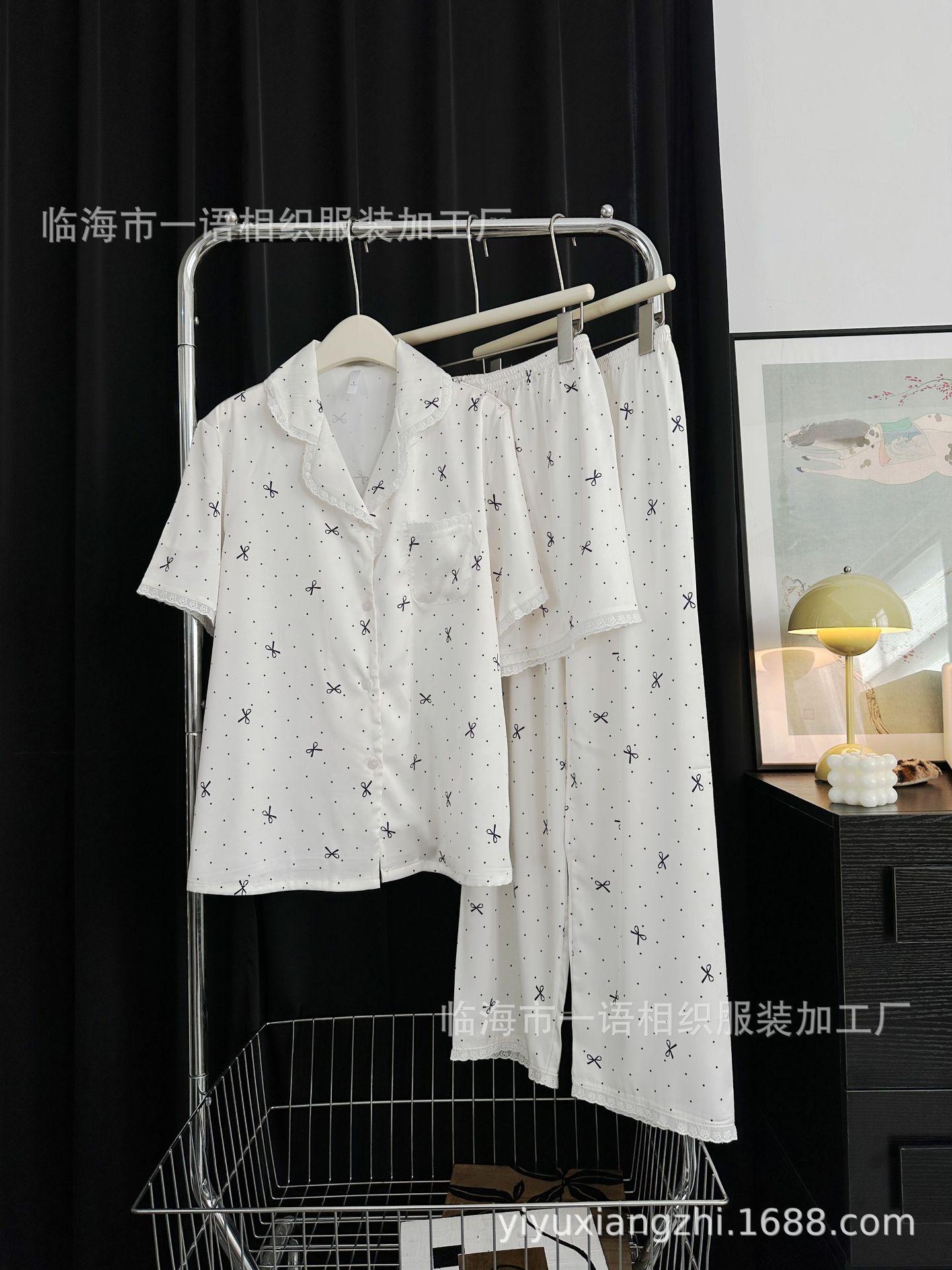 Primavera y Verano Nuevo Set de Tres Piezas de Algodón Encaje Lazo Pijama de Seda Helada para Mujer Solapa Sencillo Cómodo Ropa de Casa para Mujer