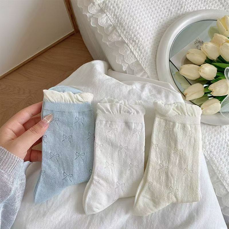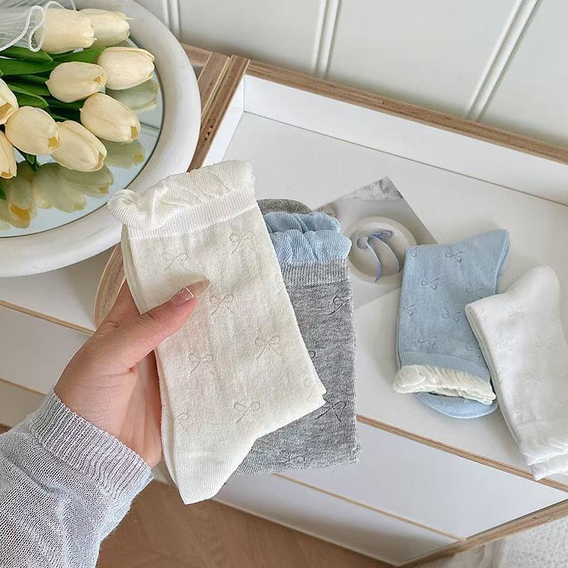 Calcetines finos huecos con lazo de media pantorrilla para mujer para primavera y verano, calcetines de felpa transpirables y absorbentes del sudor para niñas, medias estilo japonés con boca de burbuja
