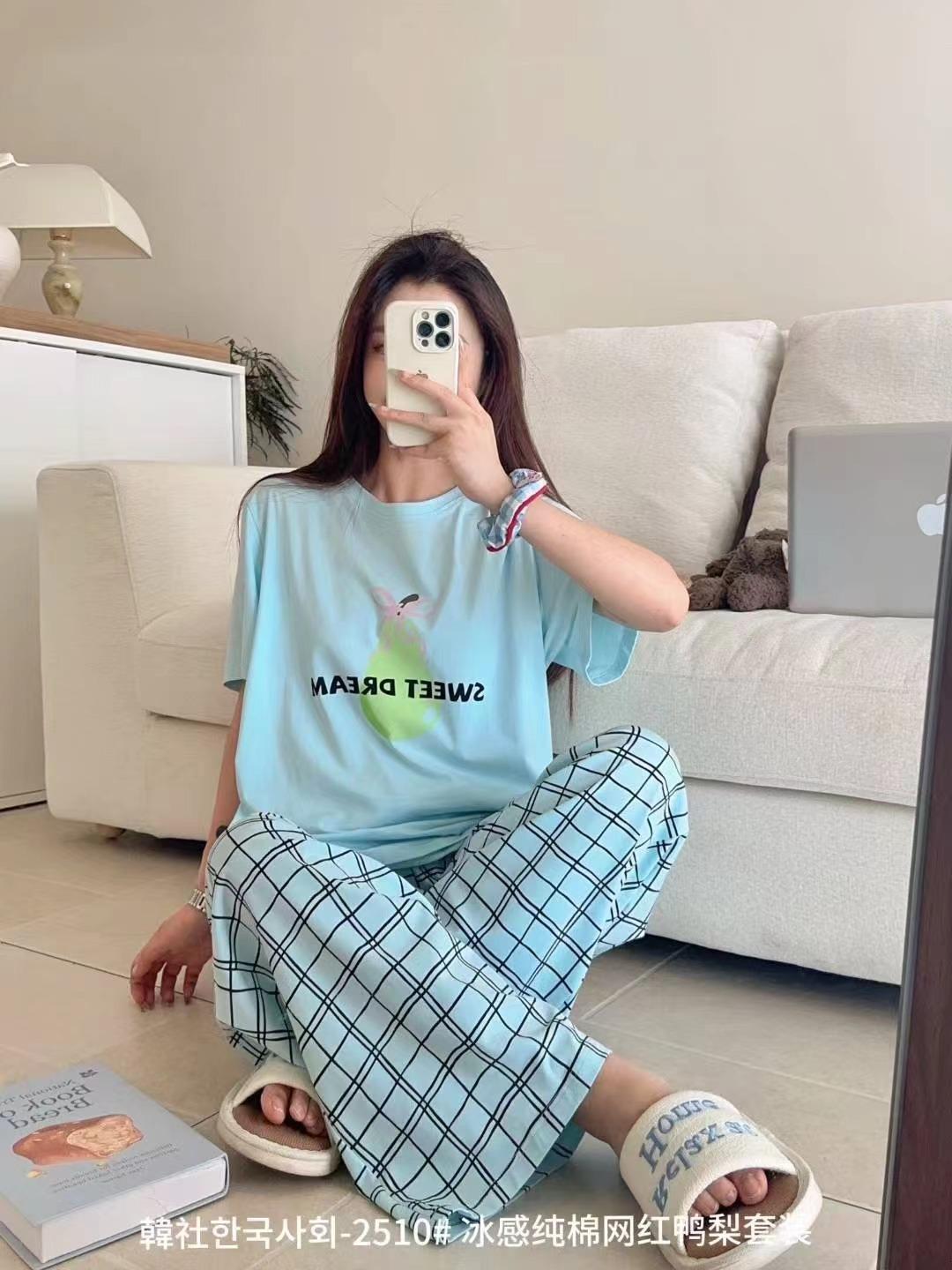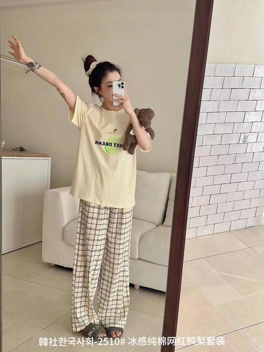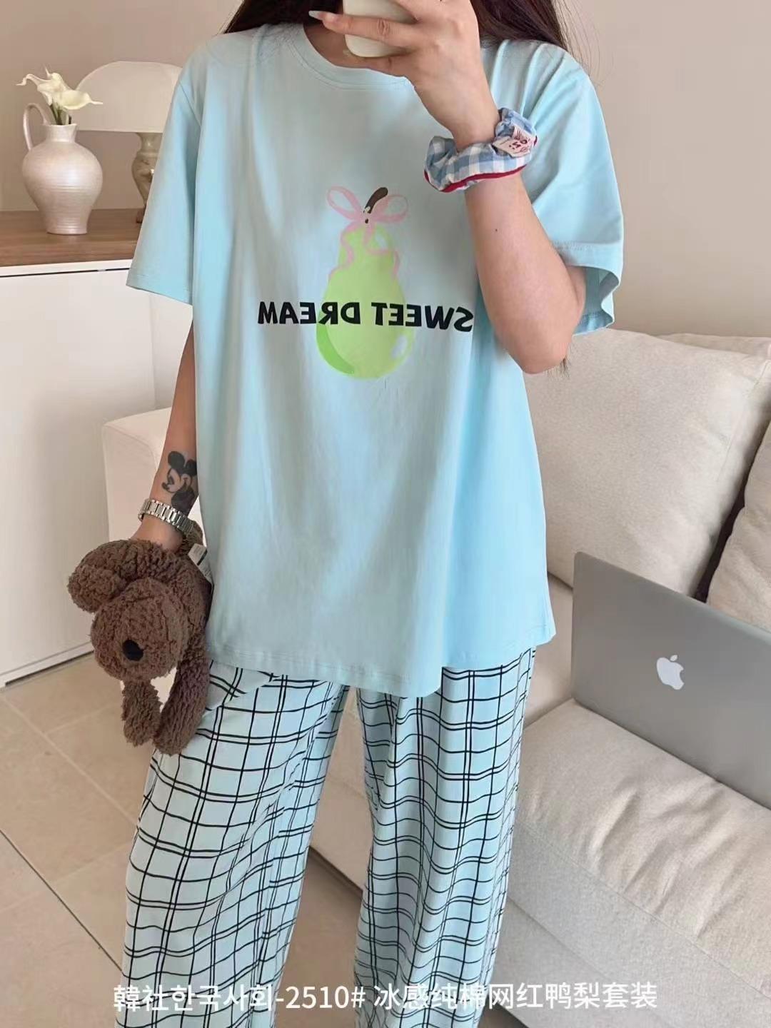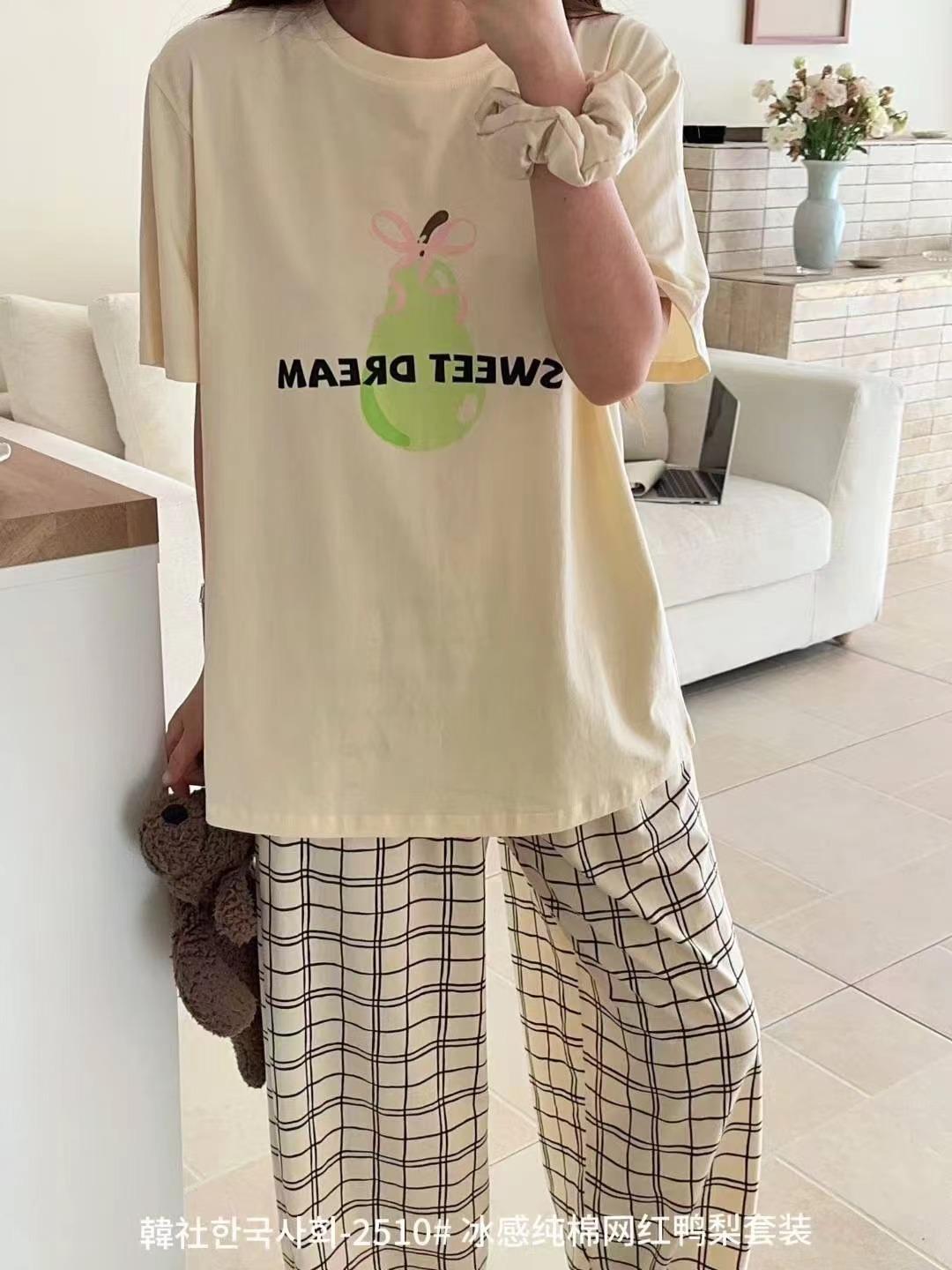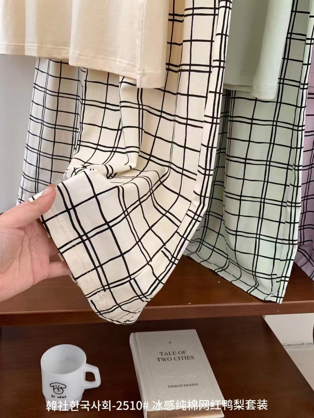 Compra 2510 Conjunto de Roupa de Casa de Algodão Puro com Sensação de Gelo Coreano para Celebridades da Internet Verão Feminino Xadrez Gola Redonda Manga Curta Pijama Transfronteiriço al por mayor en Joom.pro