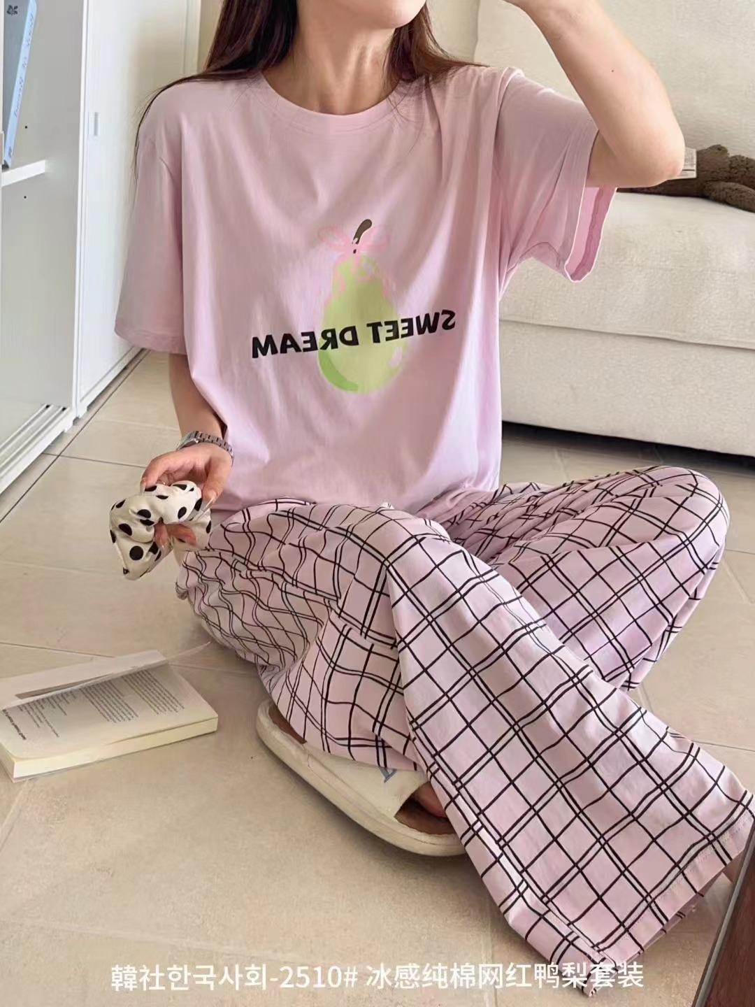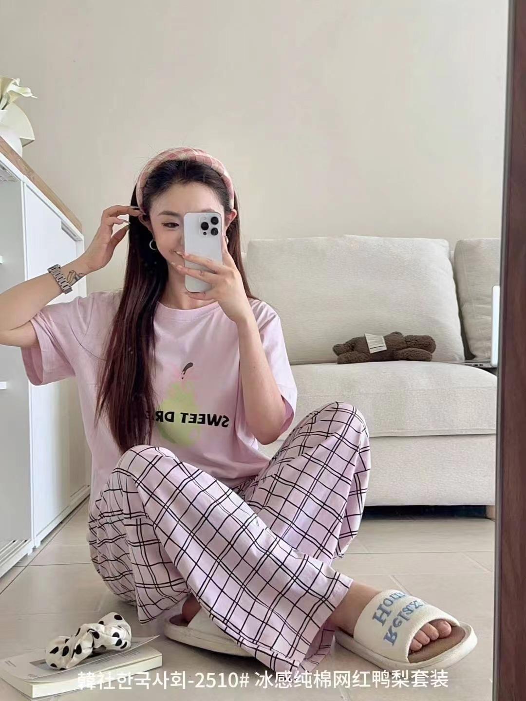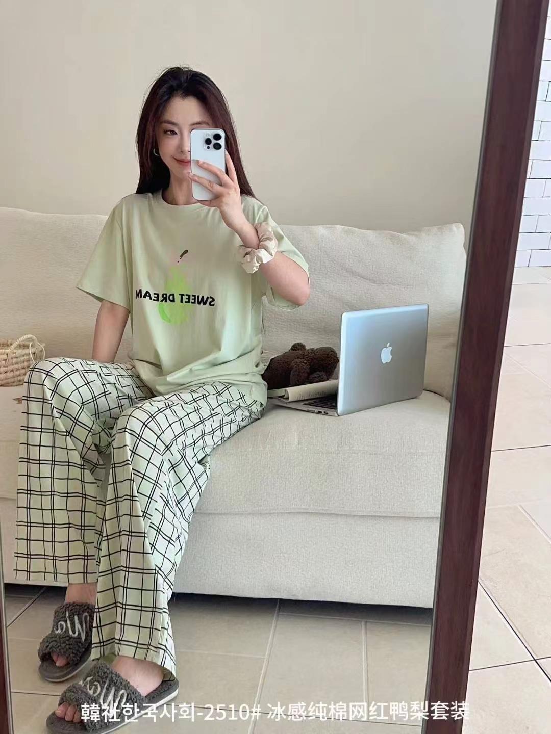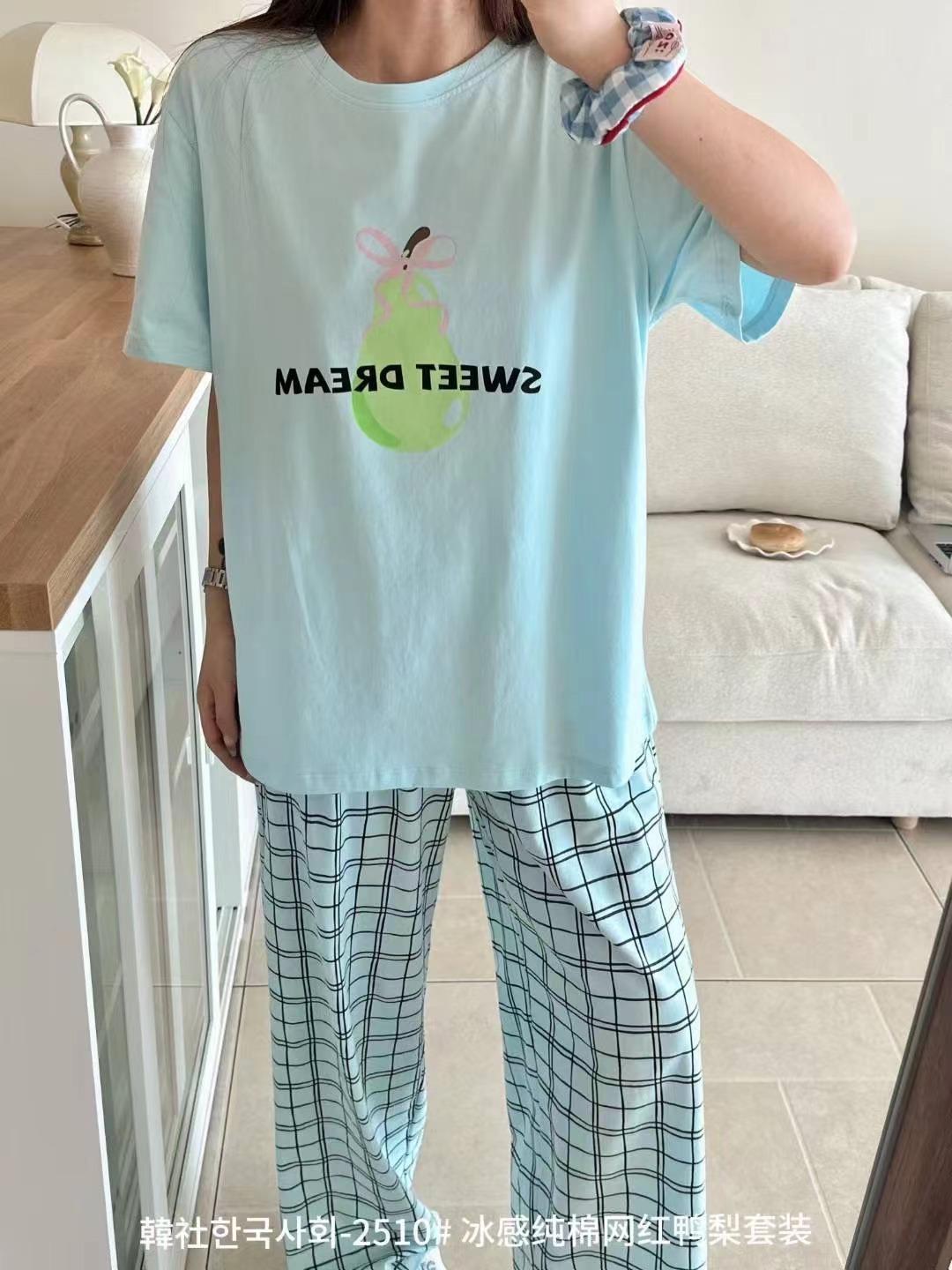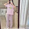 Compra 2510 Conjunto de Roupa de Casa de Algodão Puro com Sensação de Gelo Coreano para Celebridades da Internet Verão Feminino Xadrez Gola Redonda Manga Curta Pijama Transfronteiriço al por mayor en Joom.pro