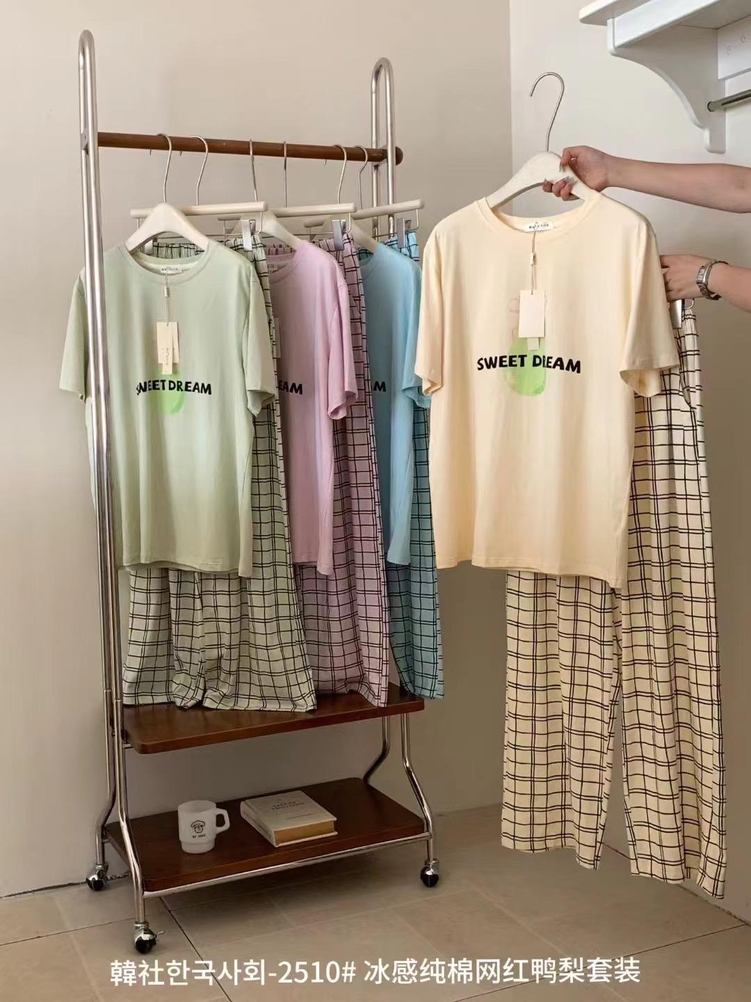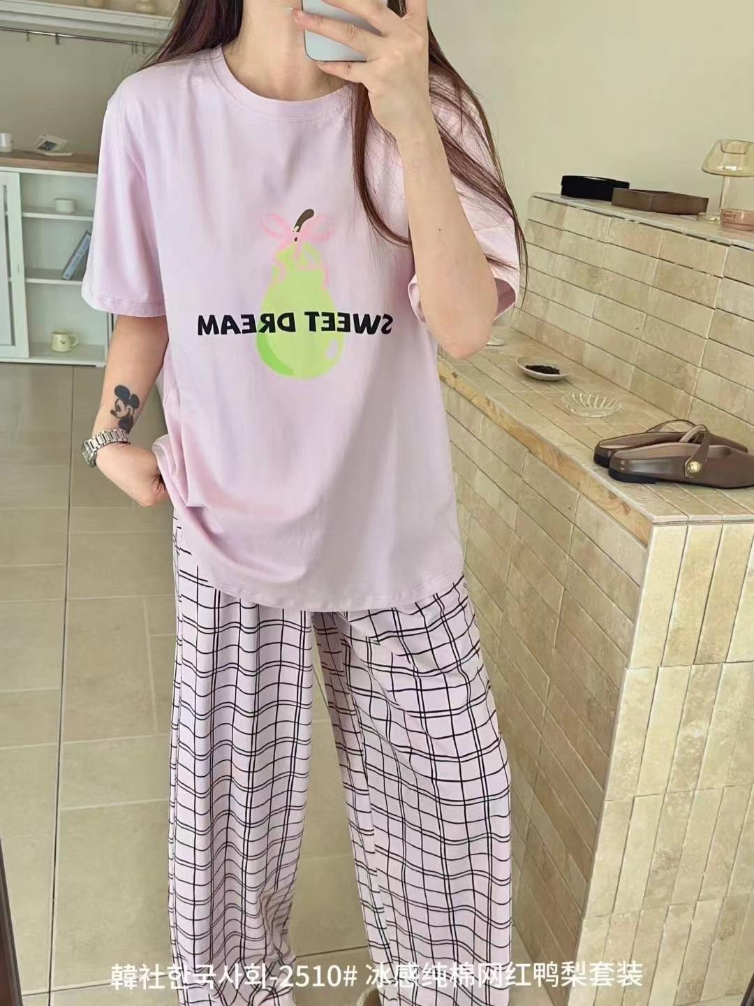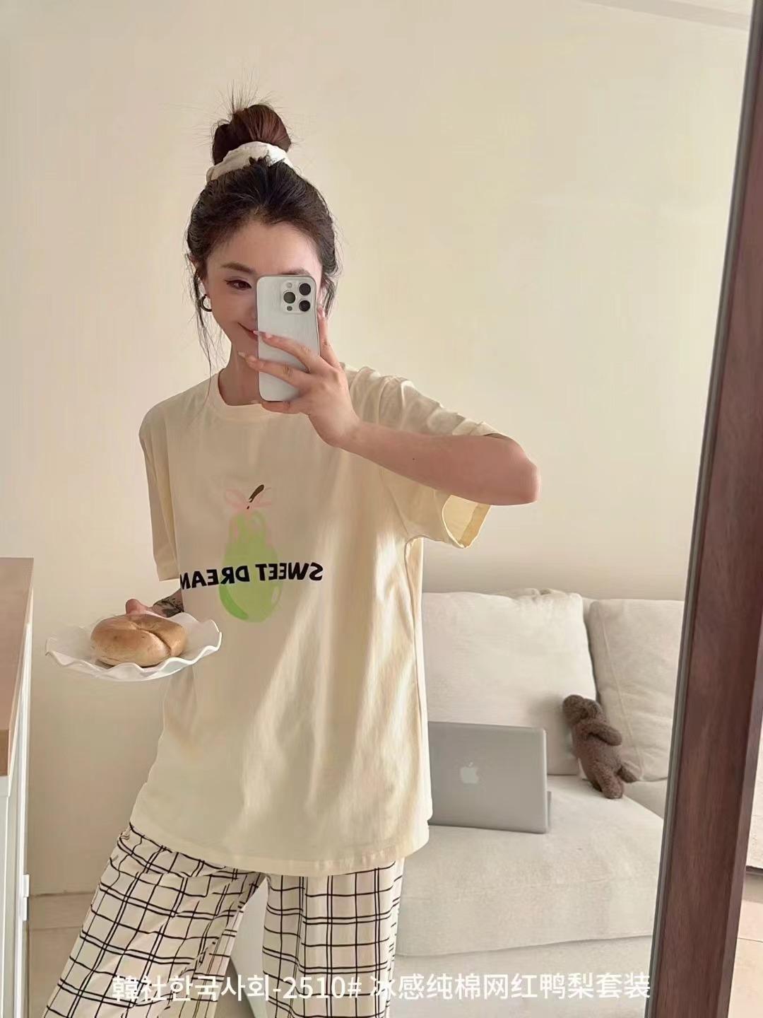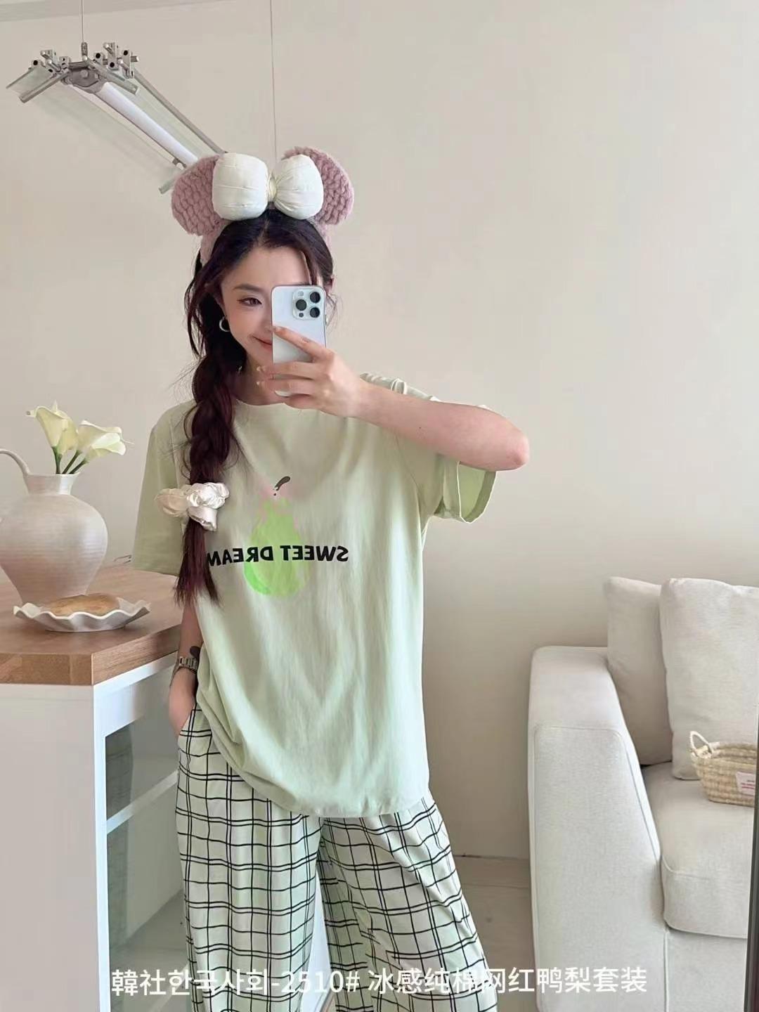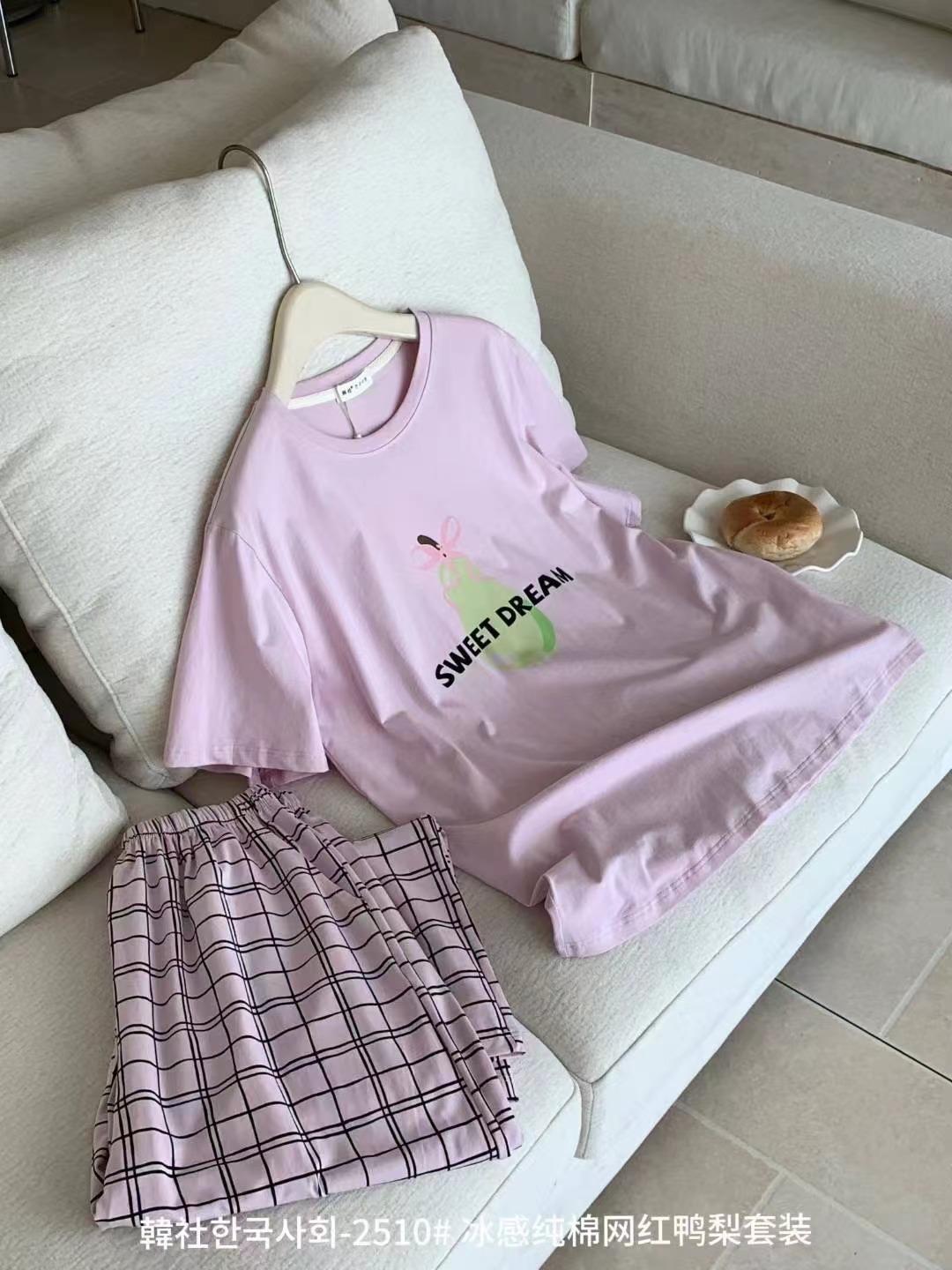 Compra 2510 Conjunto de Roupa de Casa de Algodão Puro com Sensação de Gelo Coreano para Celebridades da Internet Verão Feminino Xadrez Gola Redonda Manga Curta Pijama Transfronteiriço al por mayor en Joom.pro