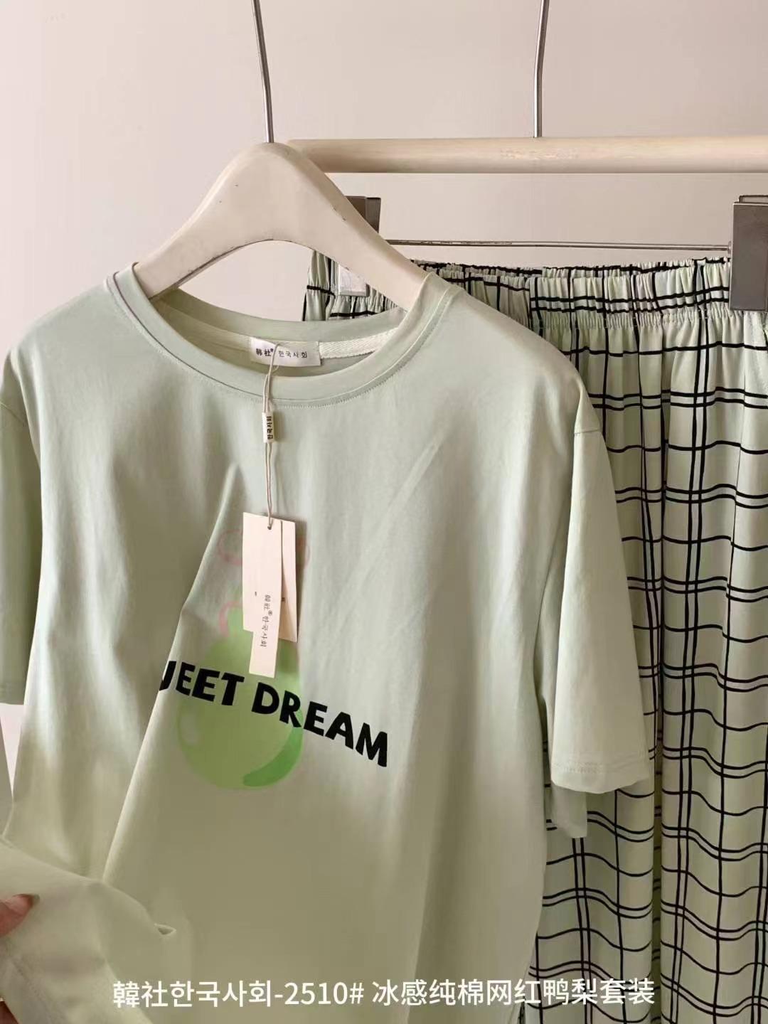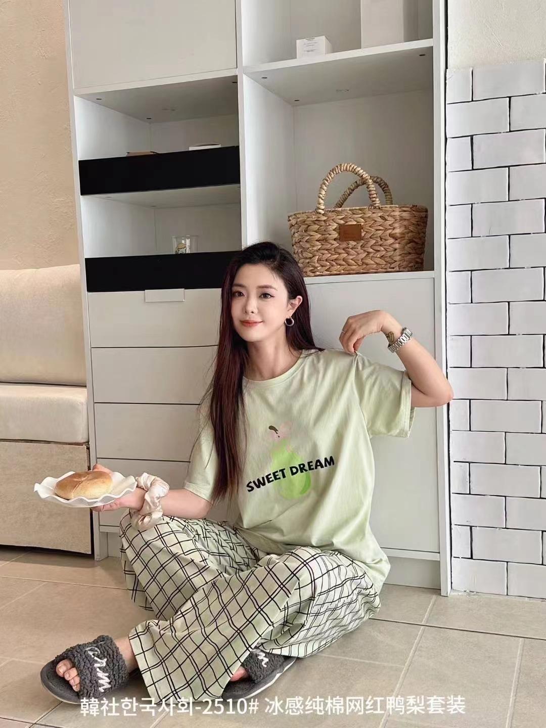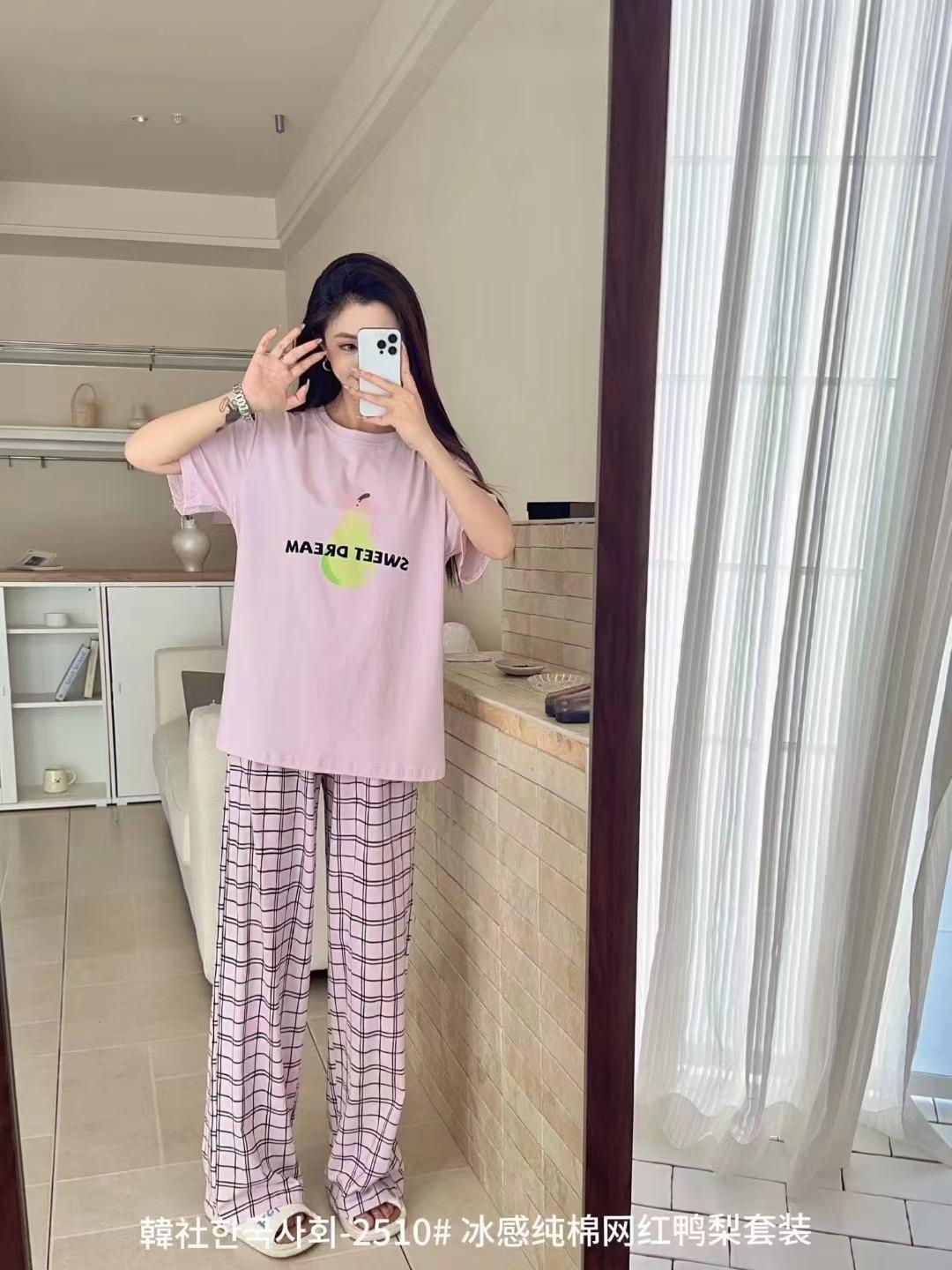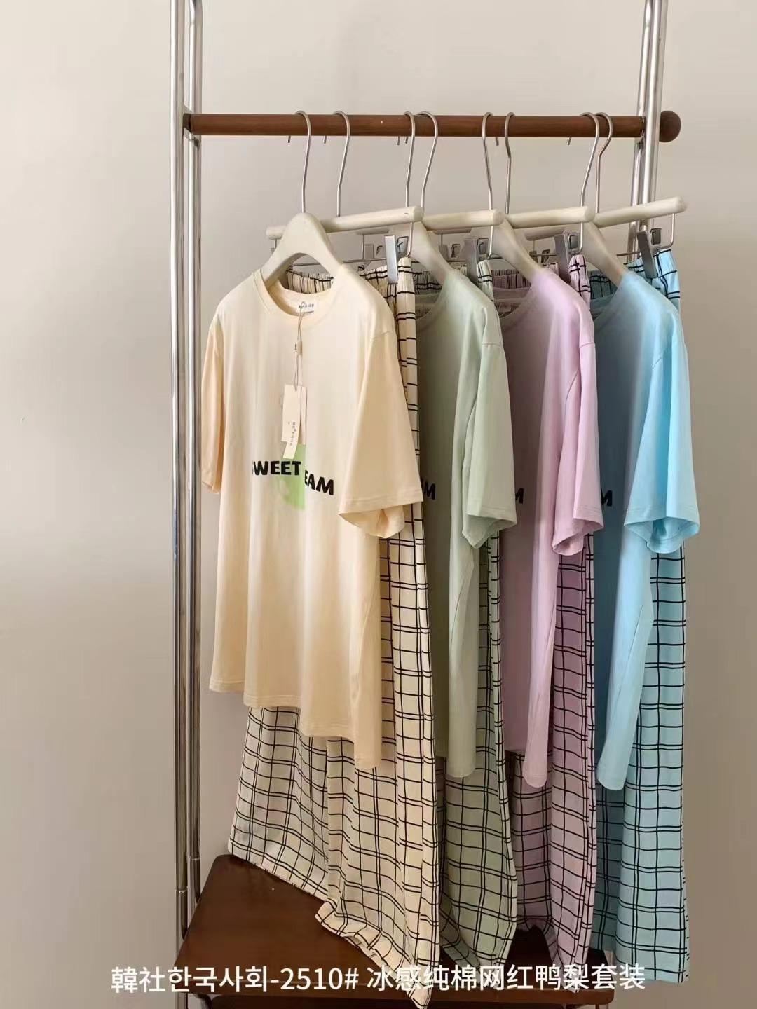 Compra 2510 Conjunto de Roupa de Casa de Algodão Puro com Sensação de Gelo Coreano para Celebridades da Internet Verão Feminino Xadrez Gola Redonda Manga Curta Pijama Transfronteiriço al por mayor en Joom.pro