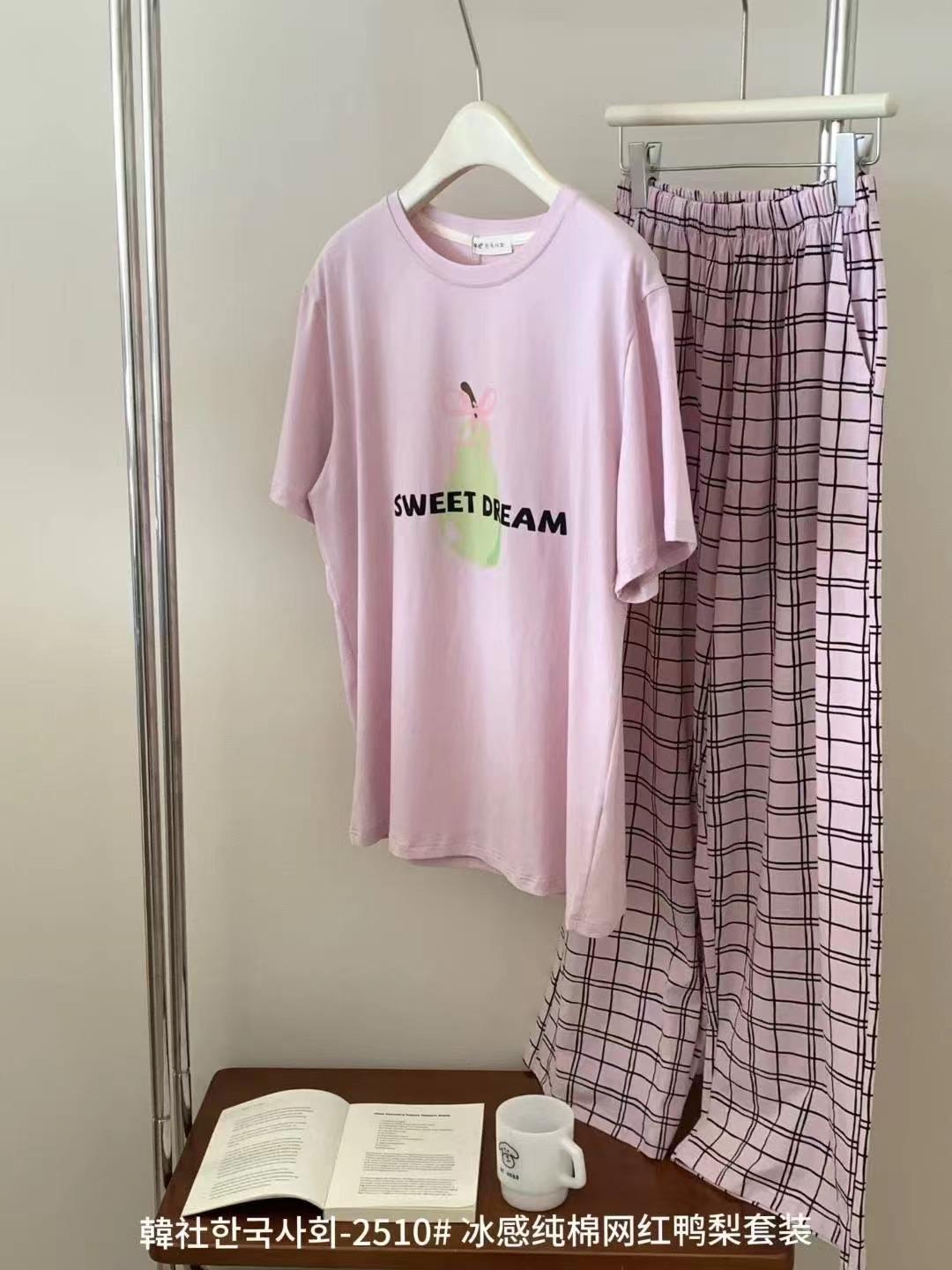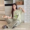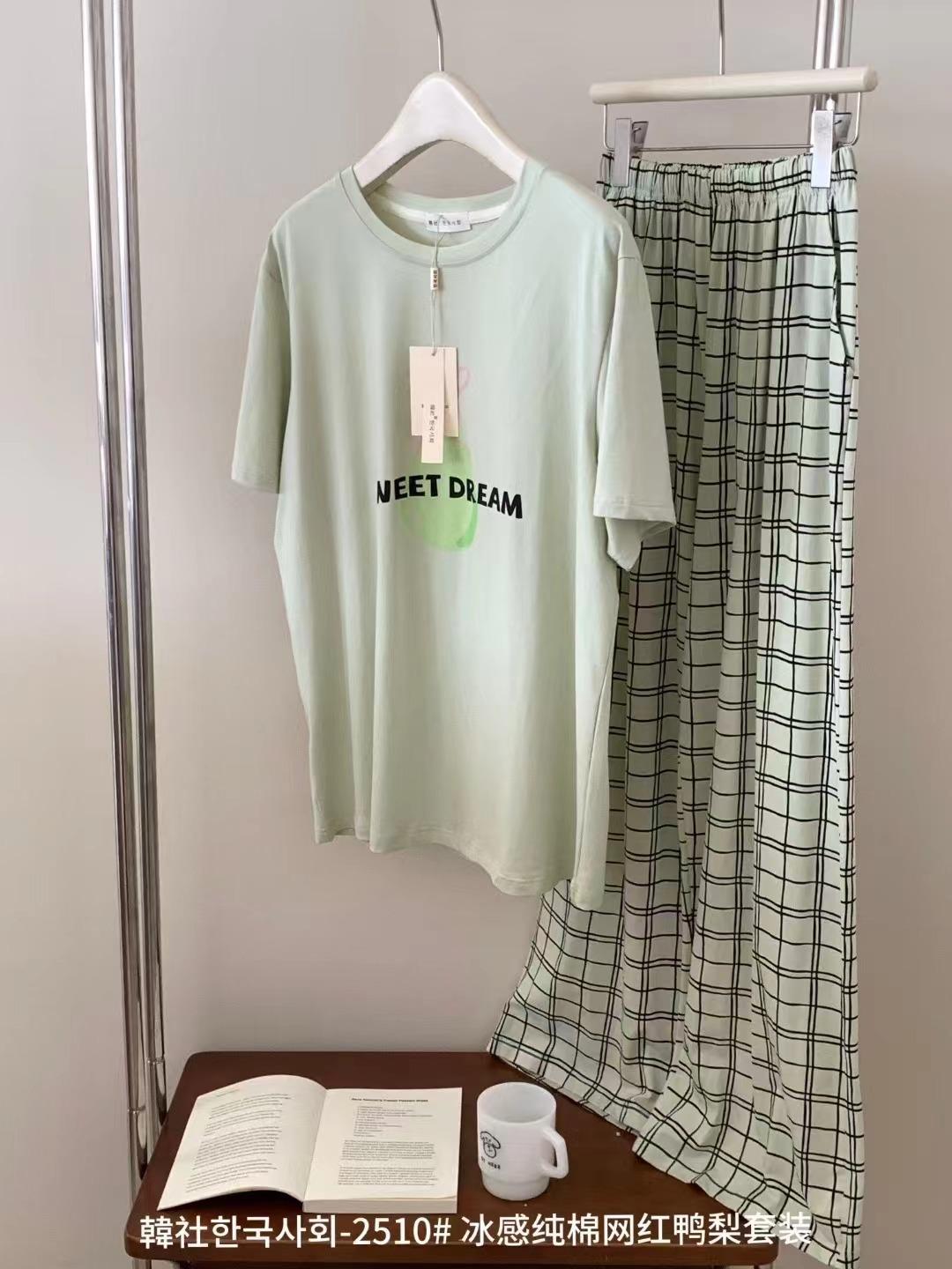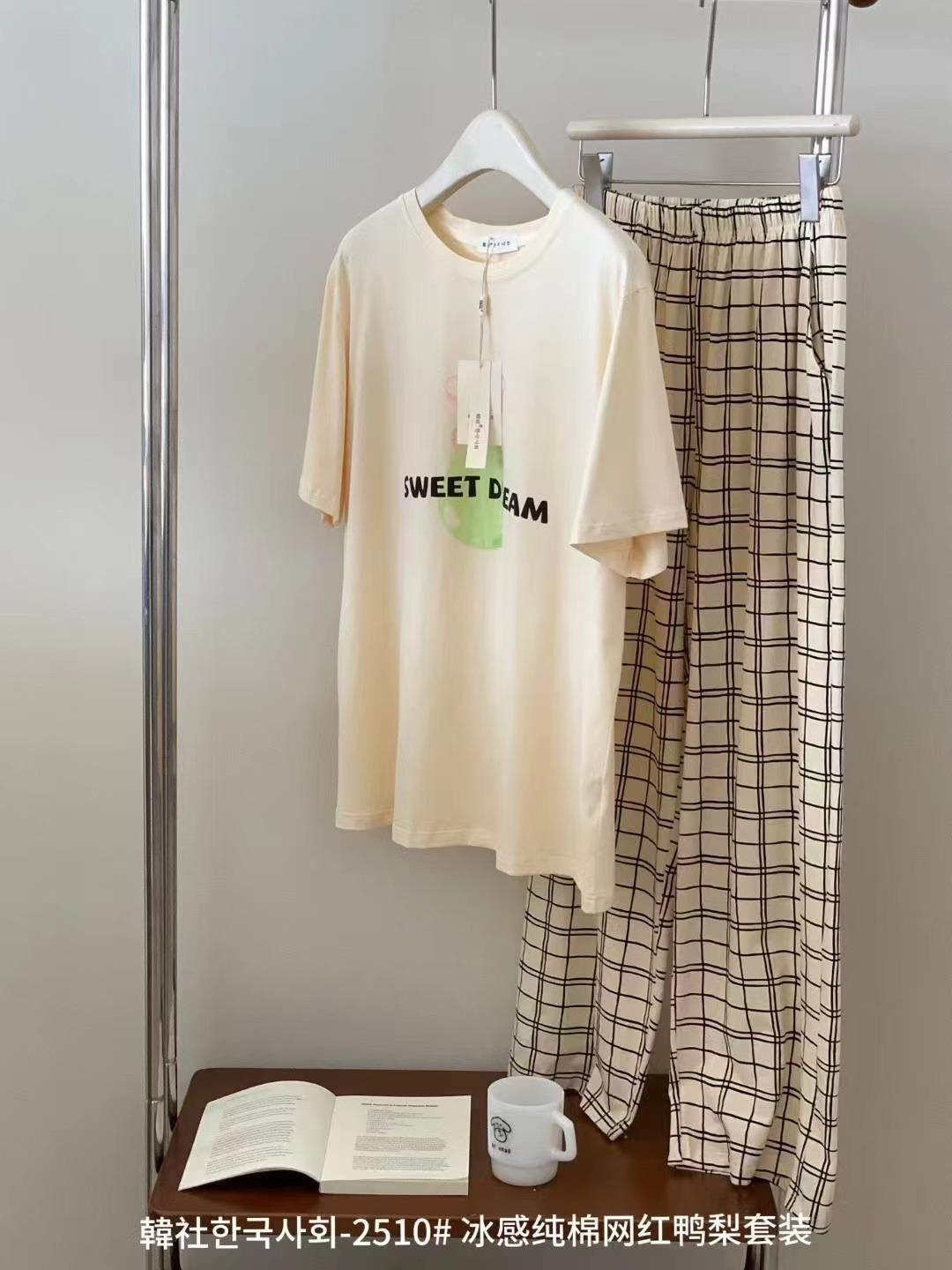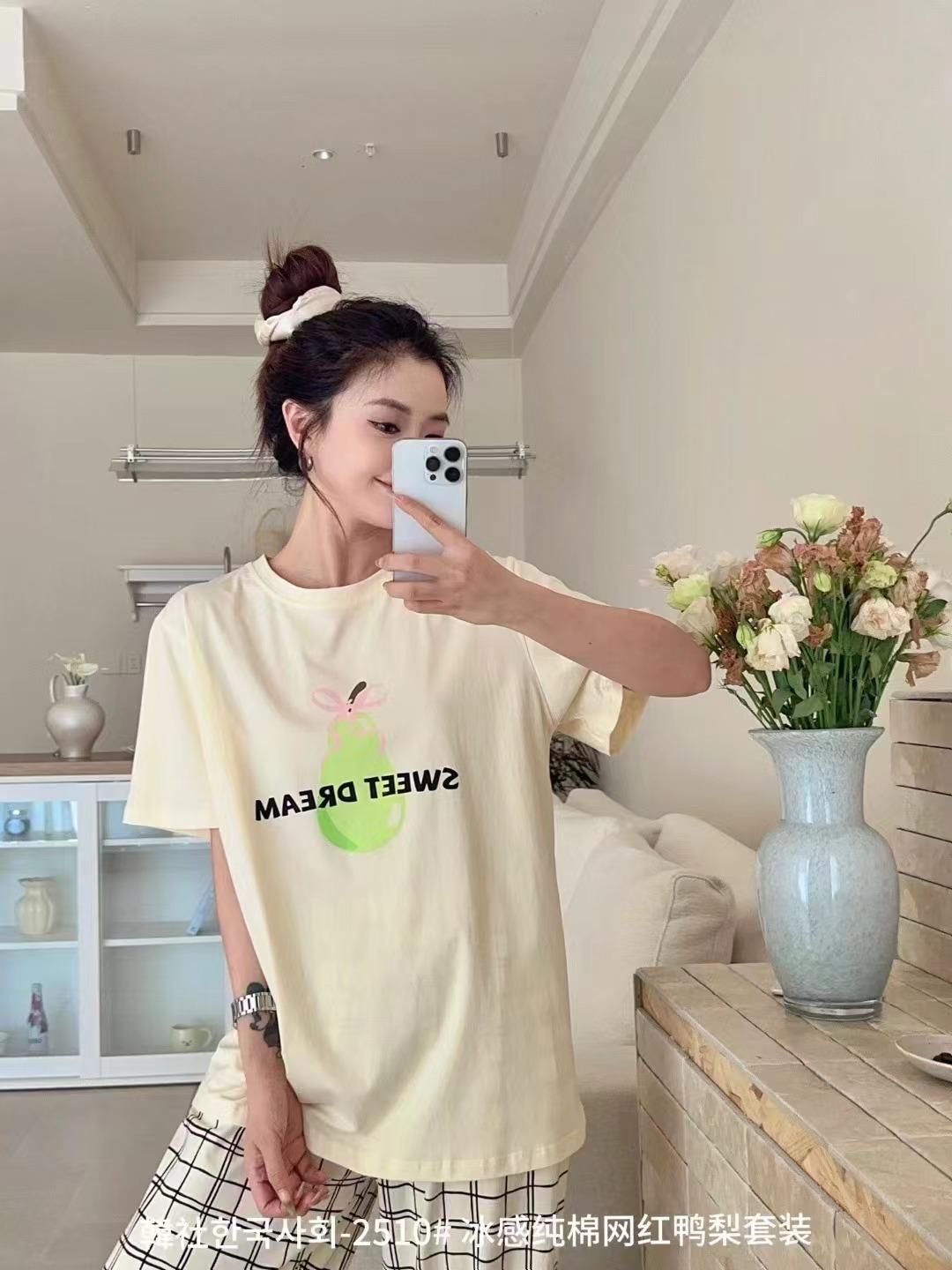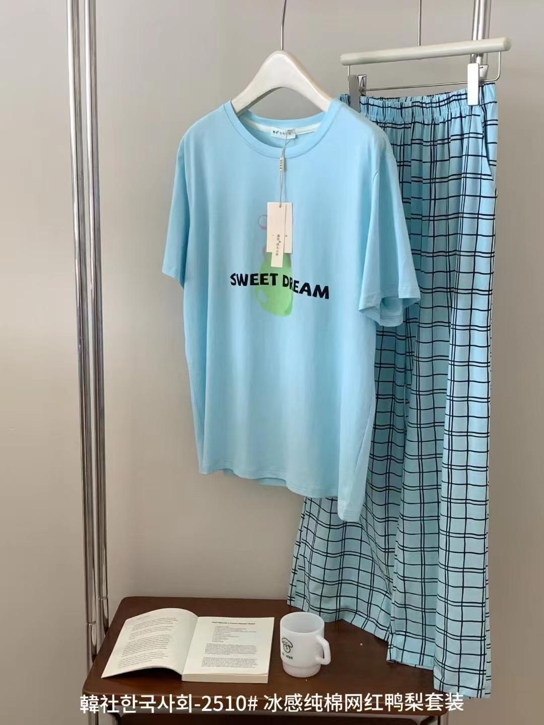 Compra 2510 Conjunto de Roupa de Casa de Algodão Puro com Sensação de Gelo Coreano para Celebridades da Internet Verão Feminino Xadrez Gola Redonda Manga Curta Pijama Transfronteiriço al por mayor en Joom.pro