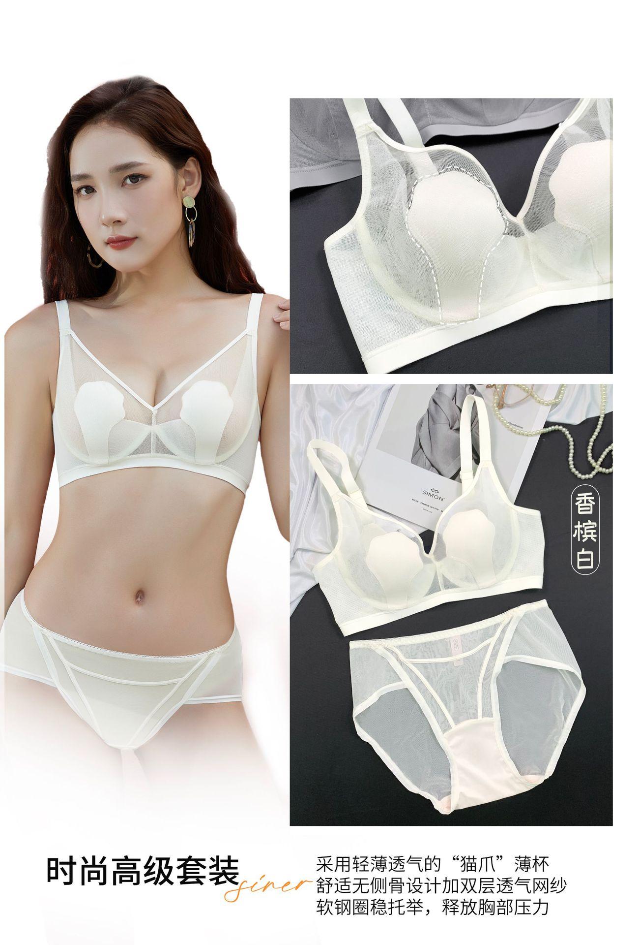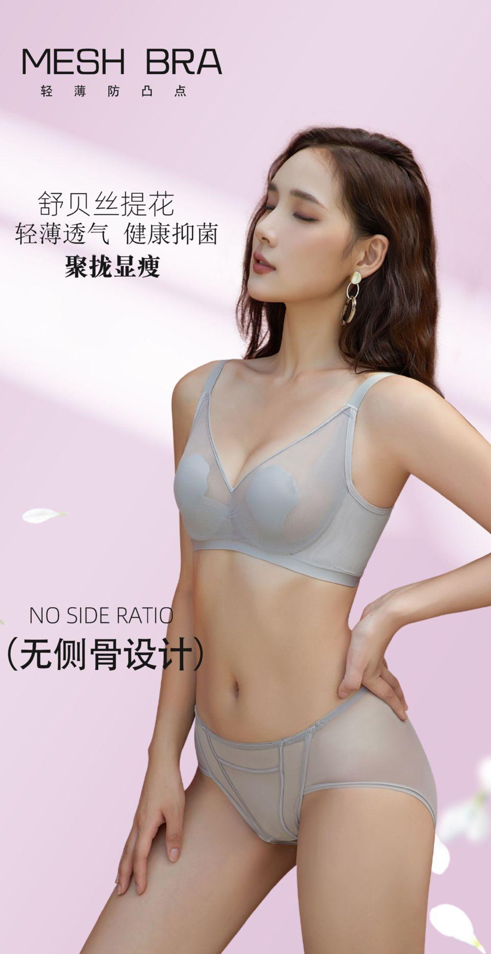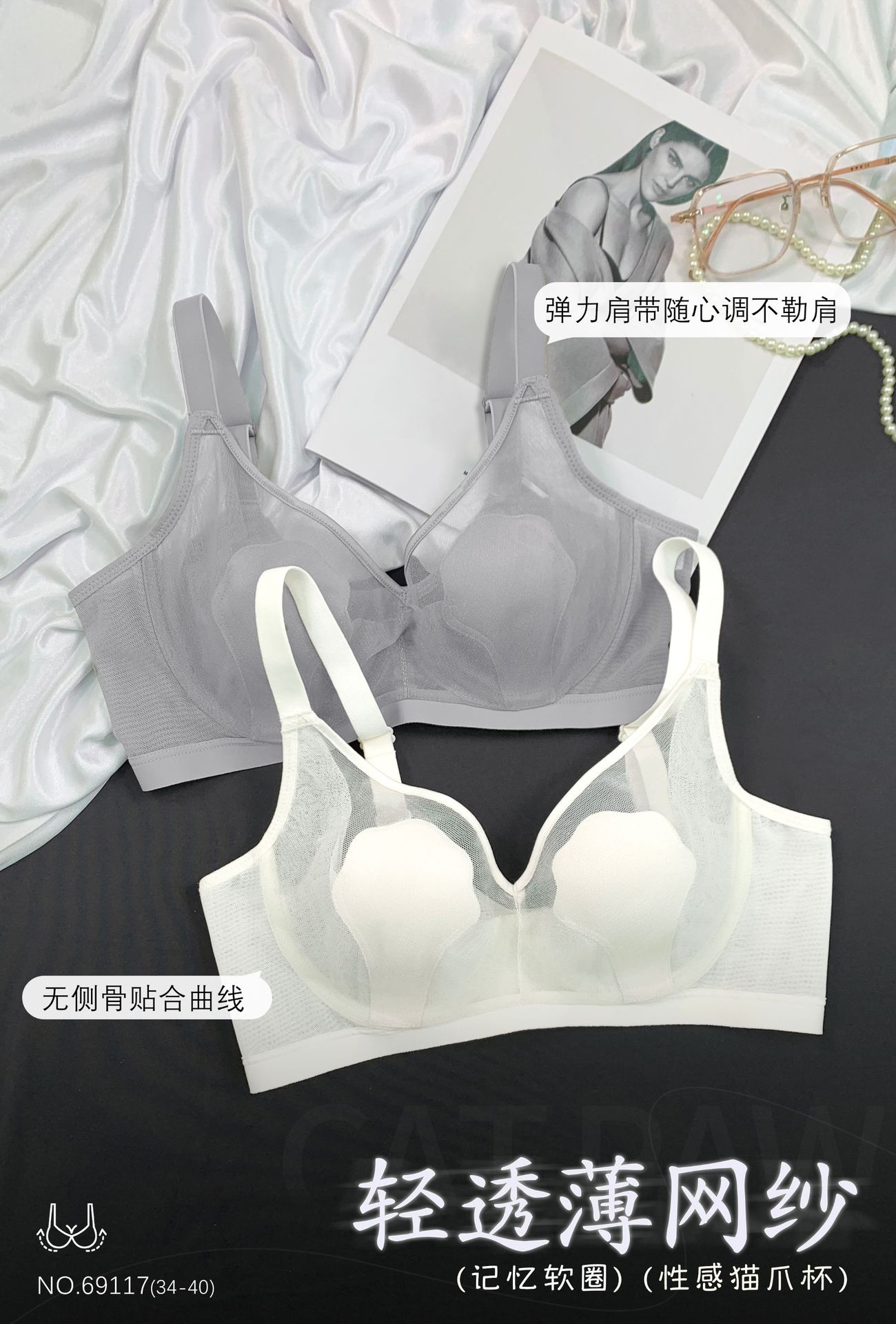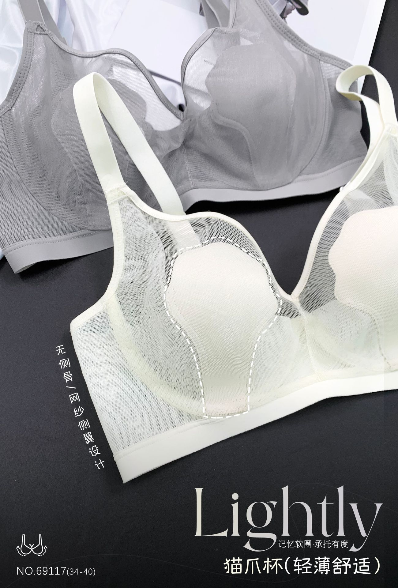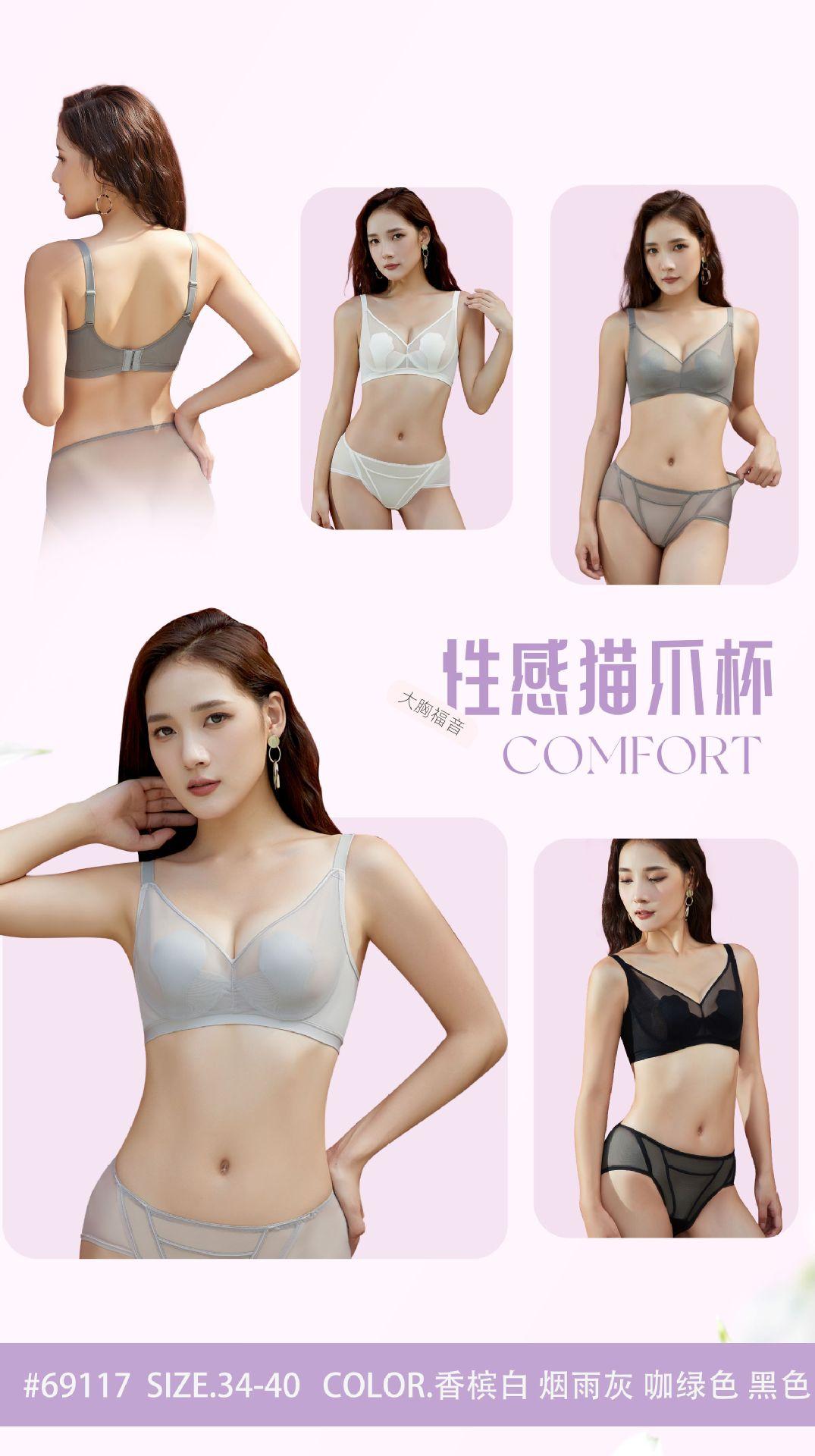 69117 Encaje Fino Malla Push-Up Adelgazante Aro de Acero Suave Copa Garra de Gato Íntimos Sujetador Ajustable Retractor de Senos para Mujer