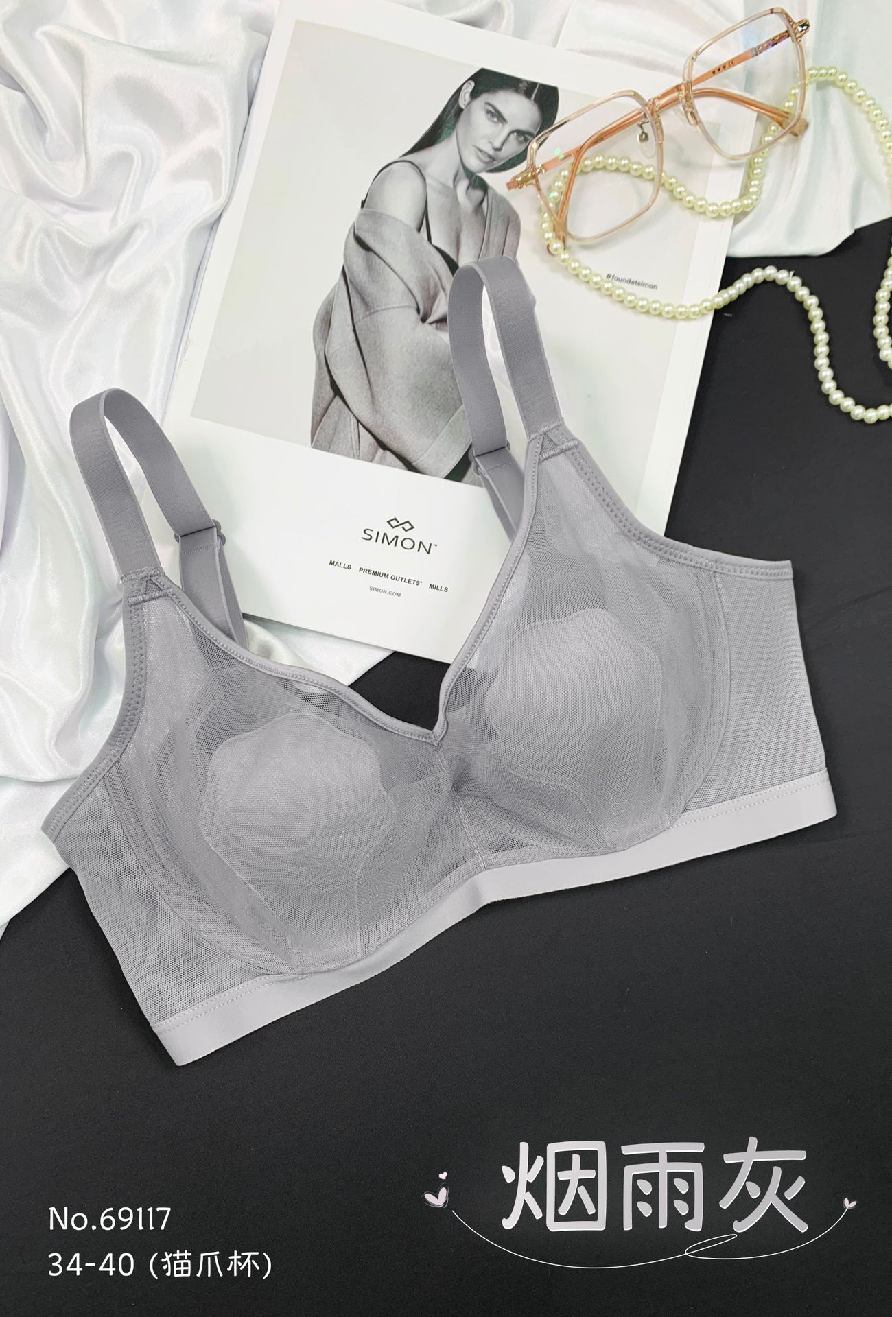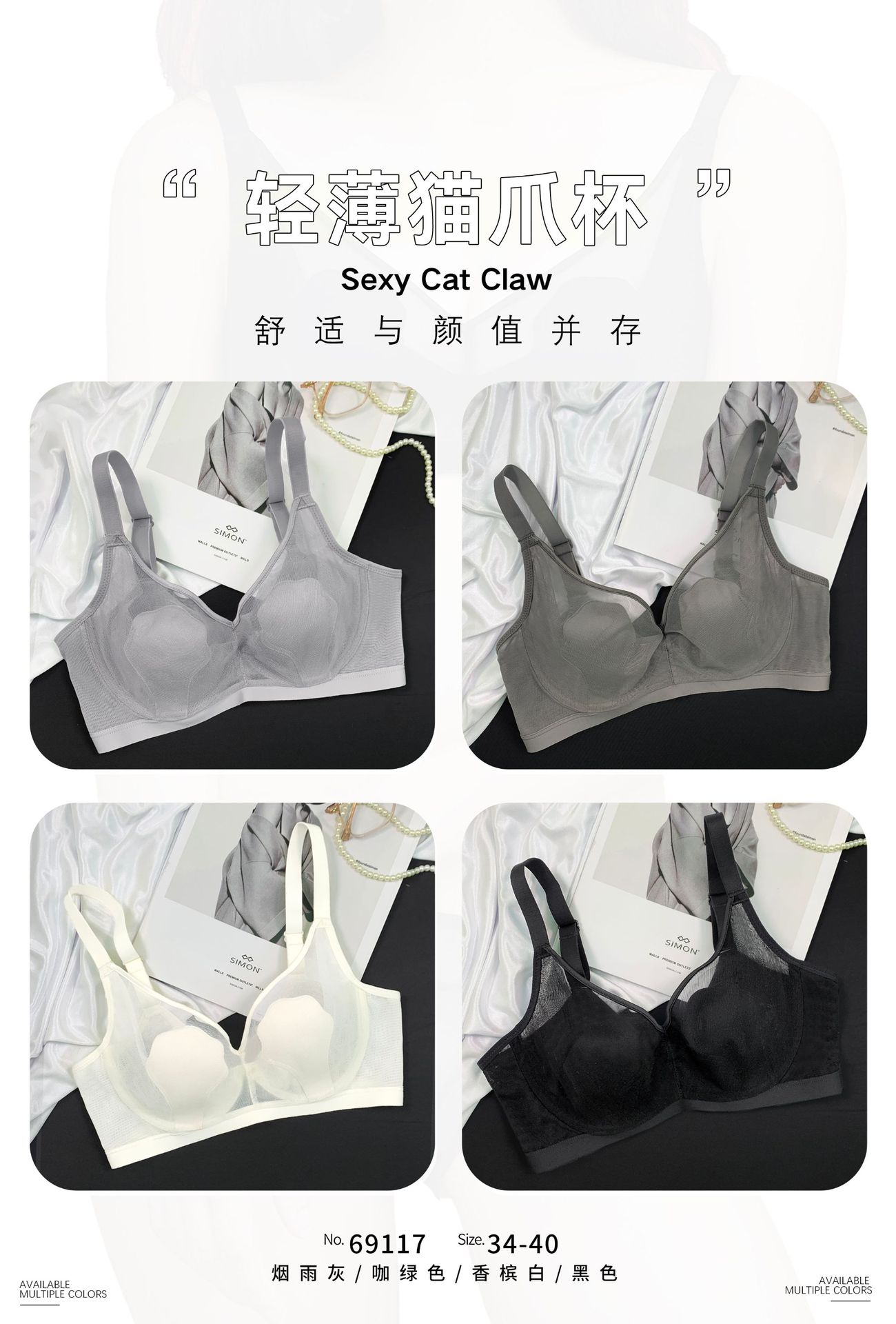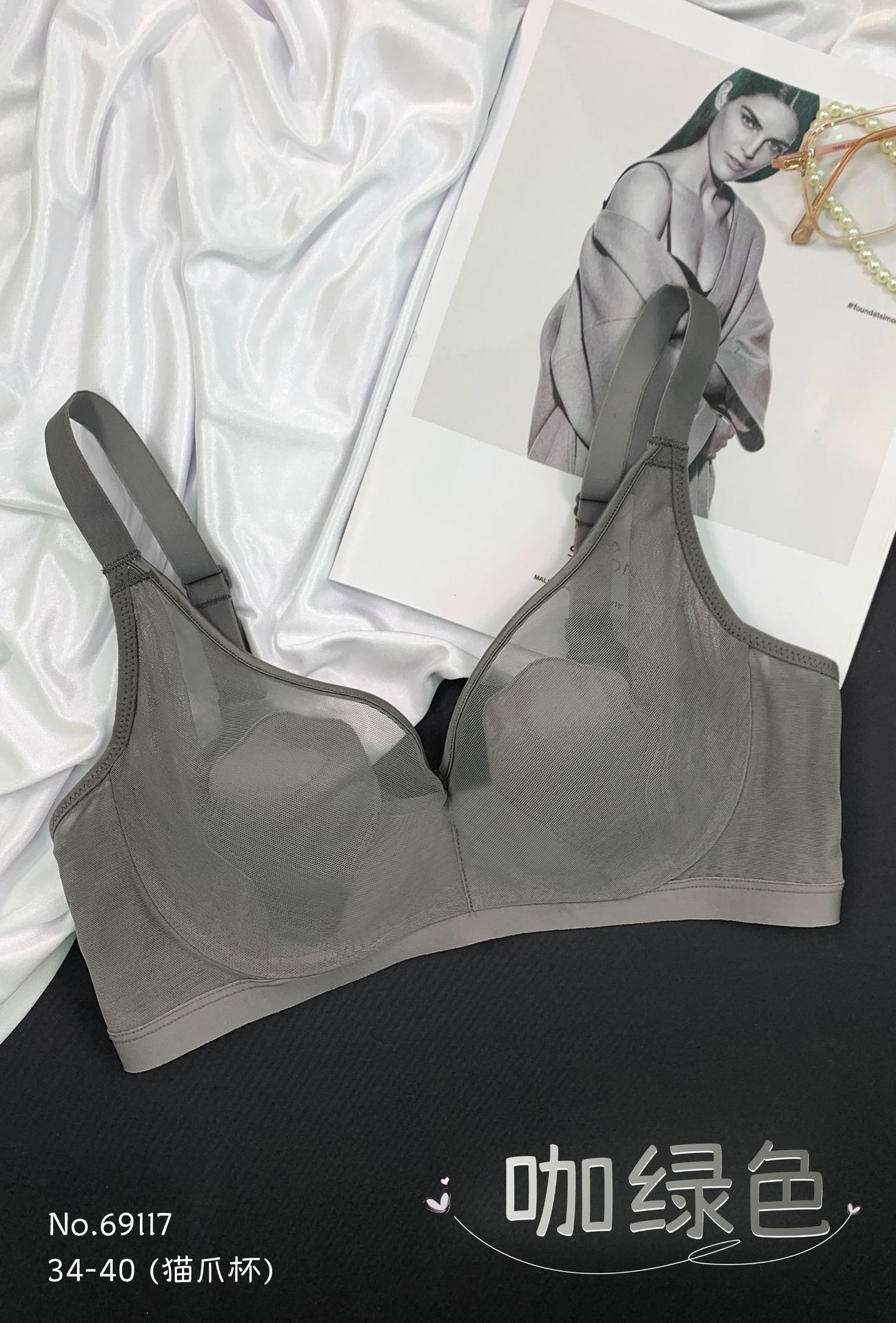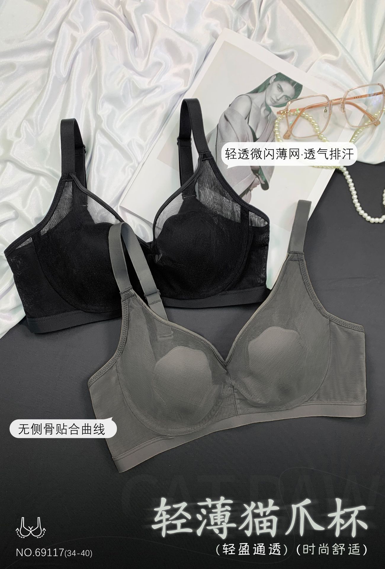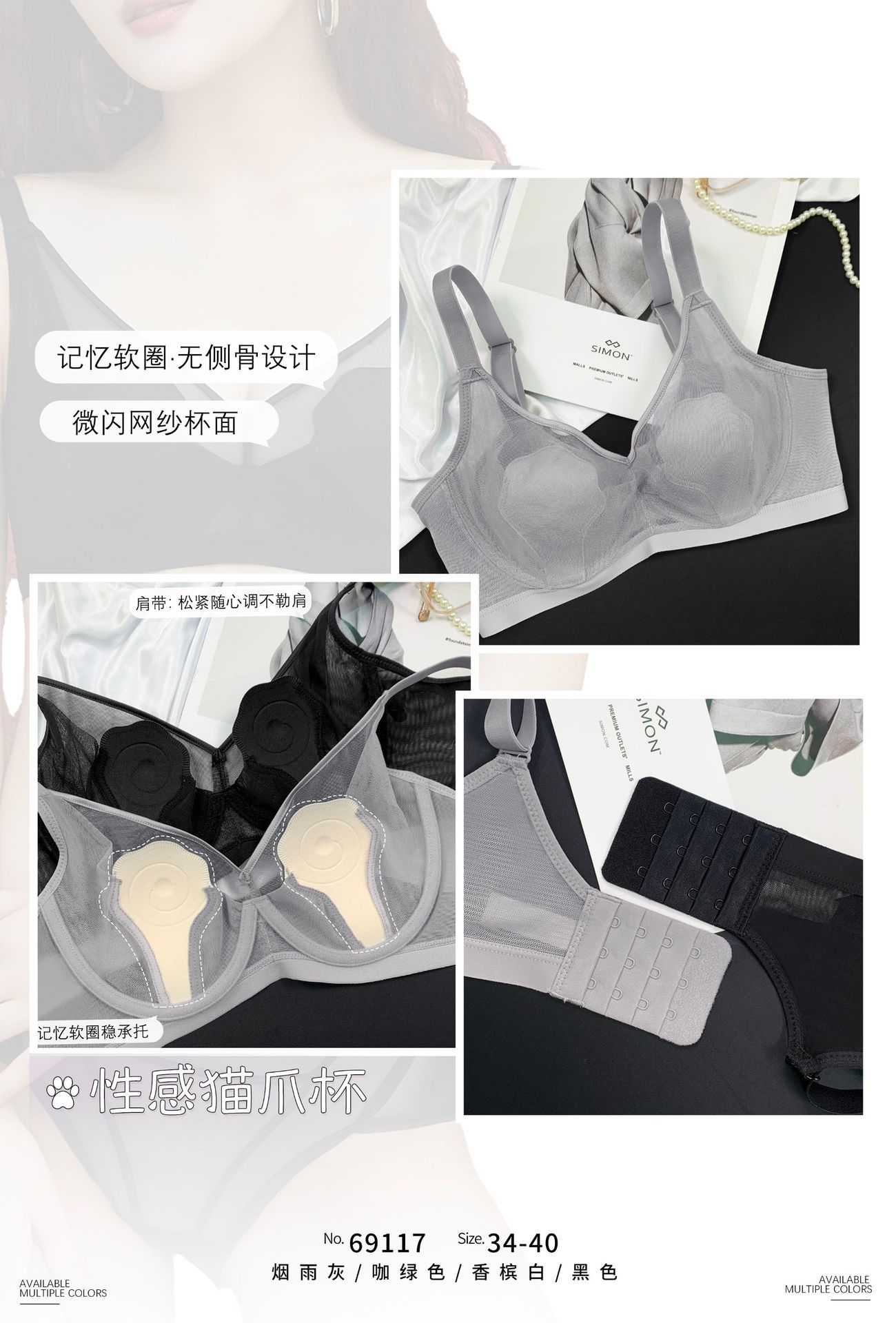 69117 Encaje Fino Malla Push-Up Adelgazante Aro de Acero Suave Copa Garra de Gato Íntimos Sujetador Ajustable Retractor de Senos para Mujer