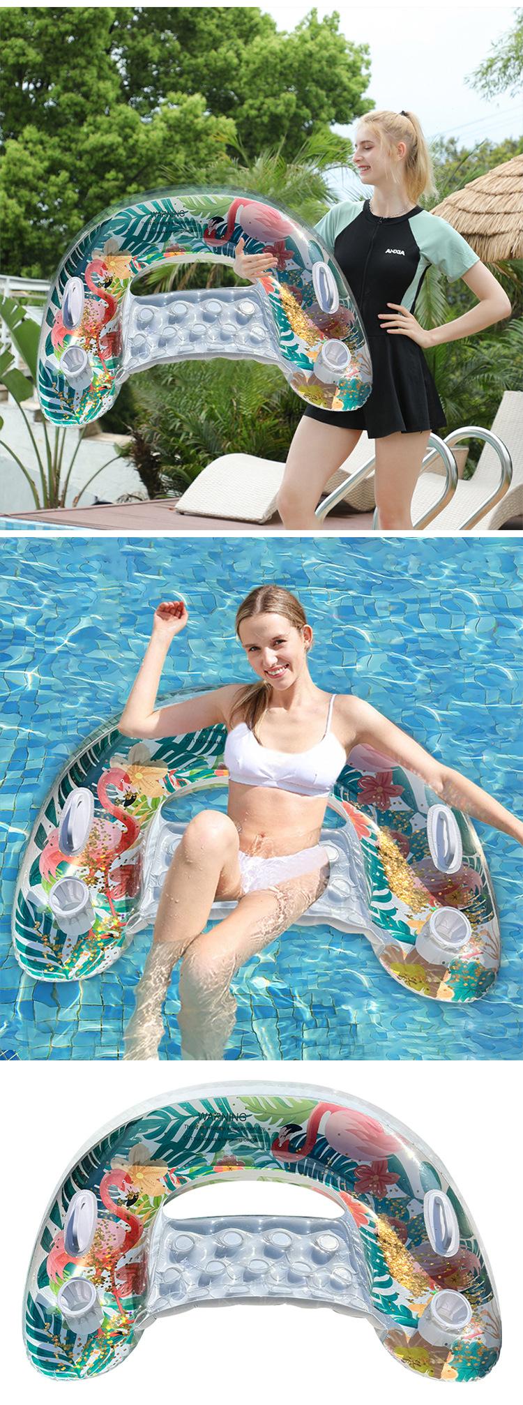 Flamenco de Lentejuelas en Forma de U con Respaldo Portavasos Sillón Reclinable Inflable Portátil PVC Engrosado Agua Inflable Fila Flotante