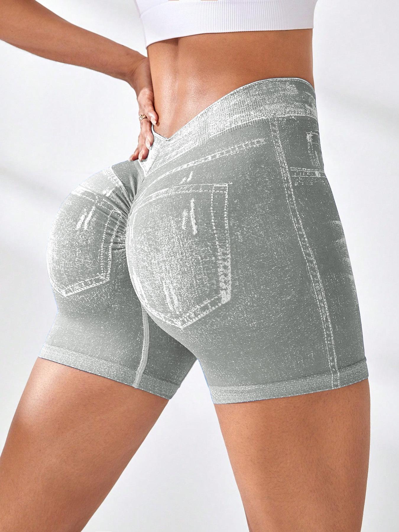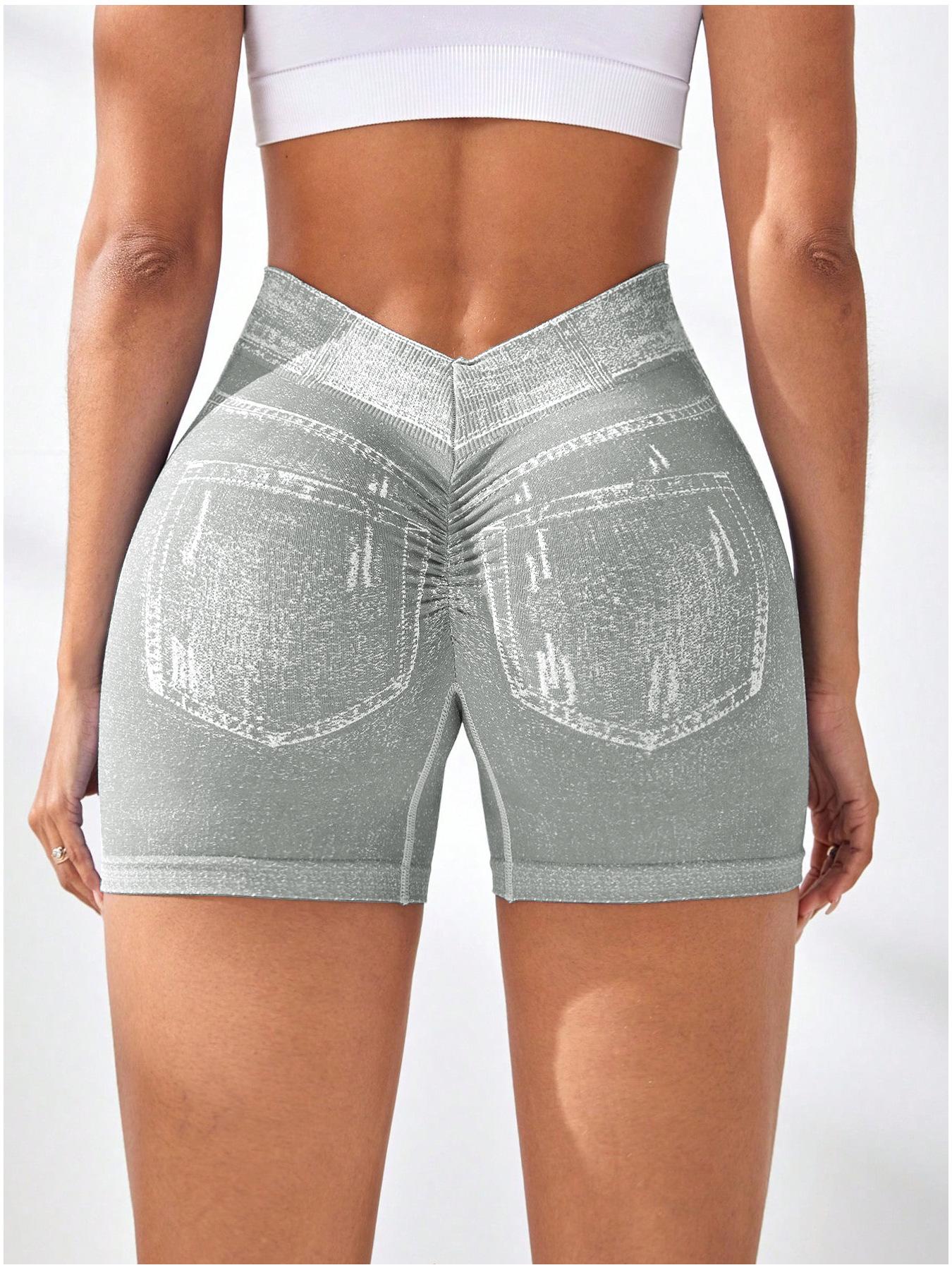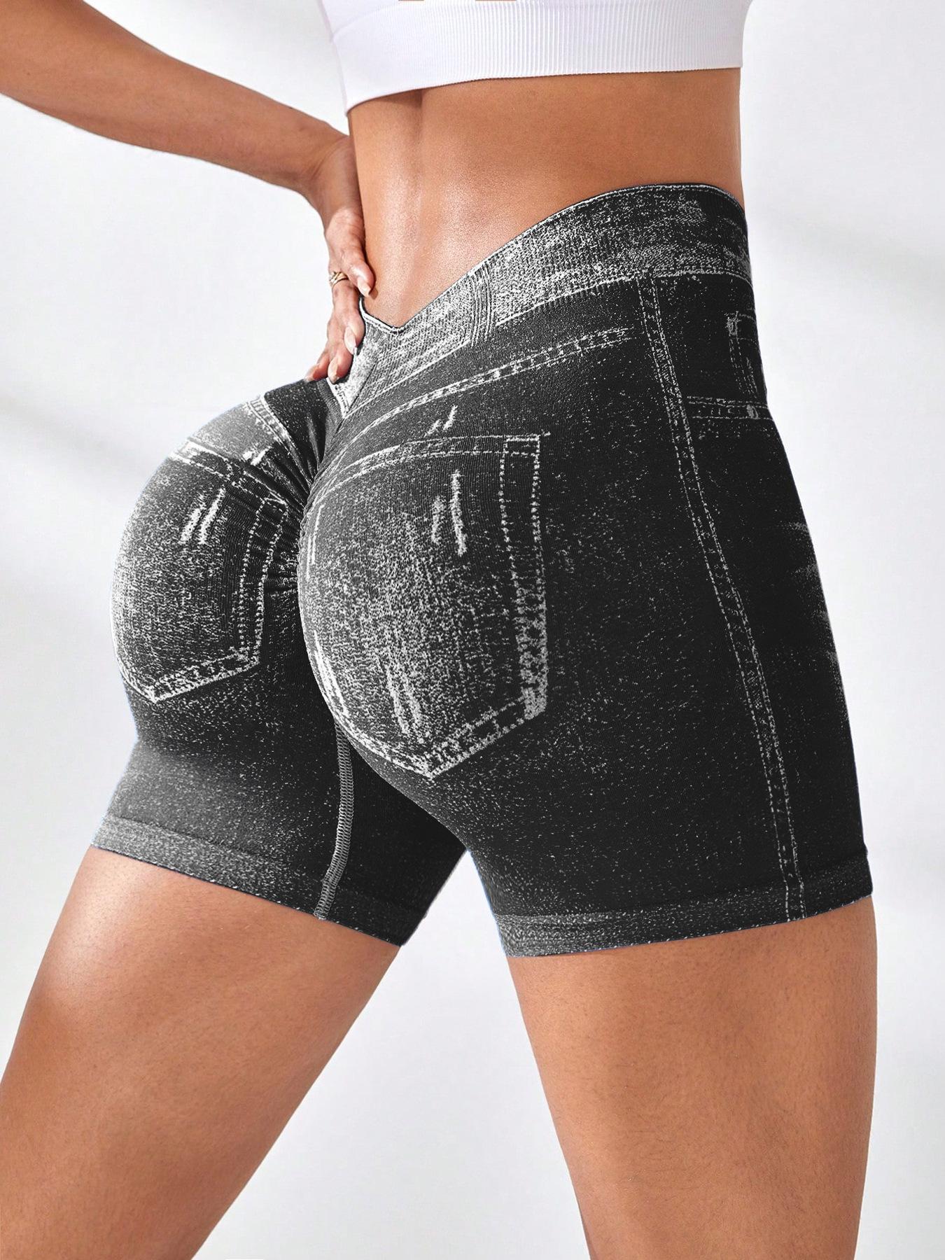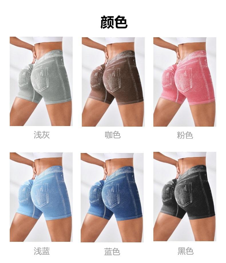 Shorts de Yoga Seamless de Imitación Denim Europeos y Americanos para Mujer, Cintura en V, Levanta Glúteos, Secado Rápido, Ajustados para Correr Deportes Fitness