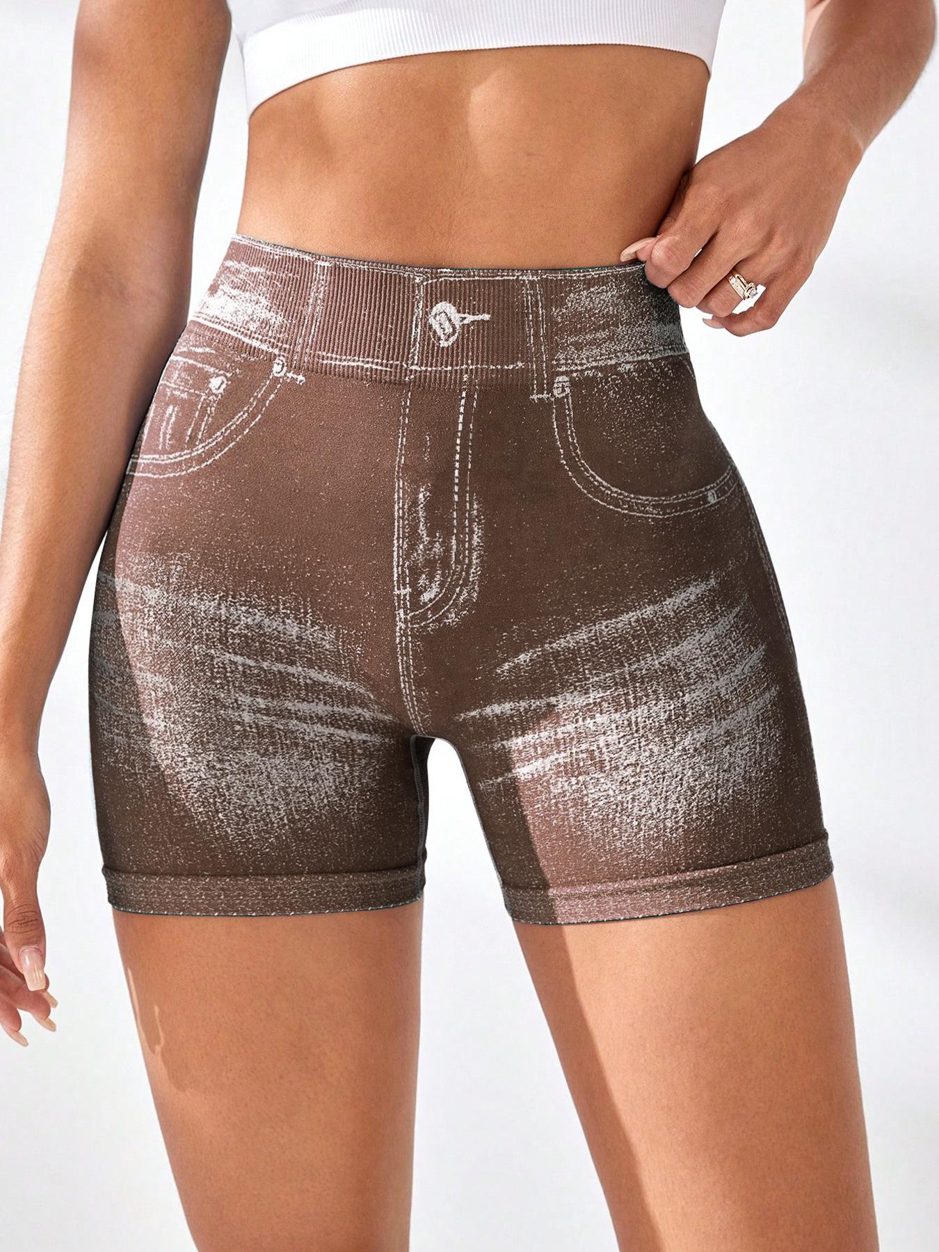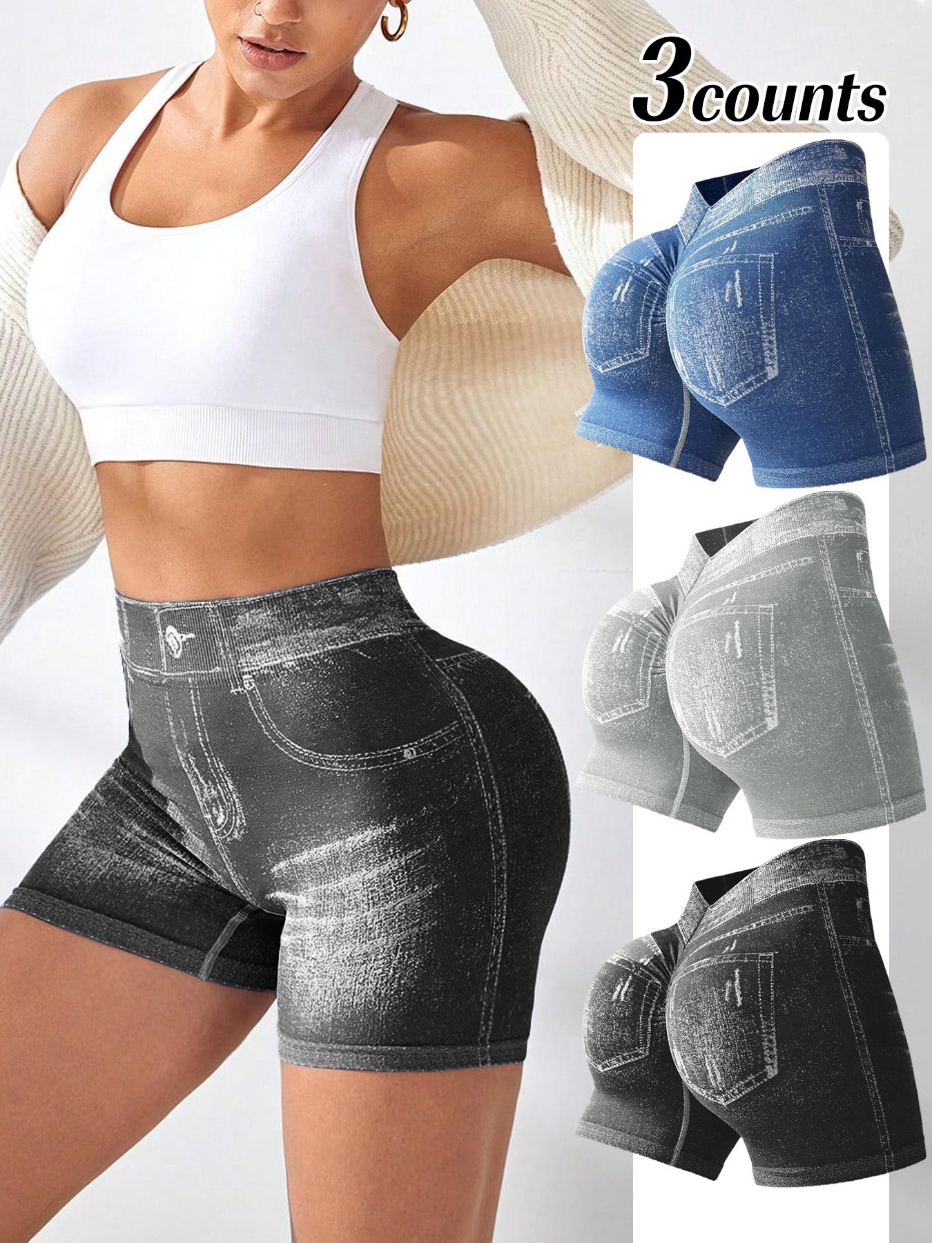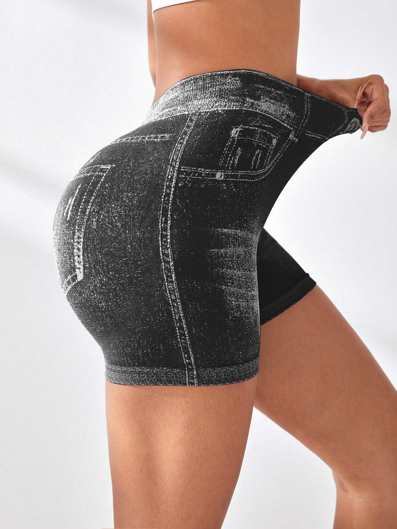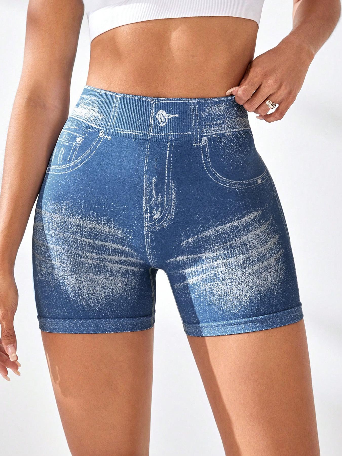 Shorts de Yoga Seamless de Imitación Denim Europeos y Americanos para Mujer, Cintura en V, Levanta Glúteos, Secado Rápido, Ajustados para Correr Deportes Fitness