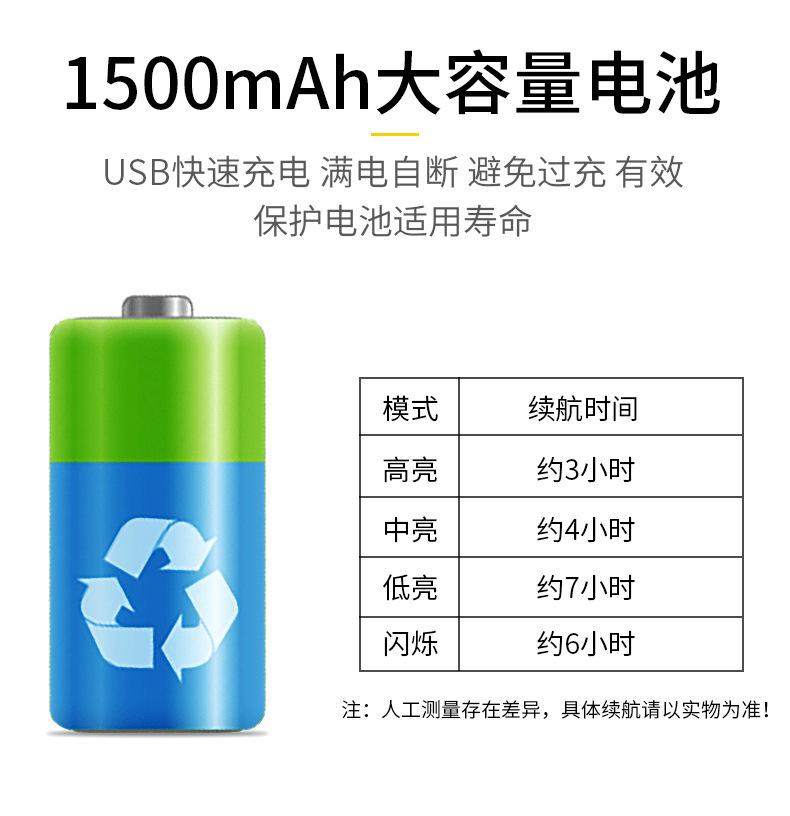 Duración de la batería: 3 horas a brillo máximo, 4 horas a medio brillo, 7 horas a brillo bajo, 6 horas en modo intermitente