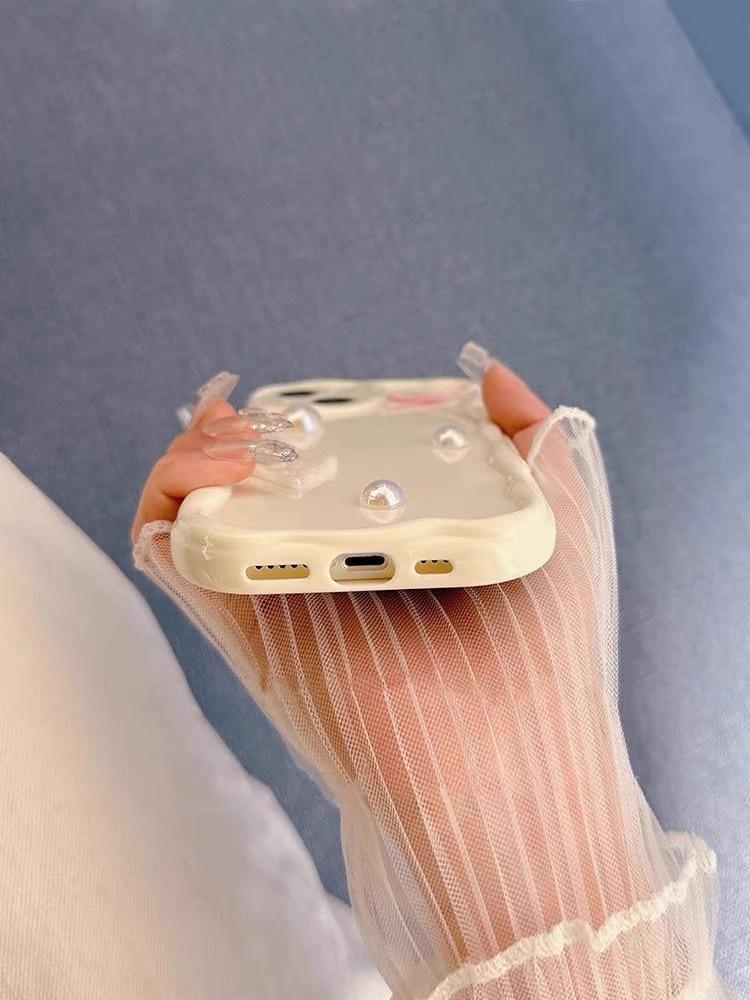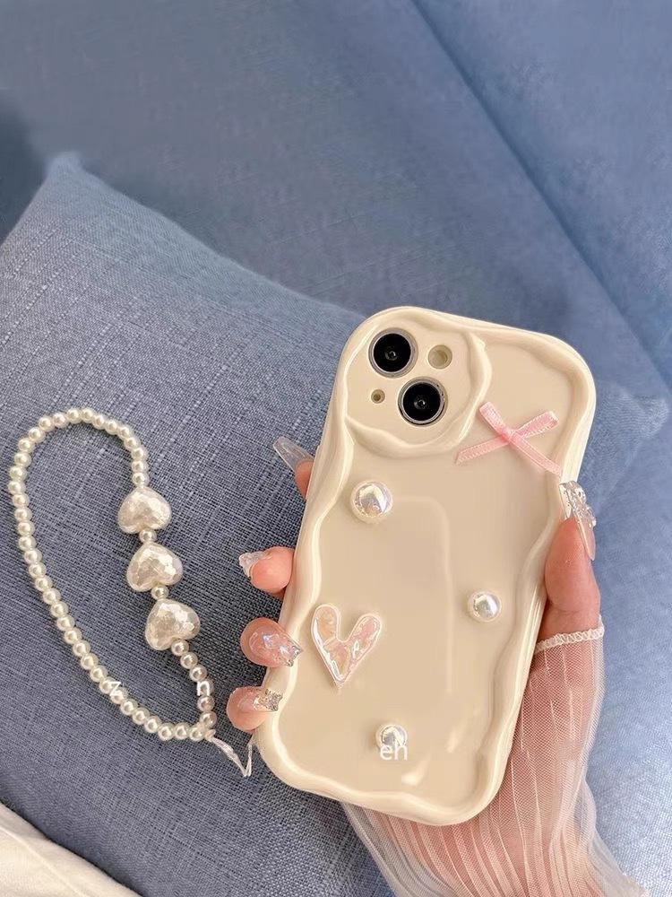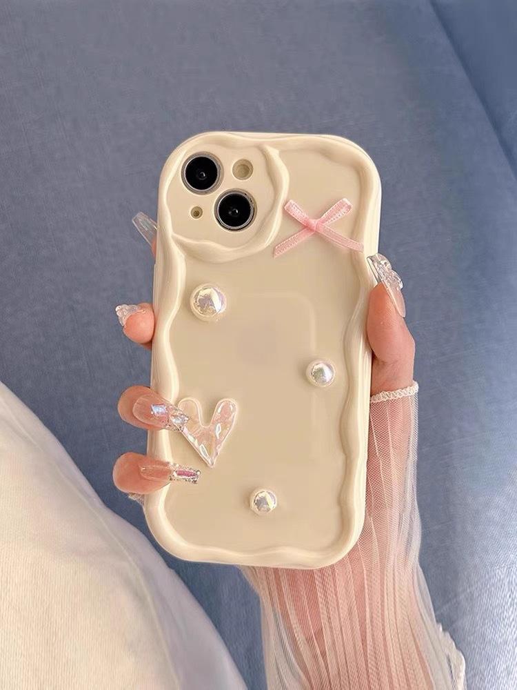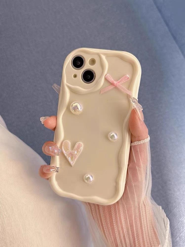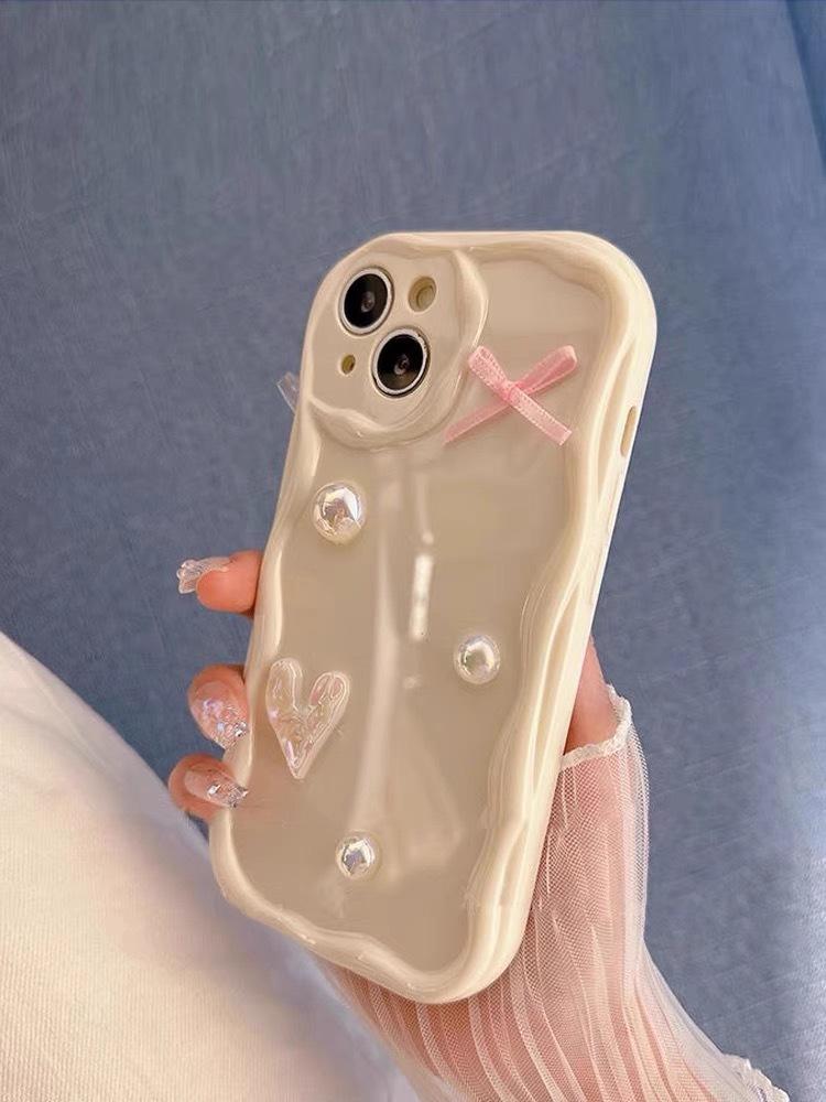 Patrón de Crema Blanca Estéreo Corazón Lazo Adecuado para Iphone14Promax Apple 13 Funda para Teléfono Móvil 11 Funda Blanda