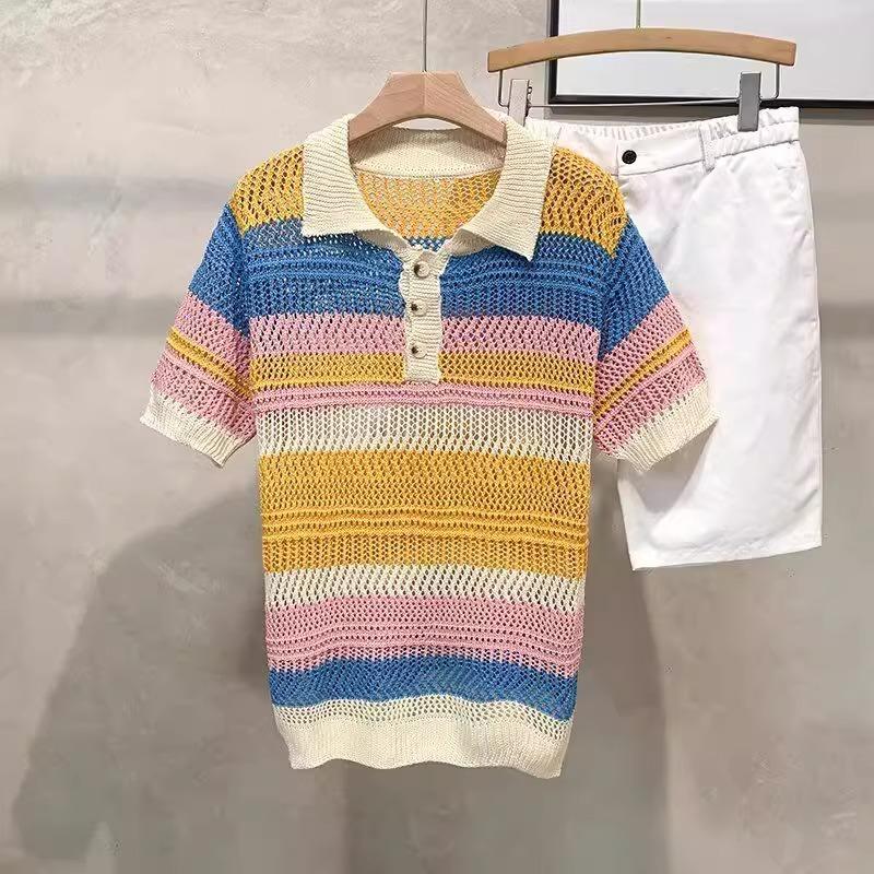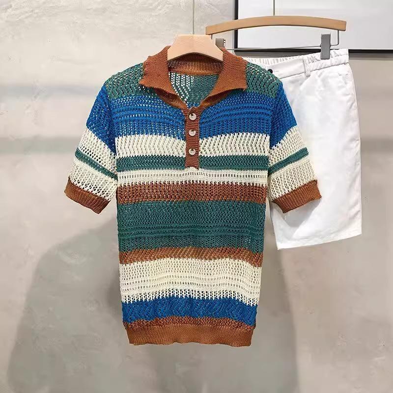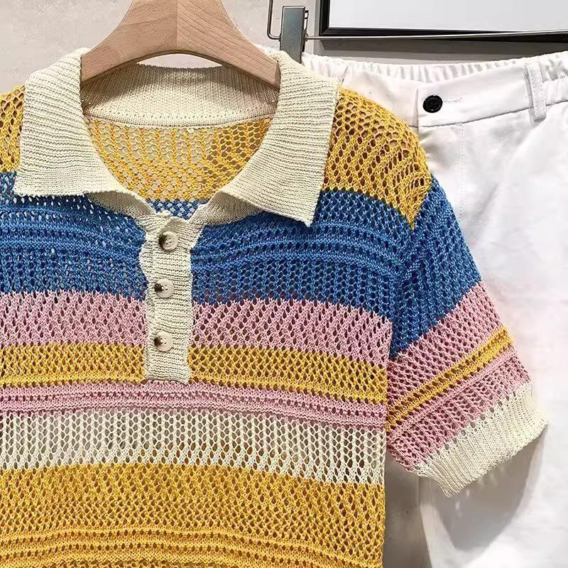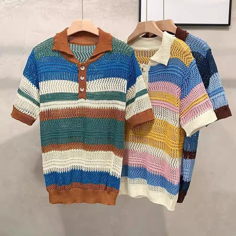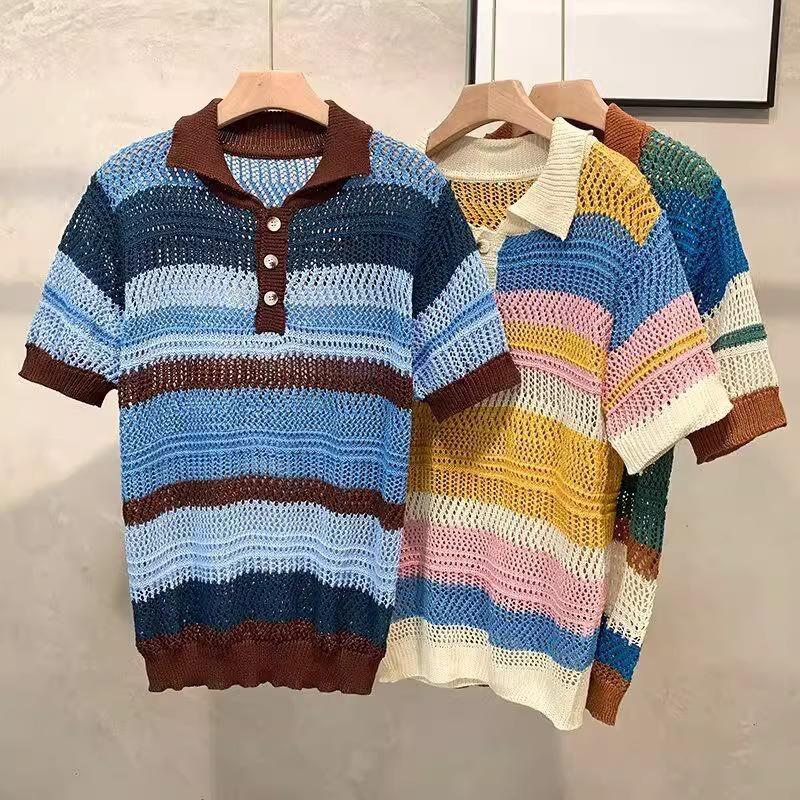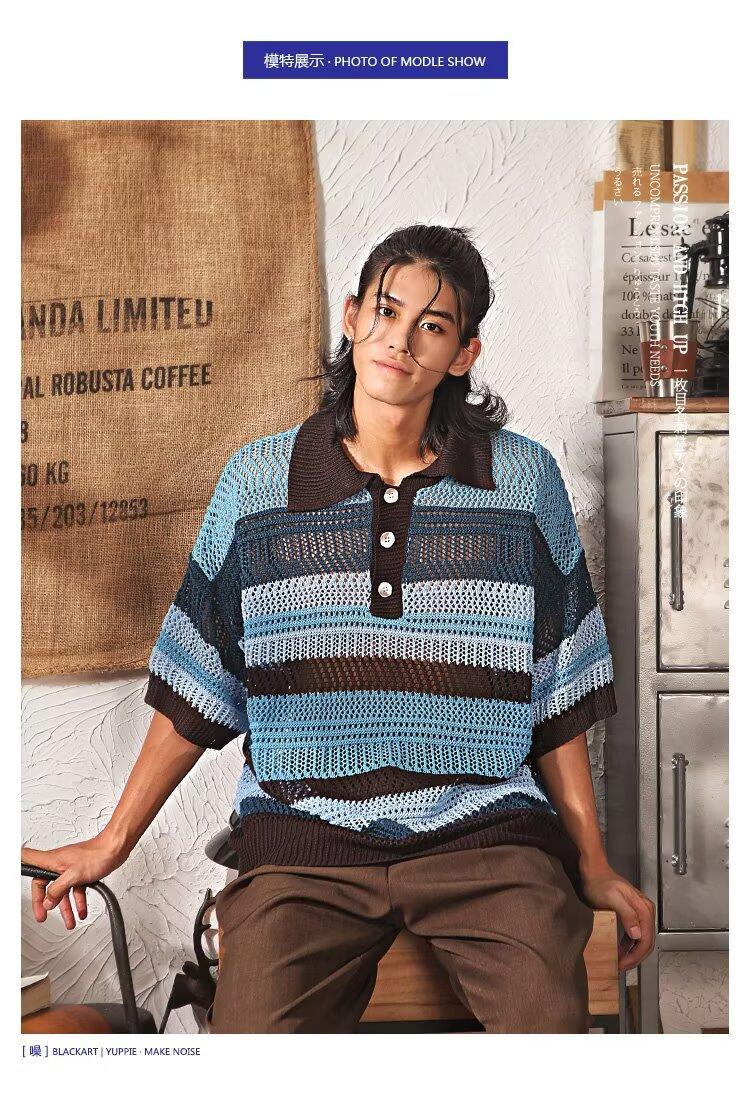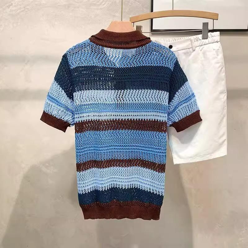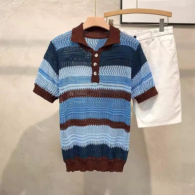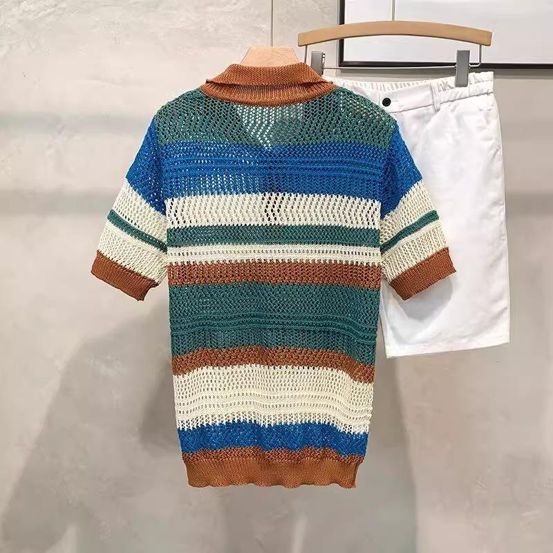 Verano nuevo suéter de manga corta para hombre calado a rayas retro camisa POLO negocios marea alta comercio exterior transfronterizo al por mayor