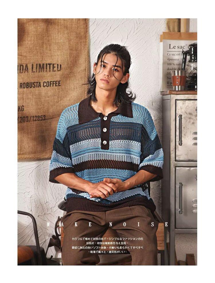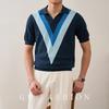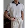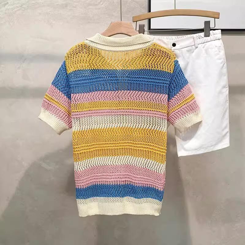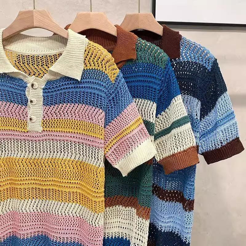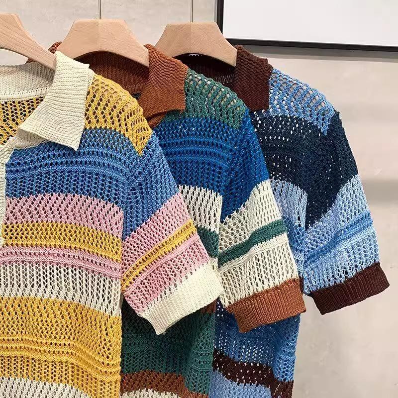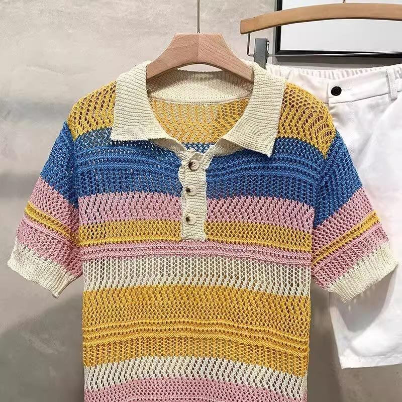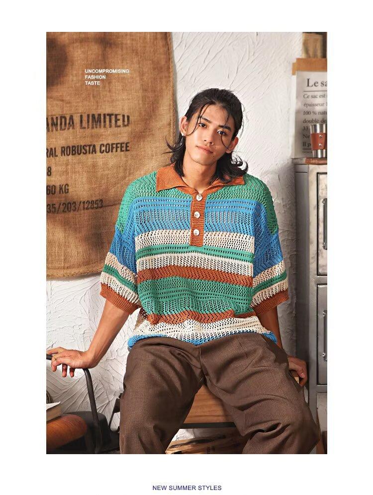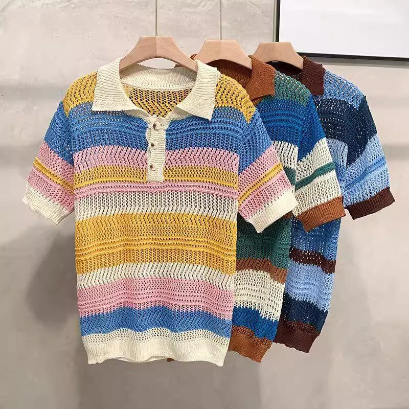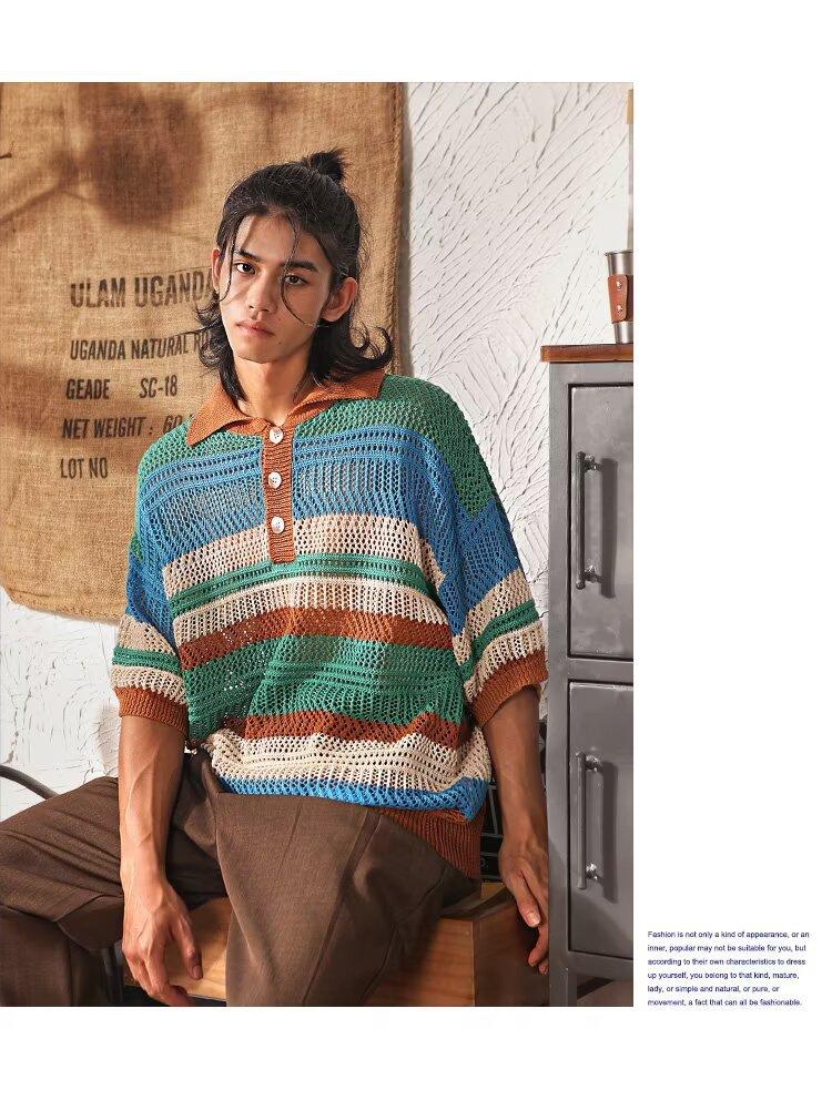 Verano nuevo suéter de manga corta para hombre calado a rayas retro camisa POLO negocios marea alta comercio exterior transfronterizo al por mayor