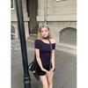 Camiseta de Manga Corta con Hombro Caído Diseñada para Mujer 2025 Verano Nuevo Estilo Chic Ajustada Fuera del Hombro Top Corto